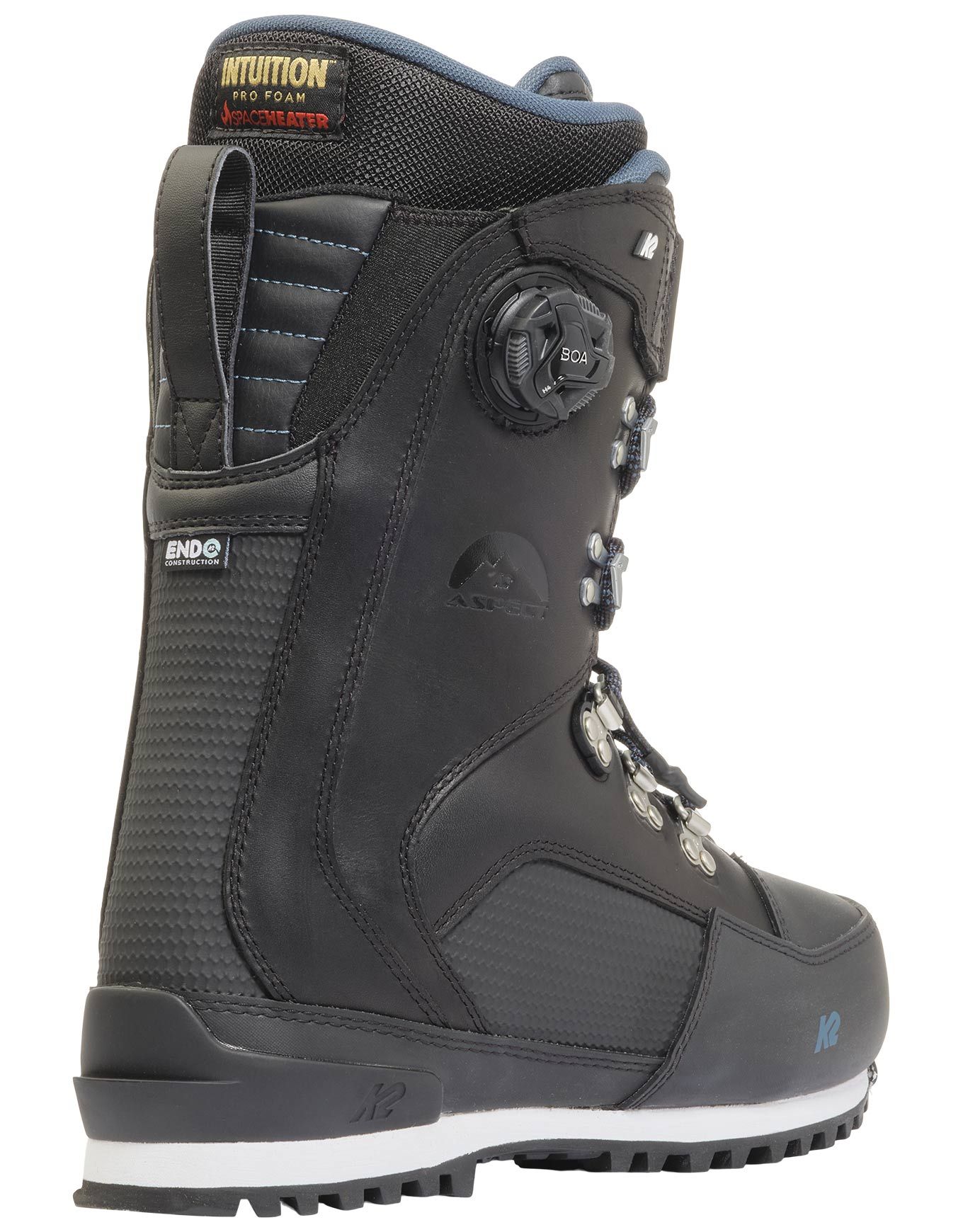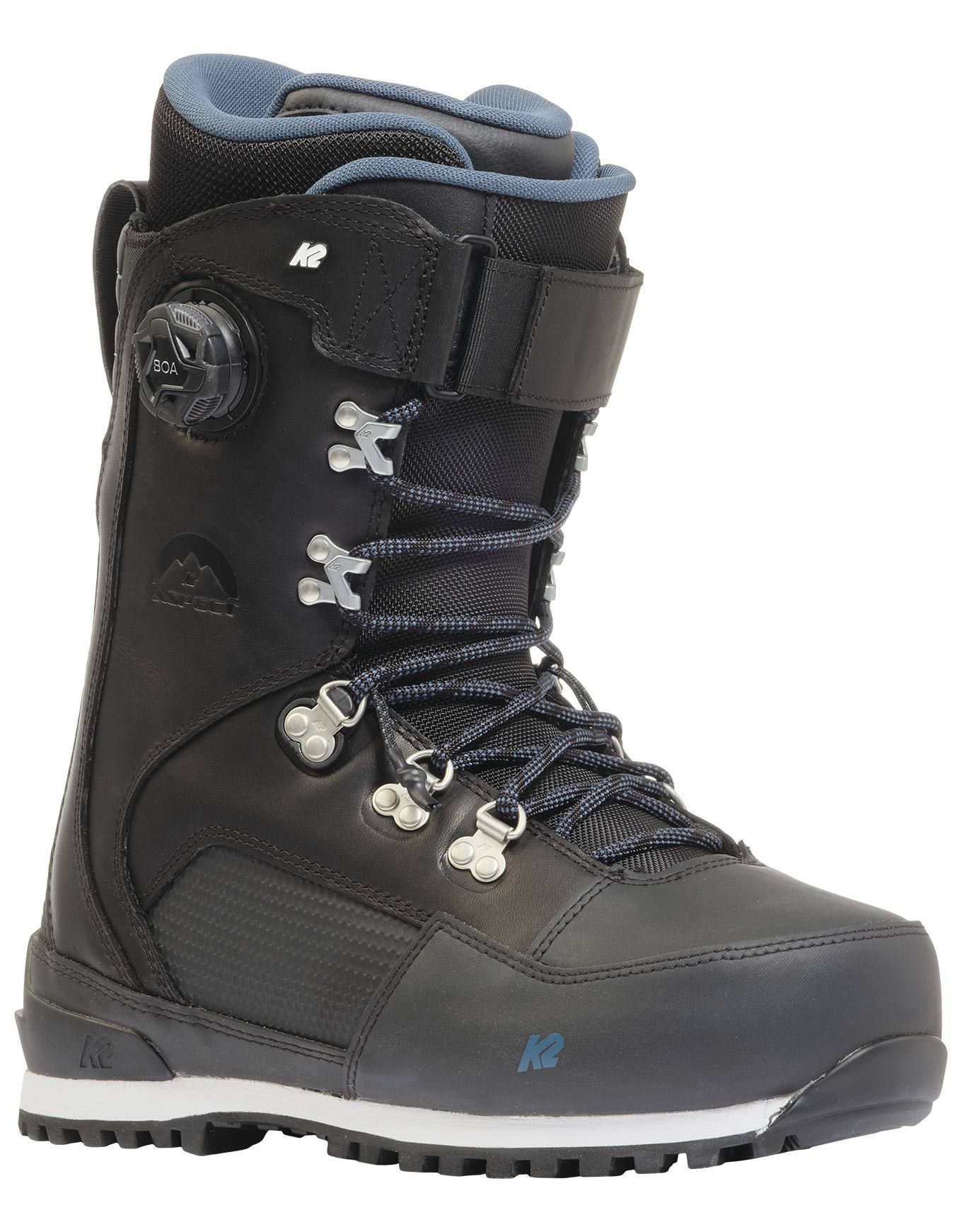 Boots de snowboard homme K2 Aspect : freeride polyvalent avec flex moyen, laçage hybride Fast-In + Boa, chausson Intuition Control Foam 3D, collier articulé et semelle Vibram pour confort, précision et accroche.