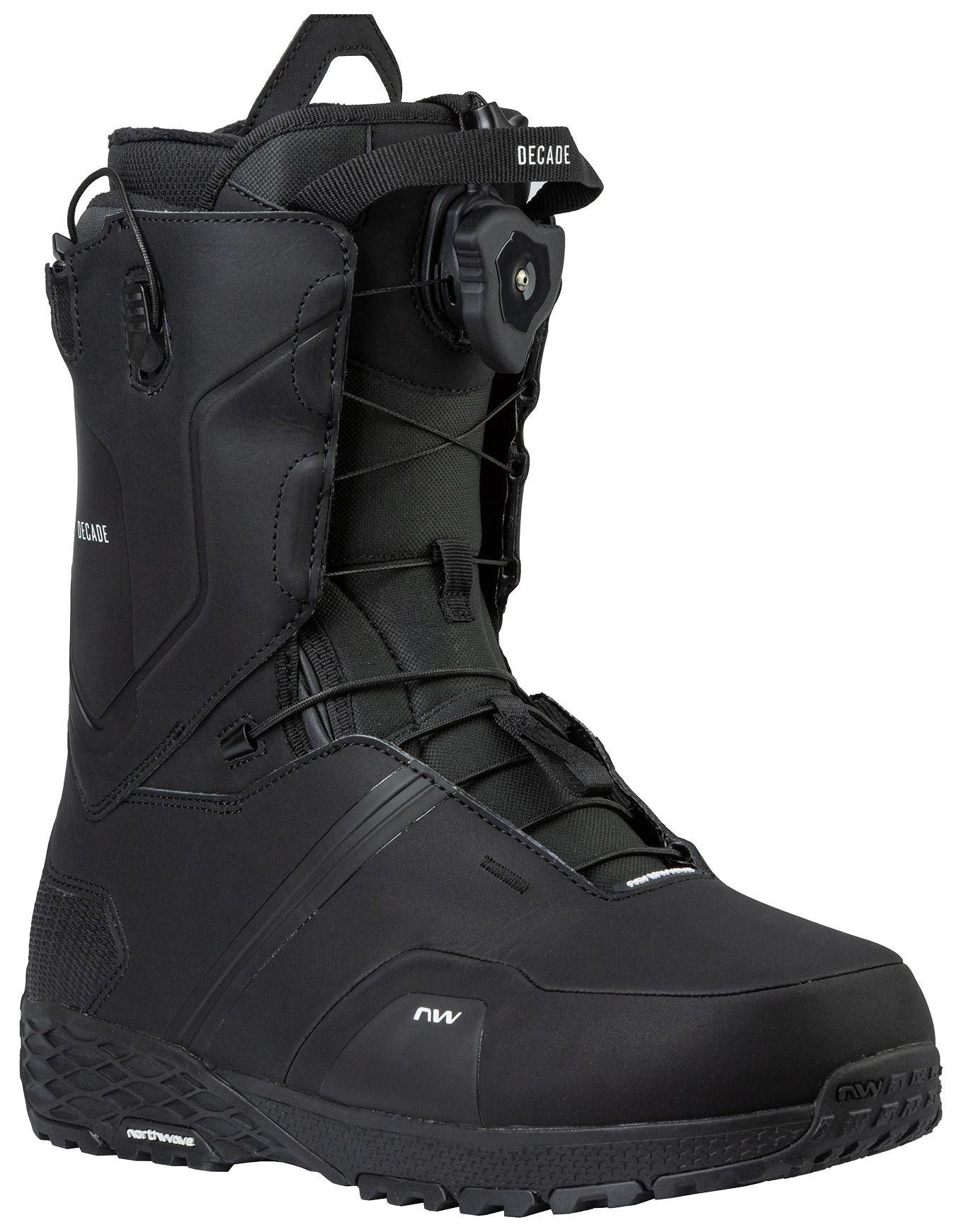 Boot de snowboard all-mountain Northwave Decade Hybrid Black pour homme, associant maintien talon sécurisé, laçage hybride ultra-rapide et semelle Stomper pour amorti et adhérence.