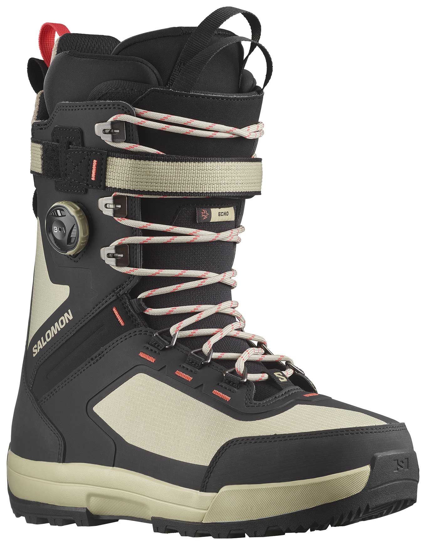 Boot de snowboard all-mountain homme Salomon Echo Lace Sj Boa : construction Fit to Ride allégée, semelle Contagrip® 50 % caoutchouc naturel, chausson thermoformable Full Custom Fit et STR8JKT BOA® PRO pour maintien précis.