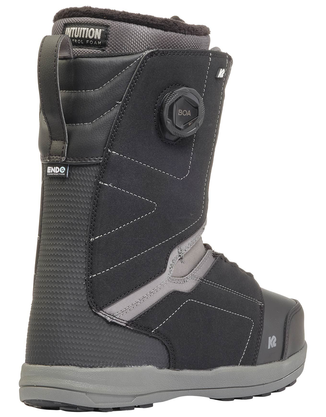 Boots de snowboard K2 Snowboard Hanford Wide Black, freeride homme intermédiaire, flex rigide 7/10, double Boa H4/M3, chausson Intuition Control Foam 3D, construction Endo 2.0 pour précision et maintien.