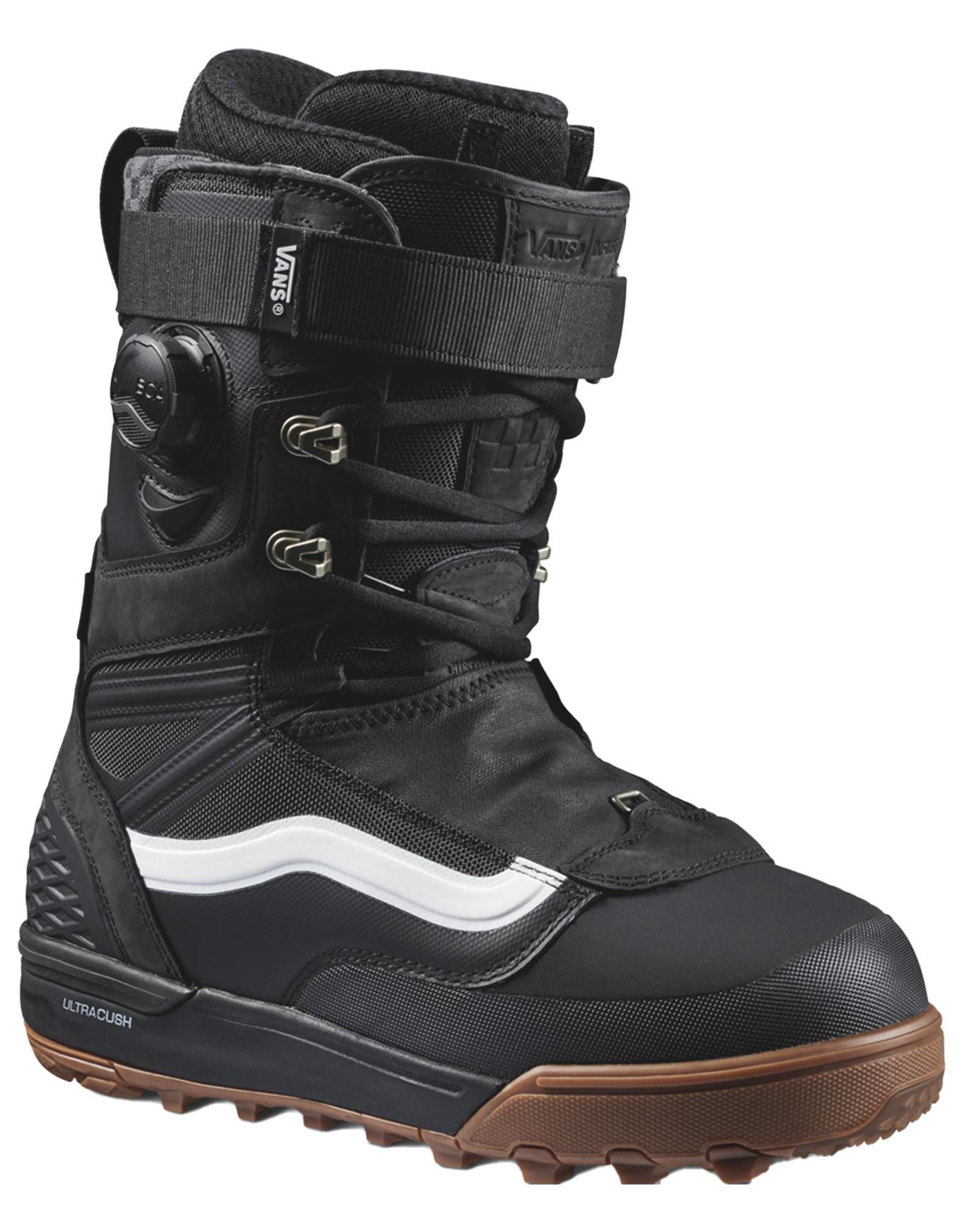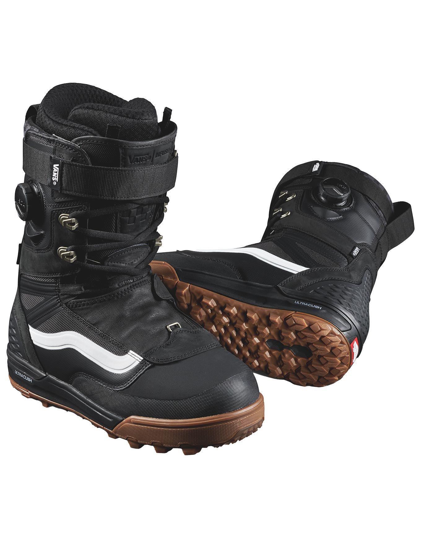 Boots de snowboard all-mountain Vans Infuse Black/White pour homme confirmé, serrage BOA® instantané, chausson thermoformable V3 UltraCush, semelle V3 Ultimate Waffle amortissante et accrocheuse.