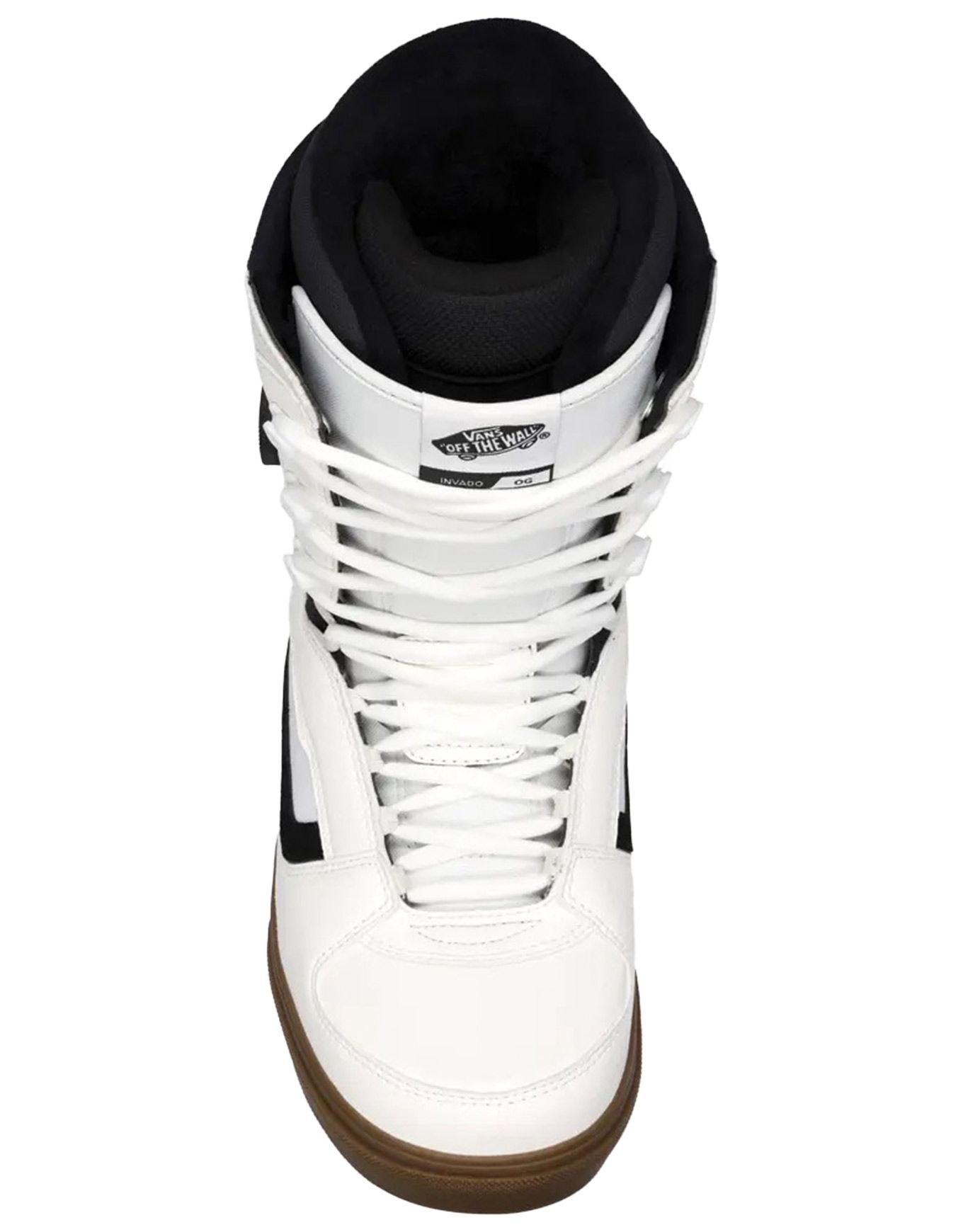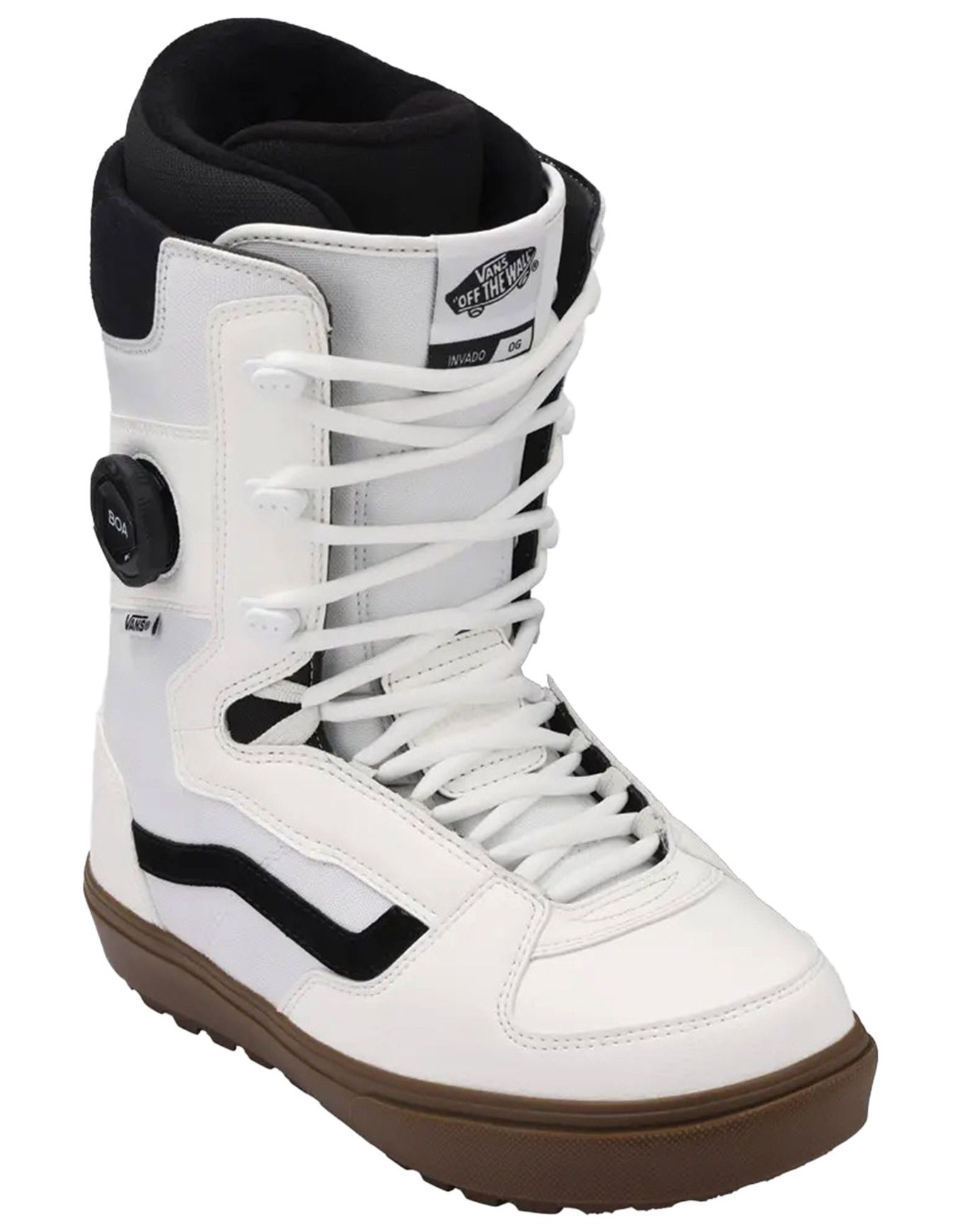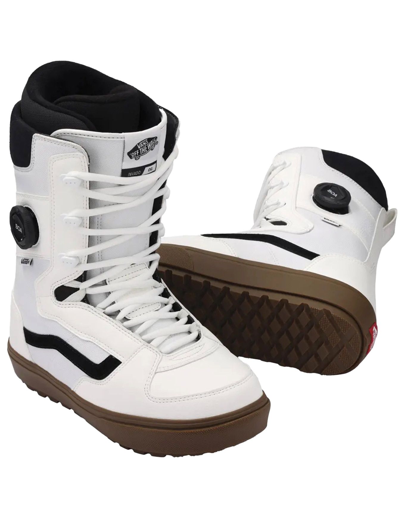 Boots de snowboard homme Vans Invado OG White/Gum niveau intermédiaire, laçage classique + BOA® pour un serrage ciblé, semelle Waffle inversée pour l’adhérence, amorti PopCush et doublure UltraCush pour confort et maintien sur toute la journée.