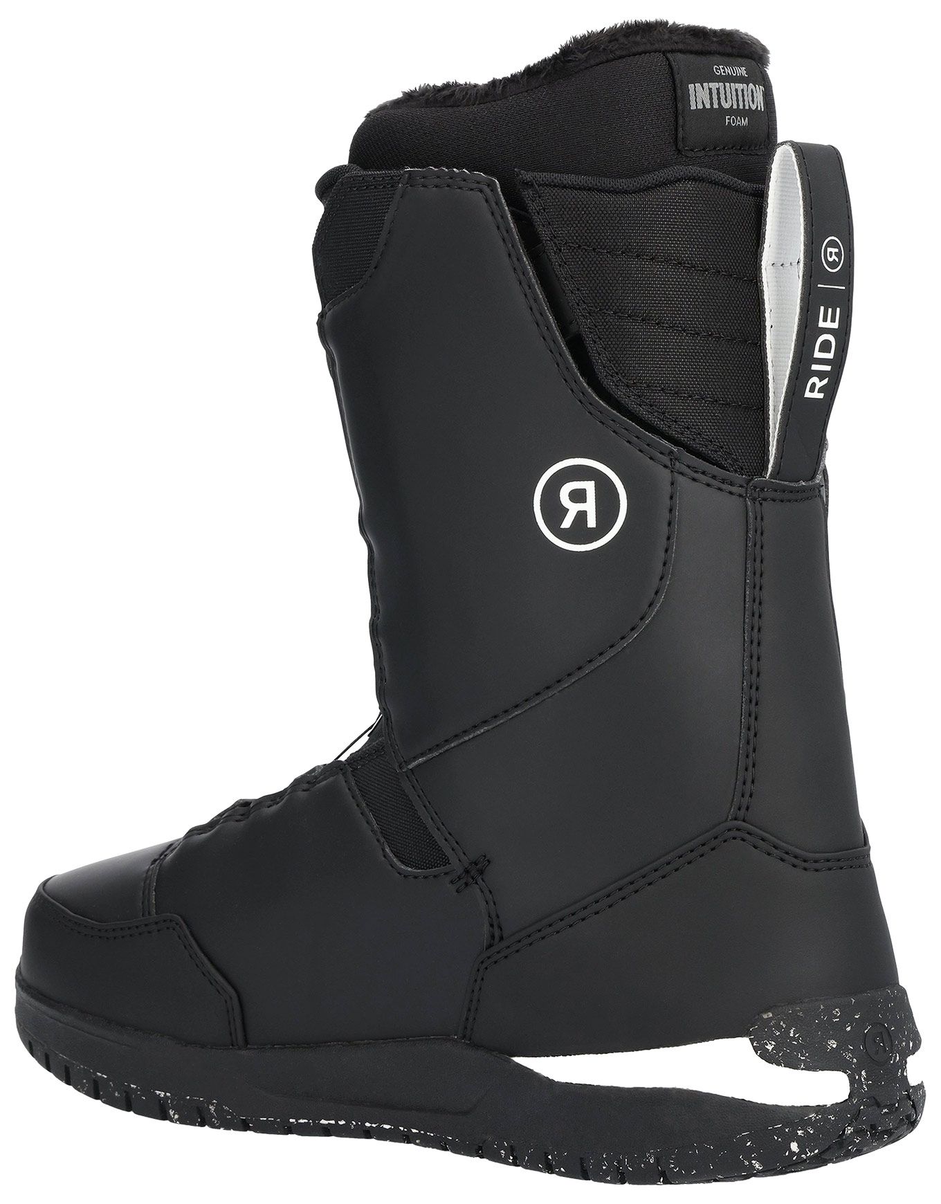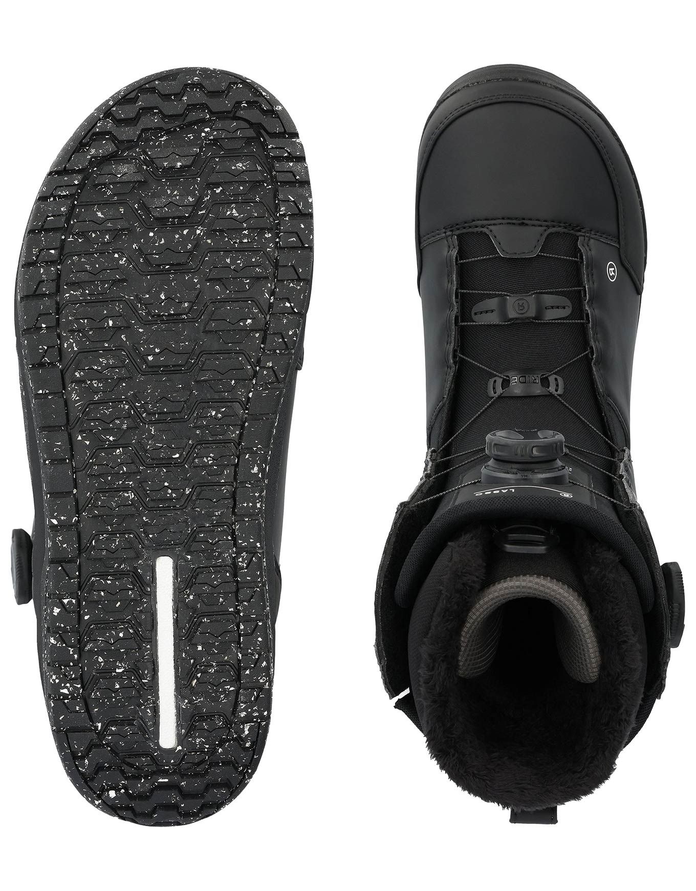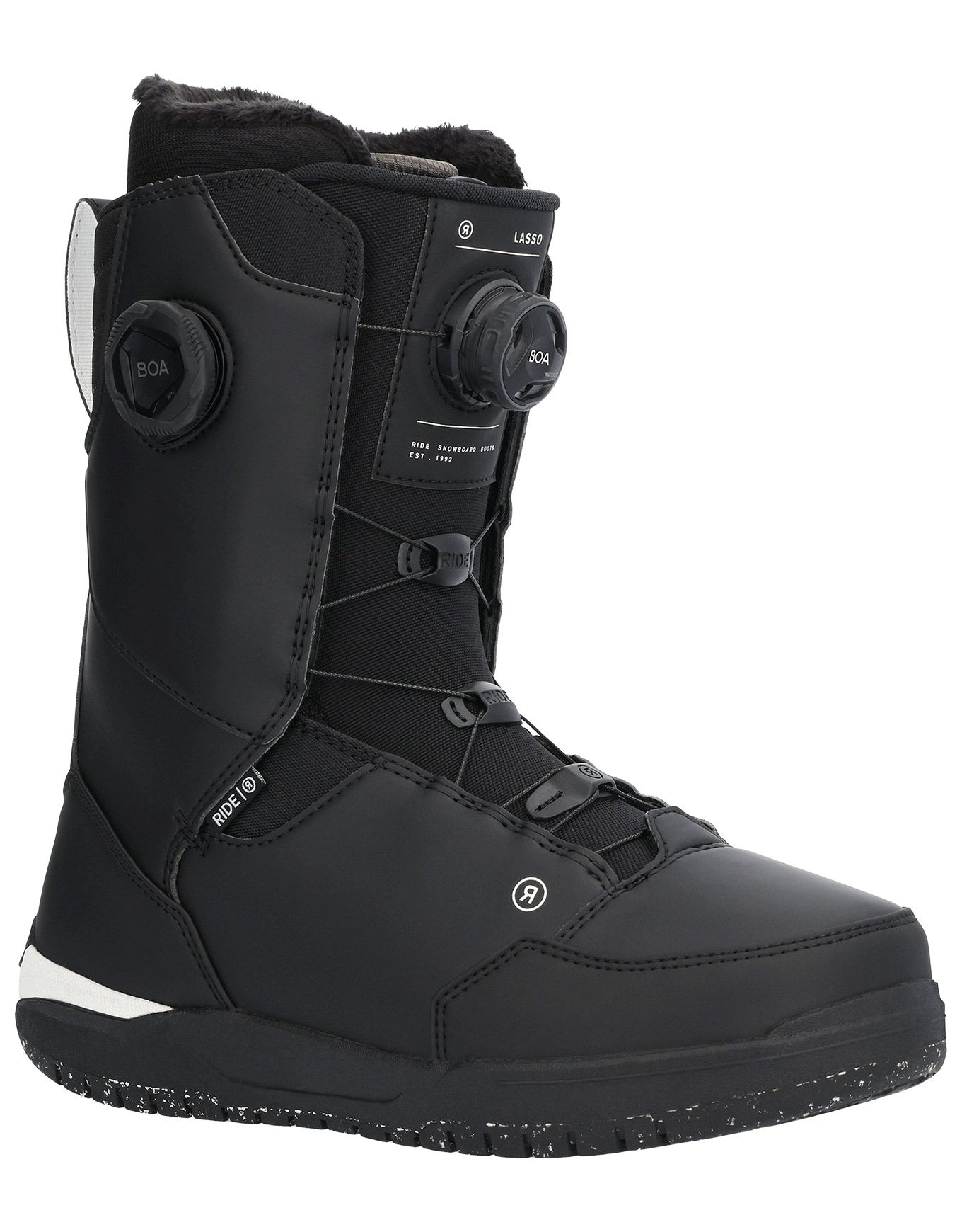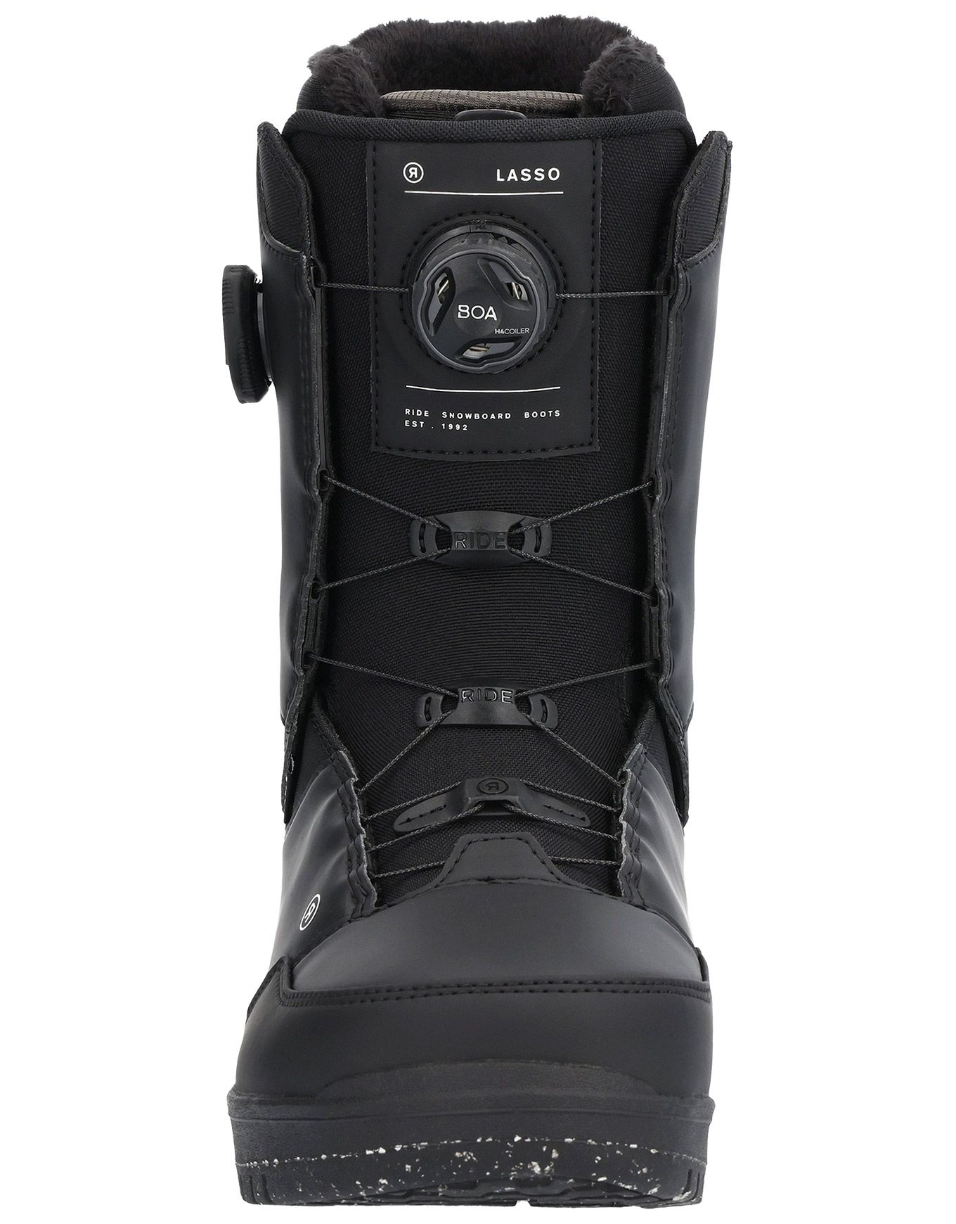 Boot de snowboard all-mountain Ride Lasso Black pour homme, niveau confirmé. Double BOA® et Tongue Tied™ verrouillent le talon pour un maintien précis ; chausson mousse bi-densité épouse le pied et conserve le dynamisme d’une boot rigide sur tous les terrains.