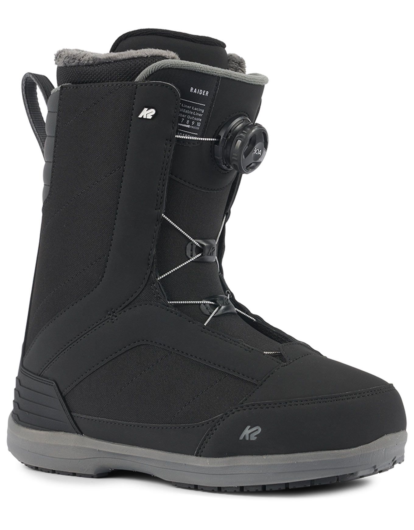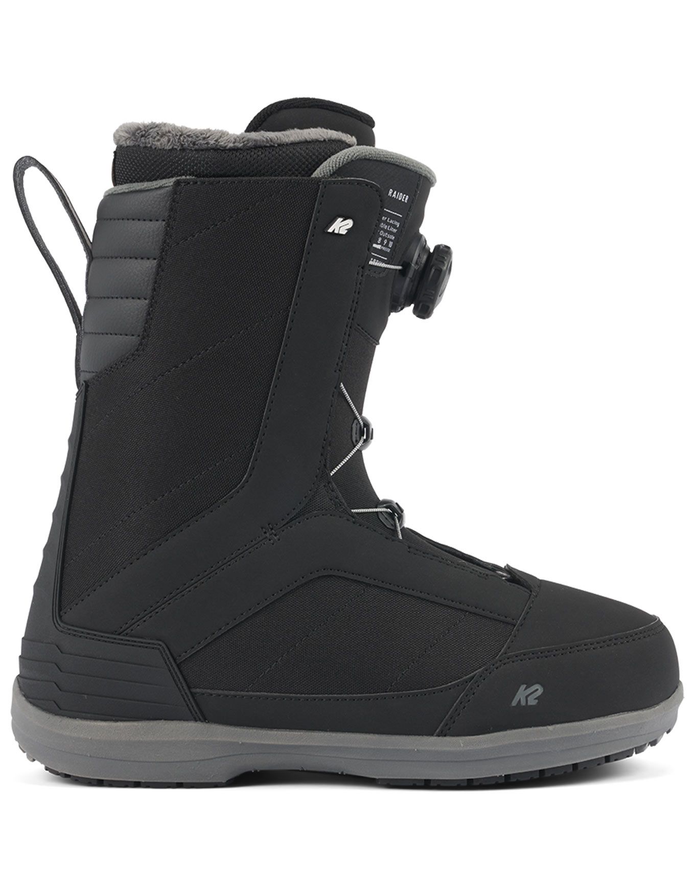 Boots de snowboard K2 Raider Black homme, all-mountain : serrage Boa® rapide, flex progressif, chausson Intuition® Control Foam 3D et semelle Roll Sole pour confort, maintien et amplitude.