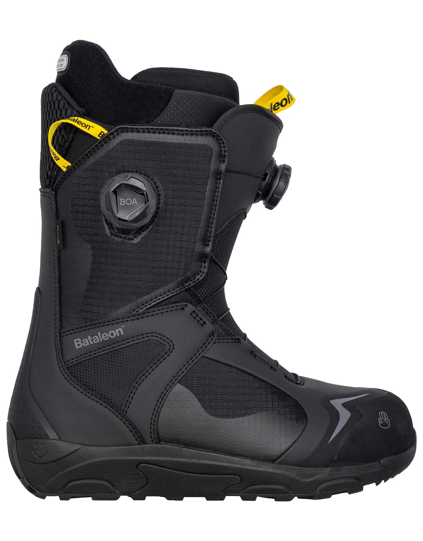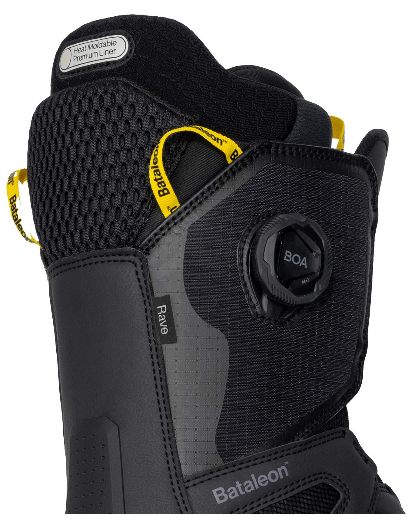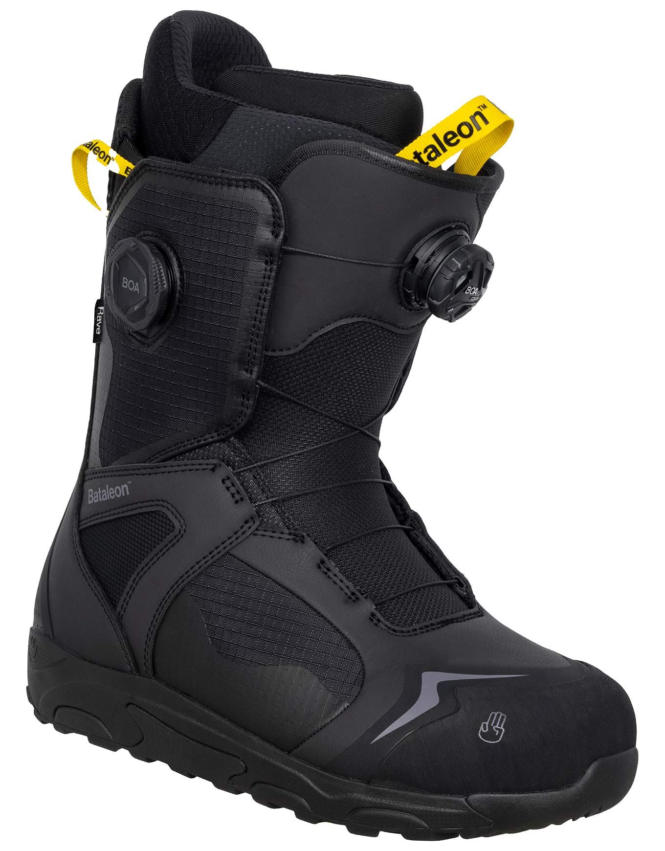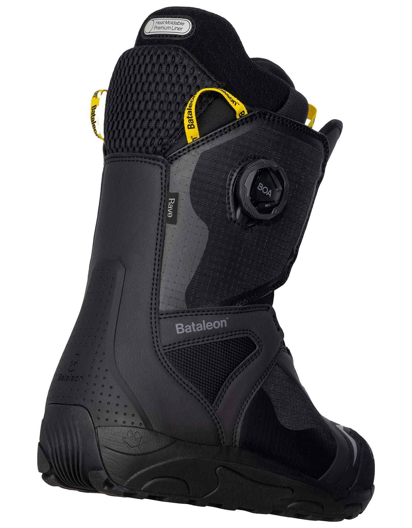 Bottes de snowboard homme Bataleon Rave BOA Black avec laçage double BOA, chaussons thermoformables, semelle adhérente et amortie pour confort et performance des rideurs intermédiaires à confirmés.