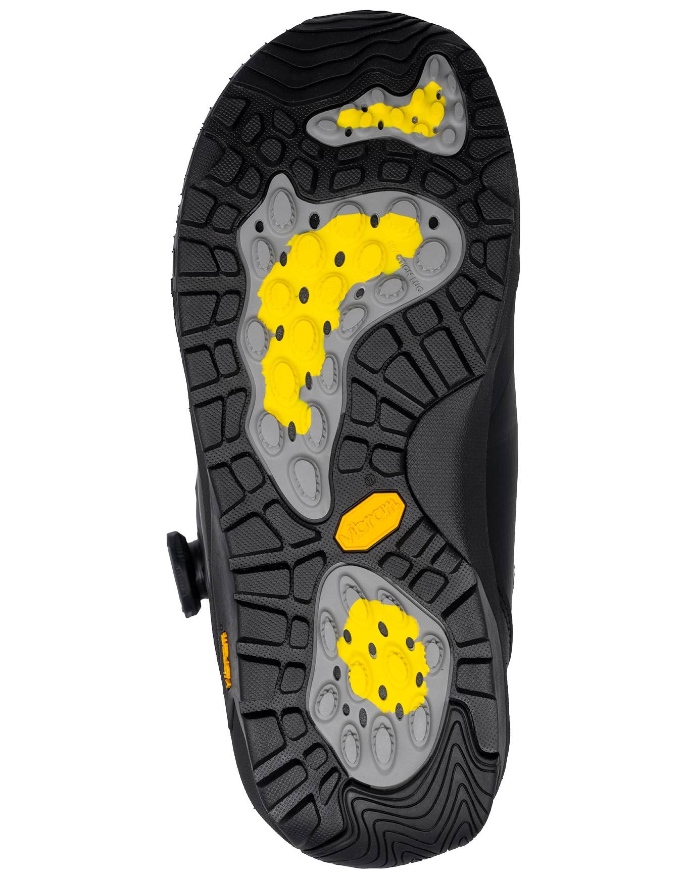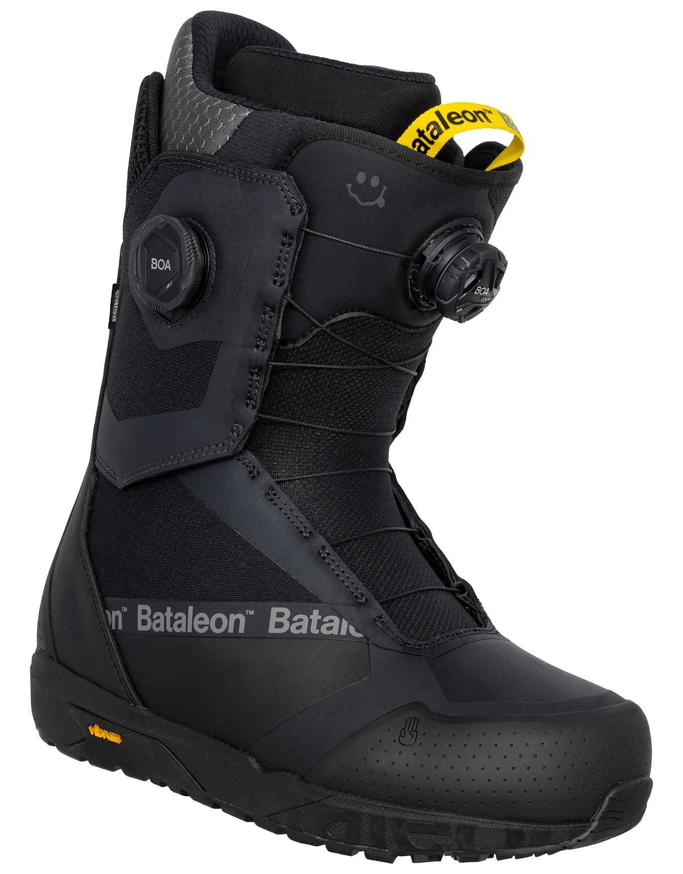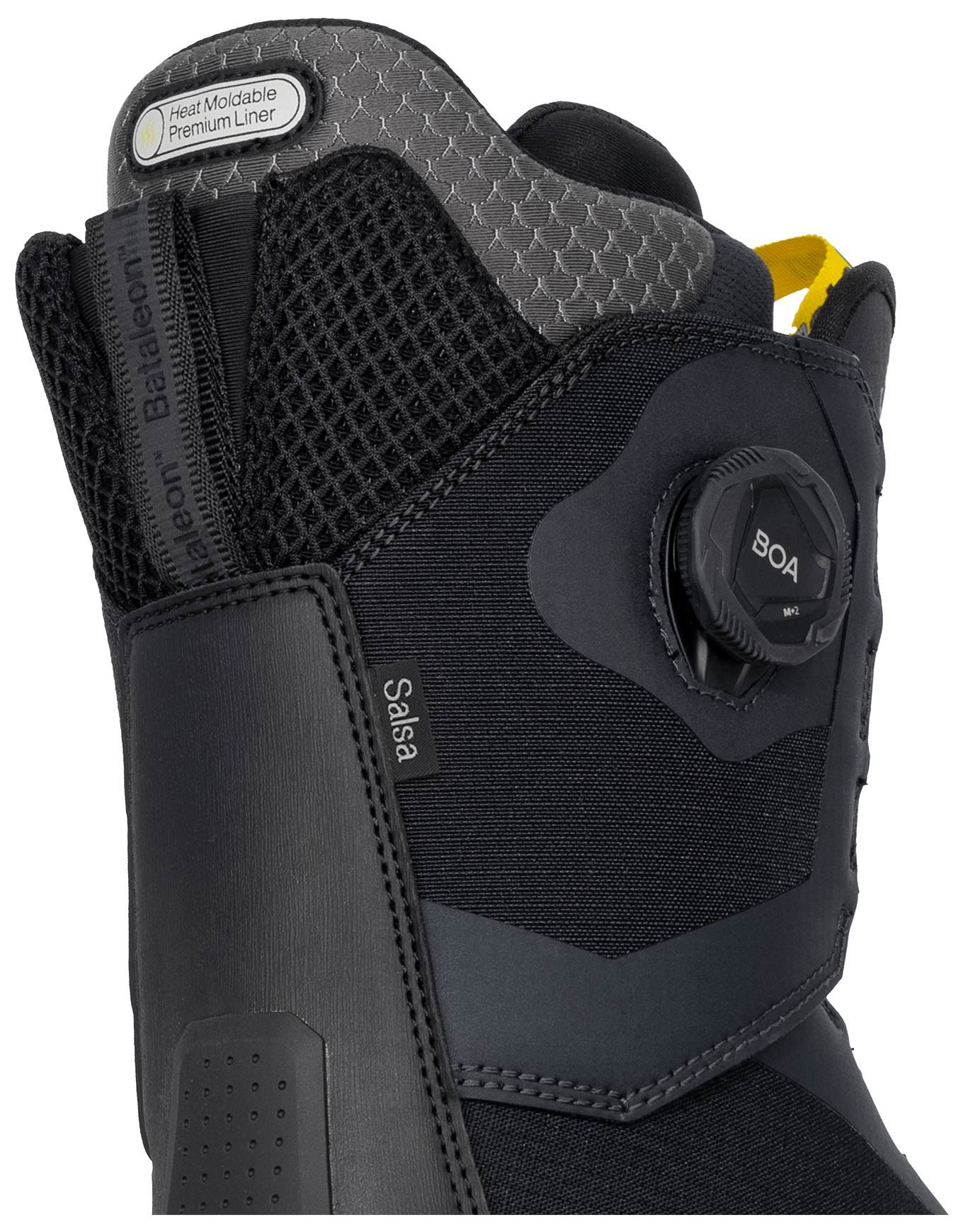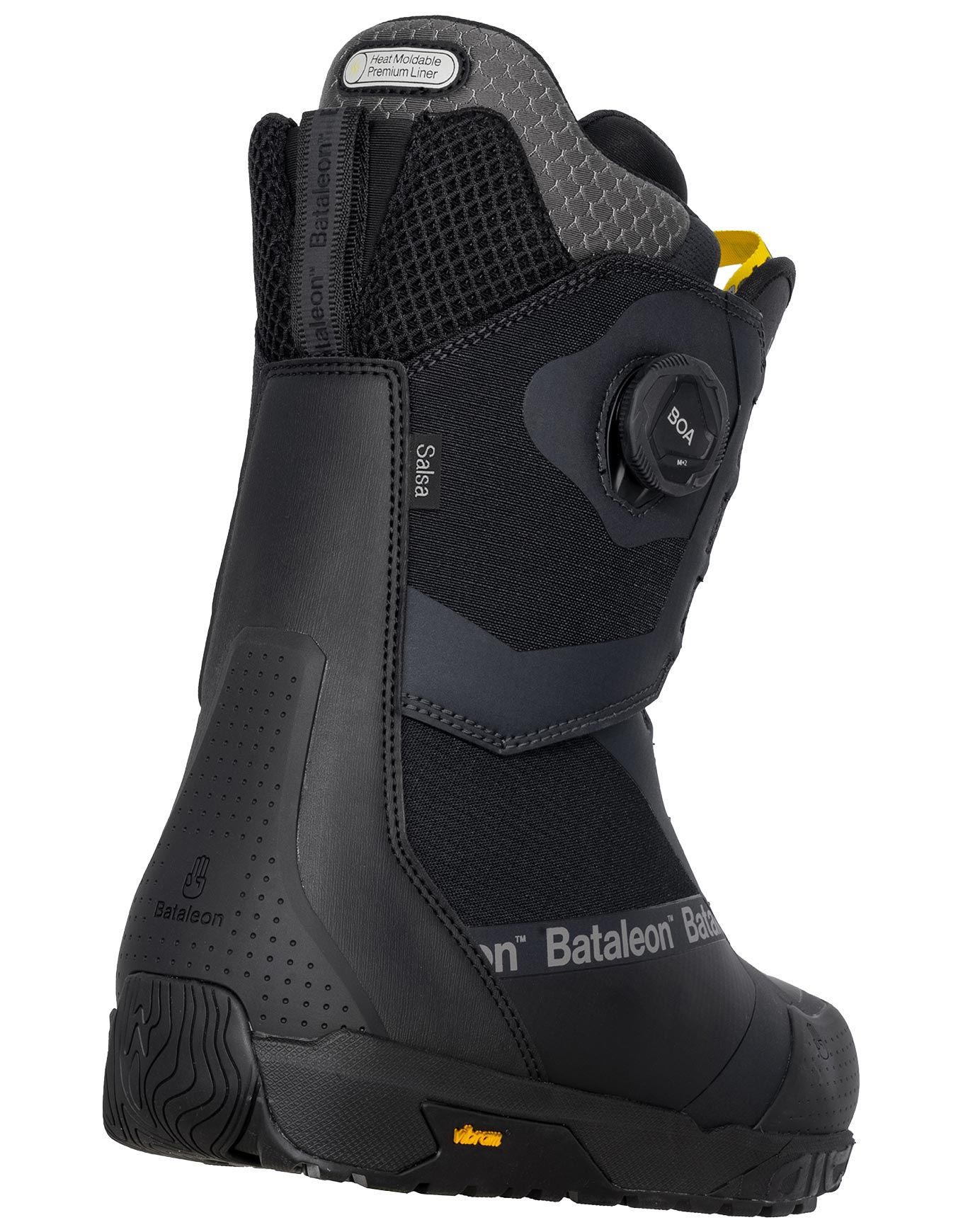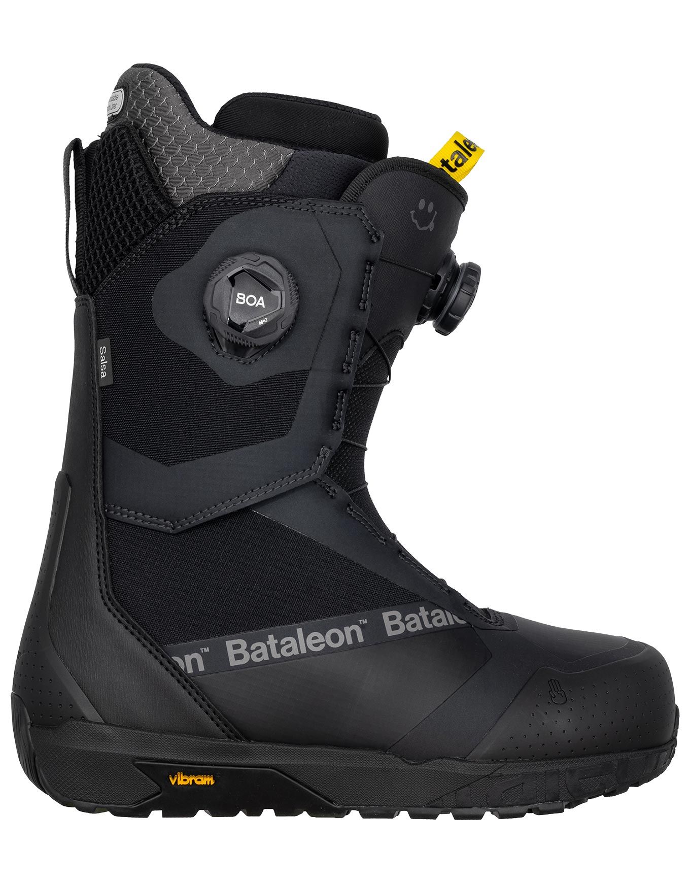Bottes de snowboard homme Bataleon Salsa BOA Black au laçage double BOA pour un fit précis, chaussons thermoformables, semelle Vibram Ice Track et bouclier thermique pour confort et adhérence hivernale.