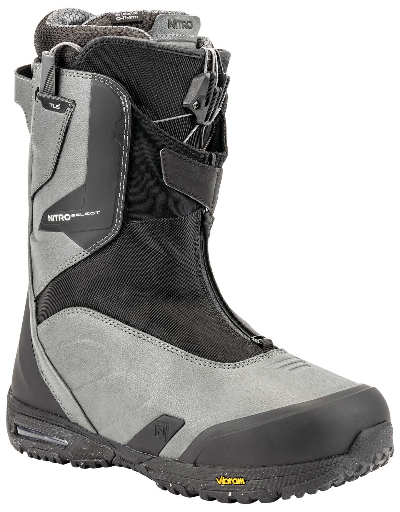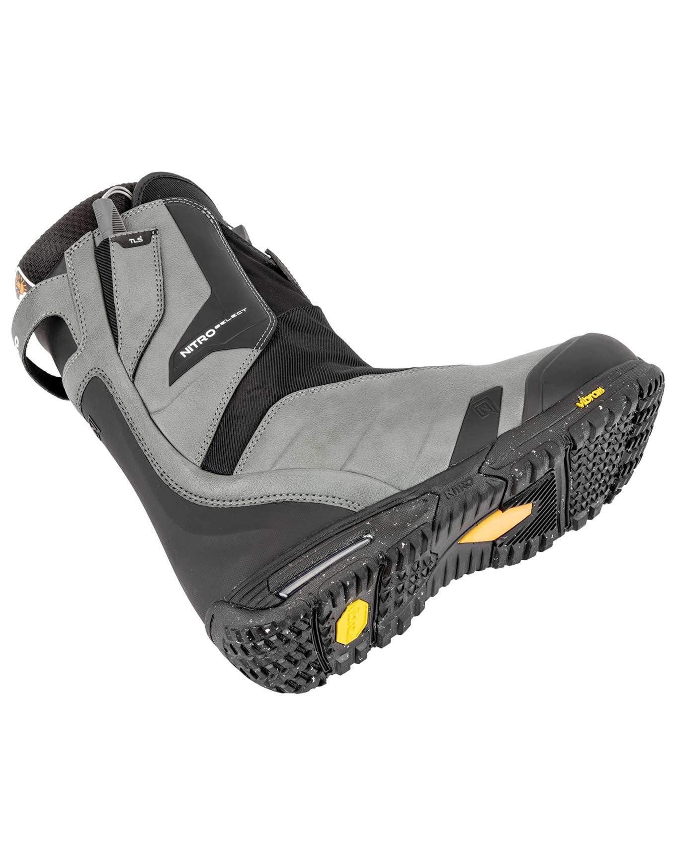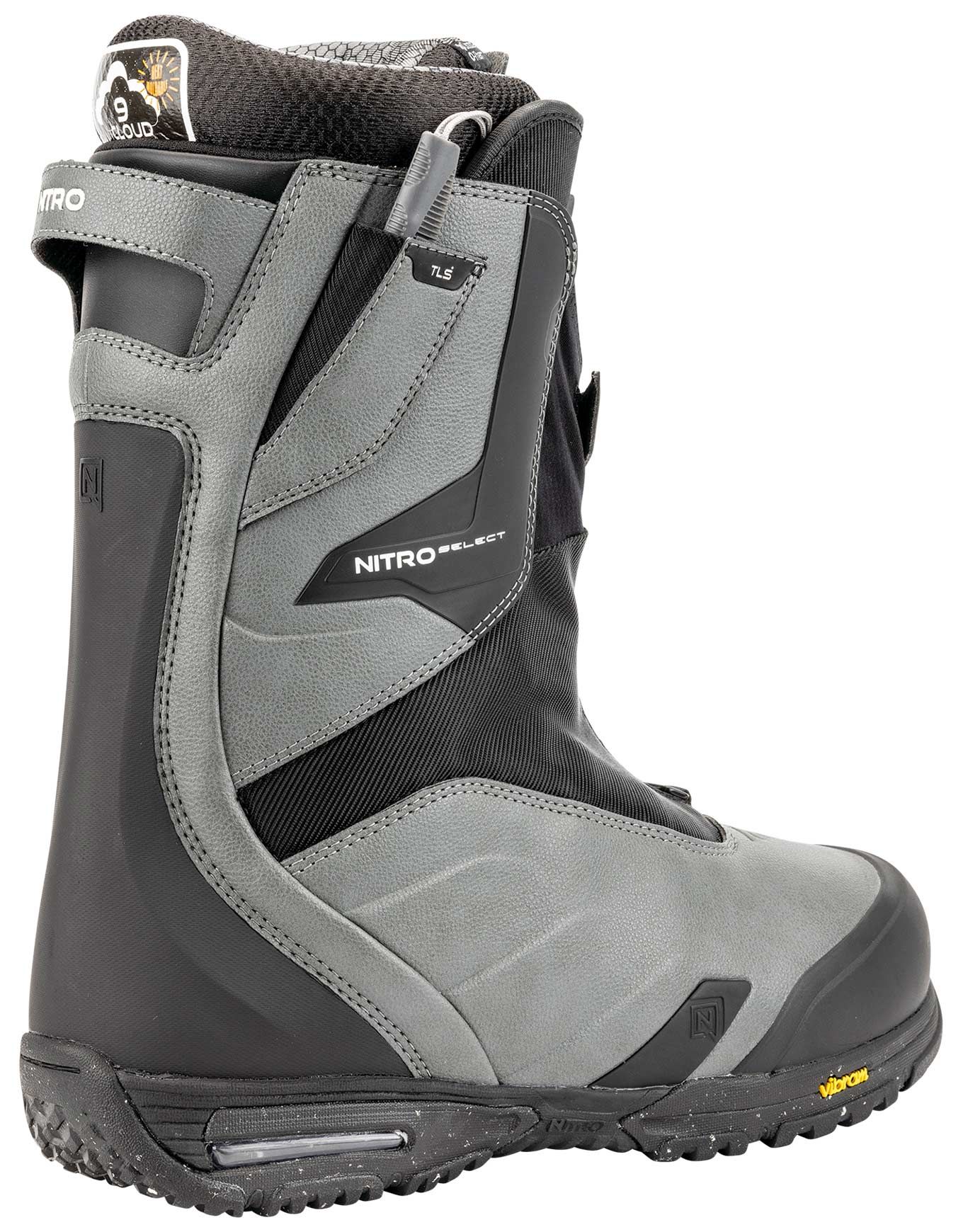 Les boots de snowboard Nitro Select TLS+ Charcoal/Black, flex 9/10, combinent serrage TLS Powercord, chausson Cloud 9 réglable, semelle Vibram® Ecostep™ et Air Dampening pour un freeride puissant, précis et durable.