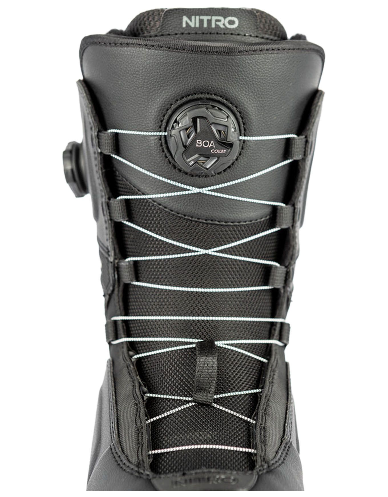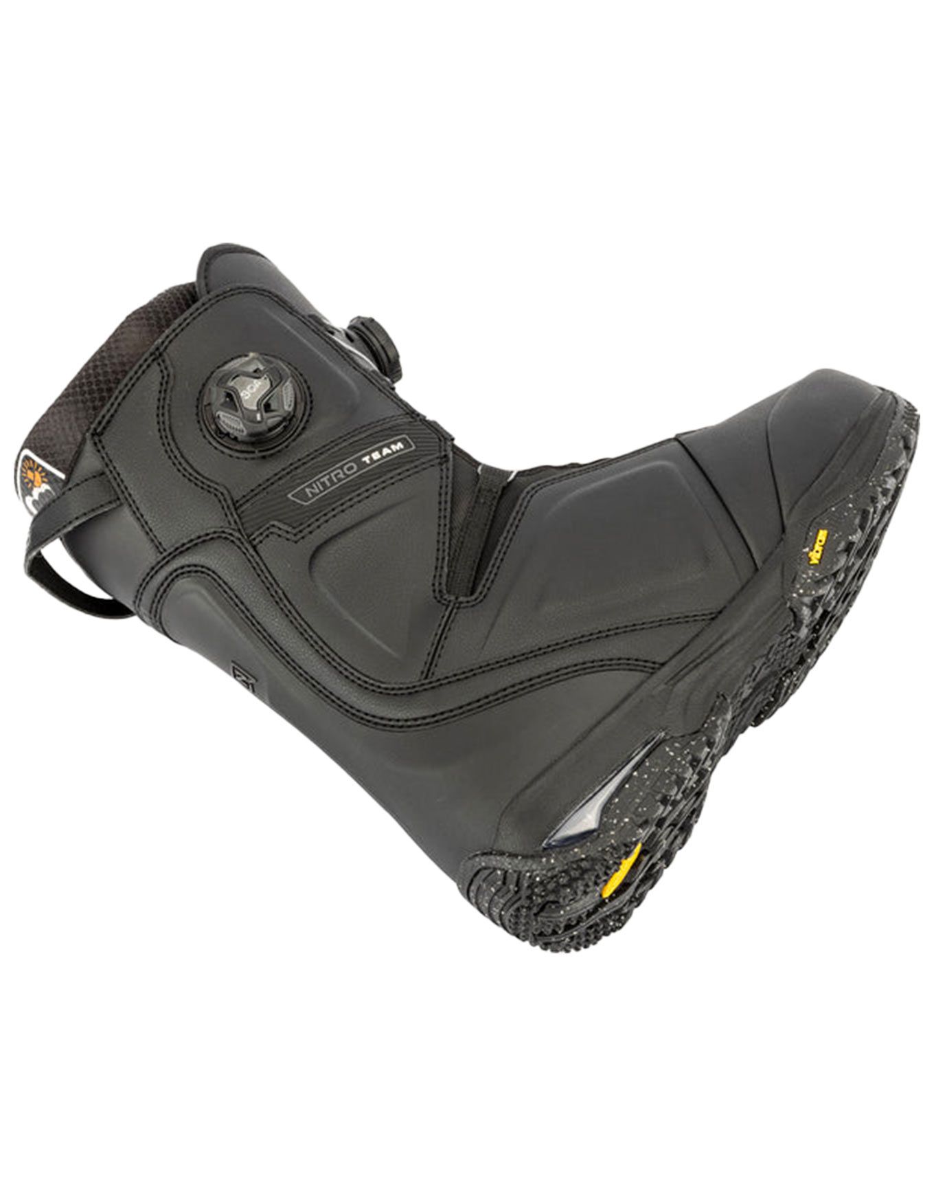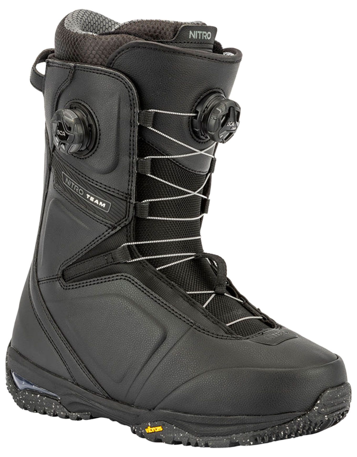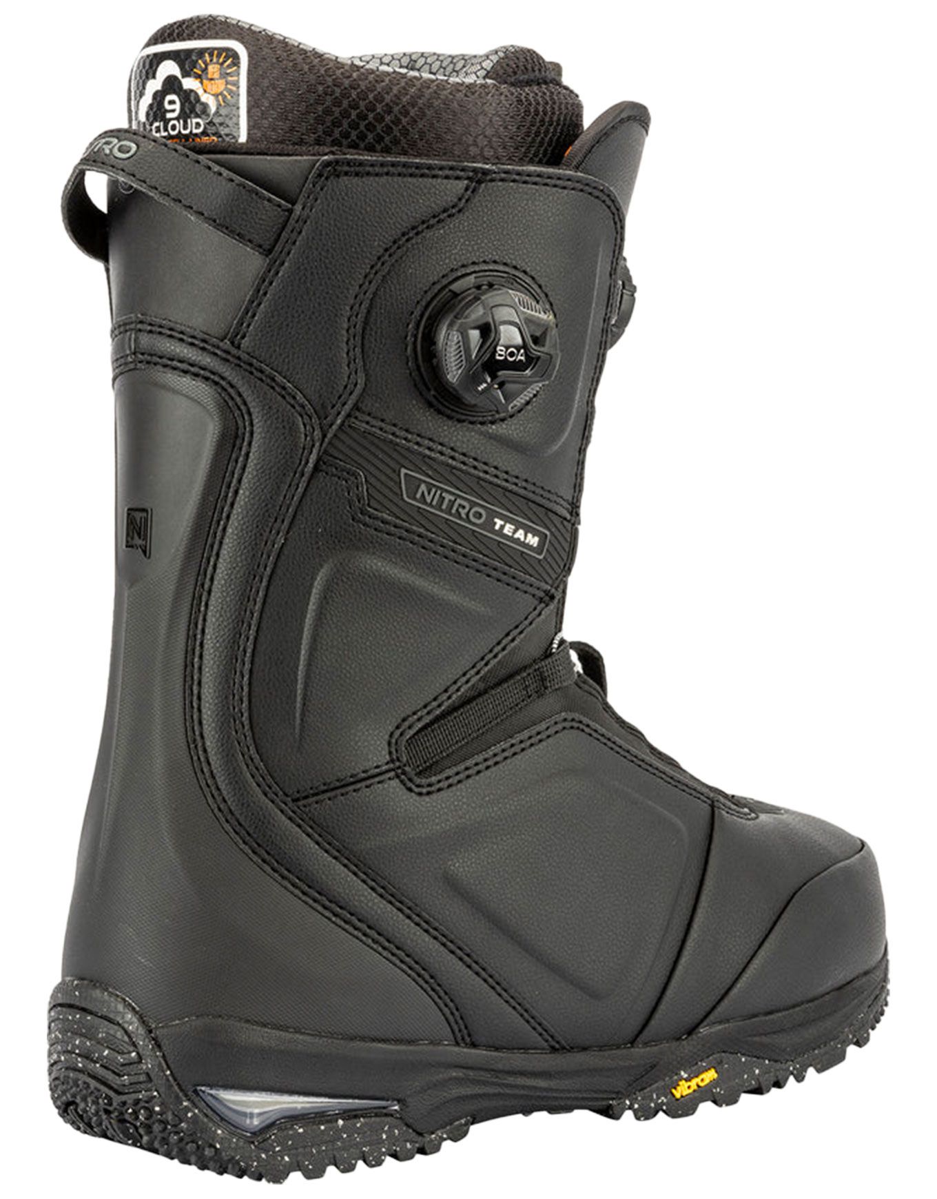 Boots snowboard homme Nitro Team Boa Black, flex 8/10, serrage BOA® Fit ajustable, chausson Cloud 9 avec Relace Liner Locker, semelle Vibram® Ecostep™, amorti Air Dampening et isolation Therminator Shield pour sessions freeride intenses.