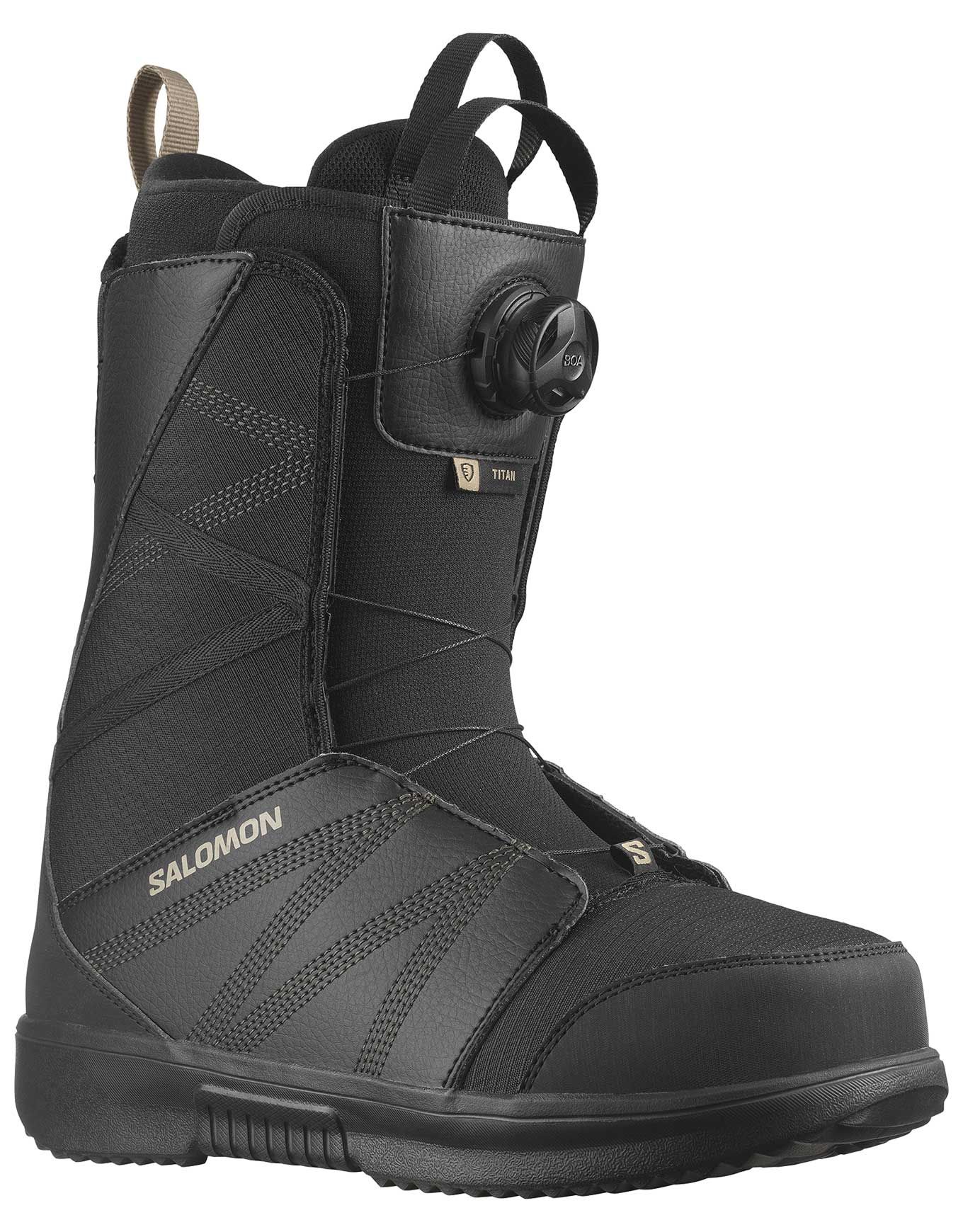 La Salomon Snowboard Titan Boa Black/Roasted Cashew est une boot snowboard homme all-mountain débutant/intermédiaire offrant ajustement rapide Boa®, chausson thermoformable Universal et semelle EVA durable pour un confort progressif.