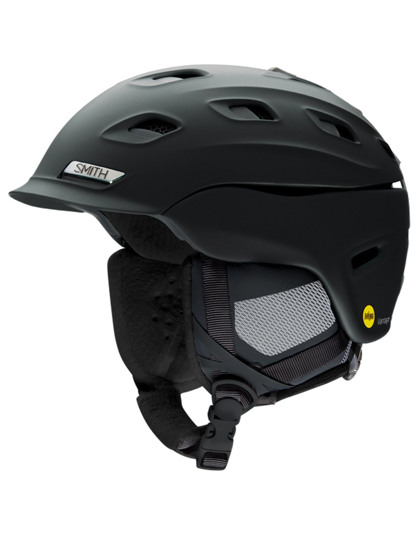 Casque de ski et snowboard Smith Vantage W MIPS Matte Black femme intégrant la protection Koroyd™ et la technologie MIPS® pour absorber les chocs. Ajustement précis BOA® 360, doublure Ionic+™ antibactérienne, oreillettes amovibles compatibles audio Aleck™.