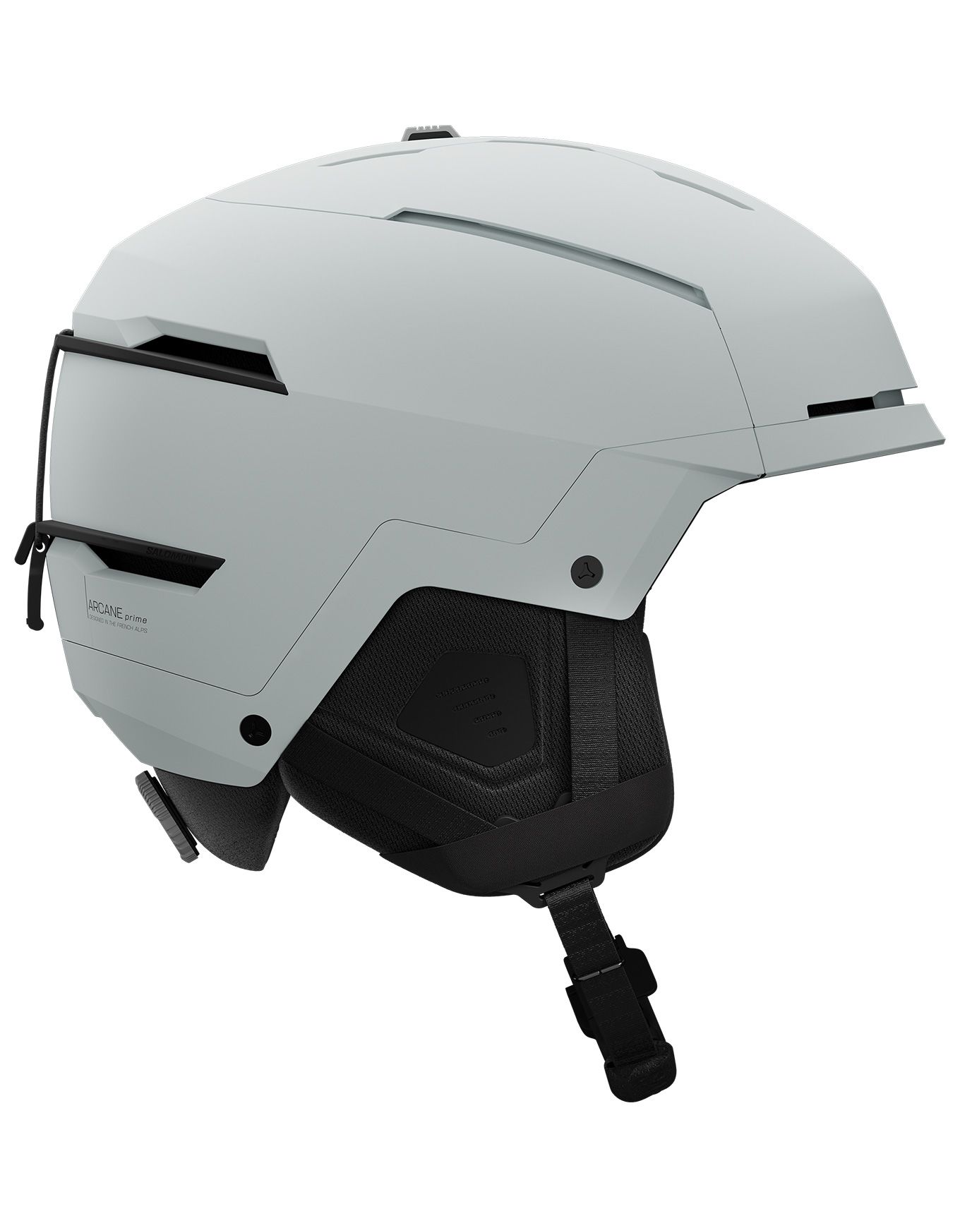 Casque de ski Salomon Arcane Prime Mips Ice Flow : coque ABS, mousse EPS 4D, système MIPS, réglage Boa, boucle Fidlock, construction MaxFit, aération Airflow et doublure Polartec pour sécurité et confort optimaux.