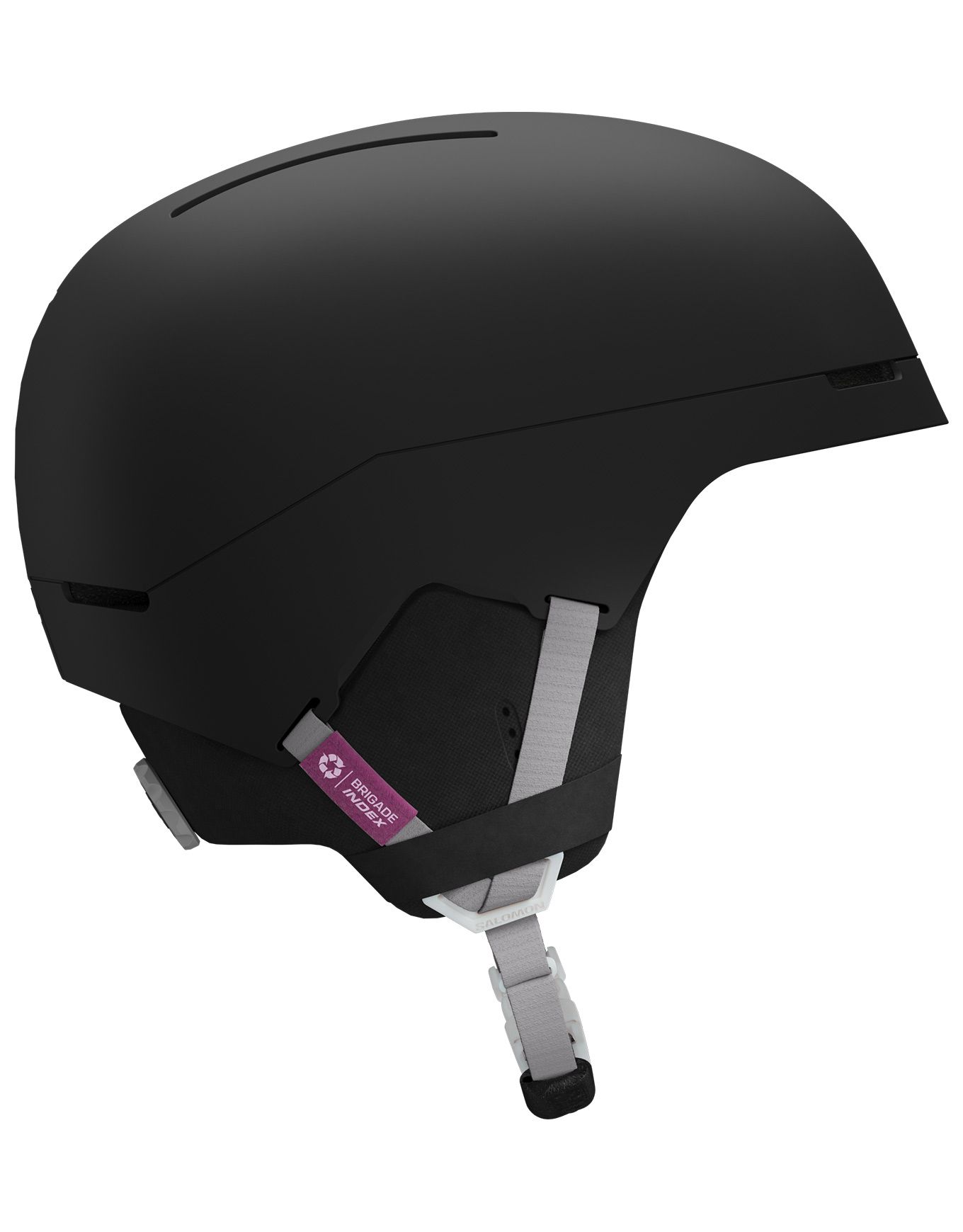 Casque de ski et snowboard Salomon Brigade Index Black avec coque ABS, mousse EPS 4D, réglage Custom Dial 360, construction MaxFit, aération Airflow et composition 96 % recyclable pour protection et confort optimaux sur les pistes.