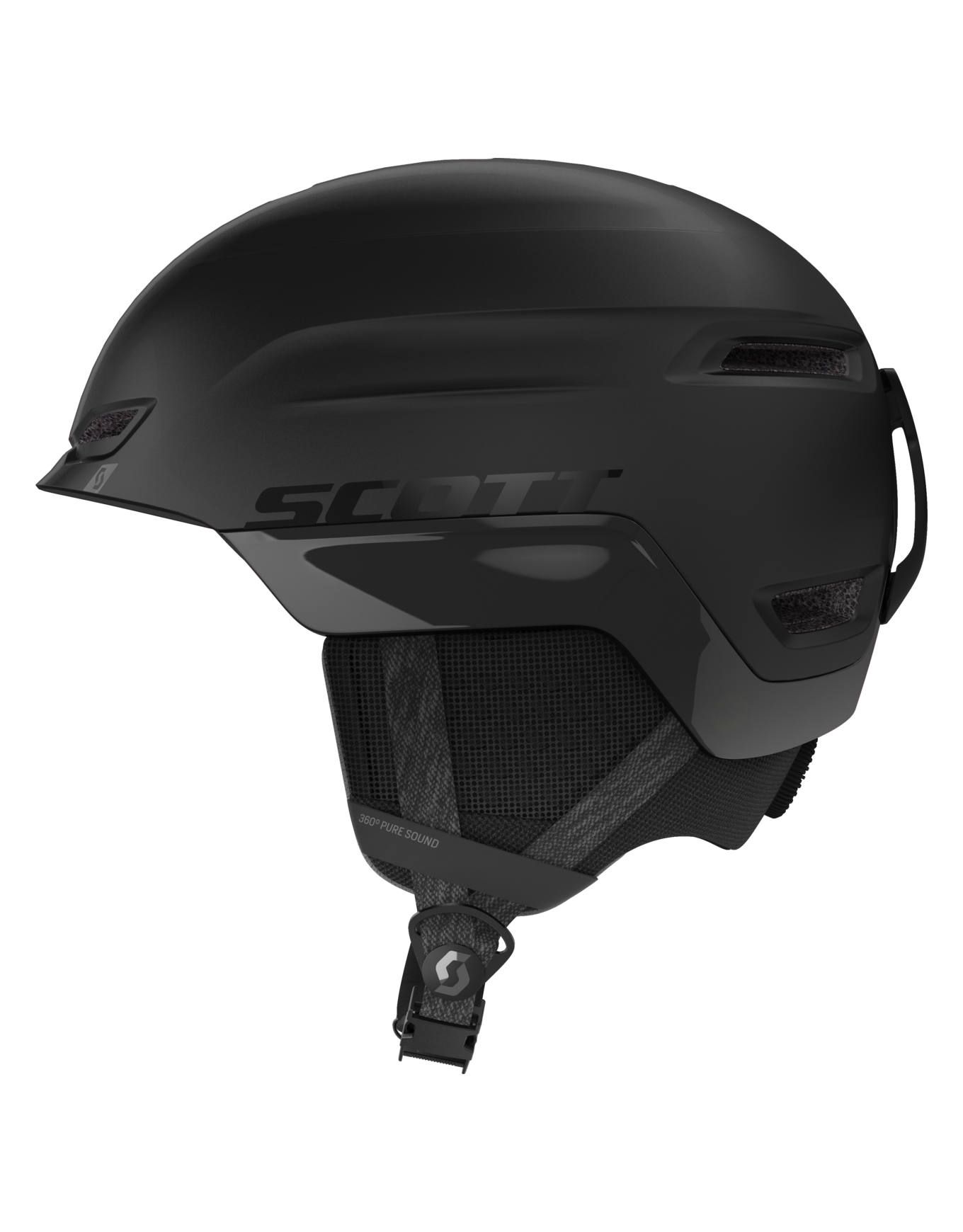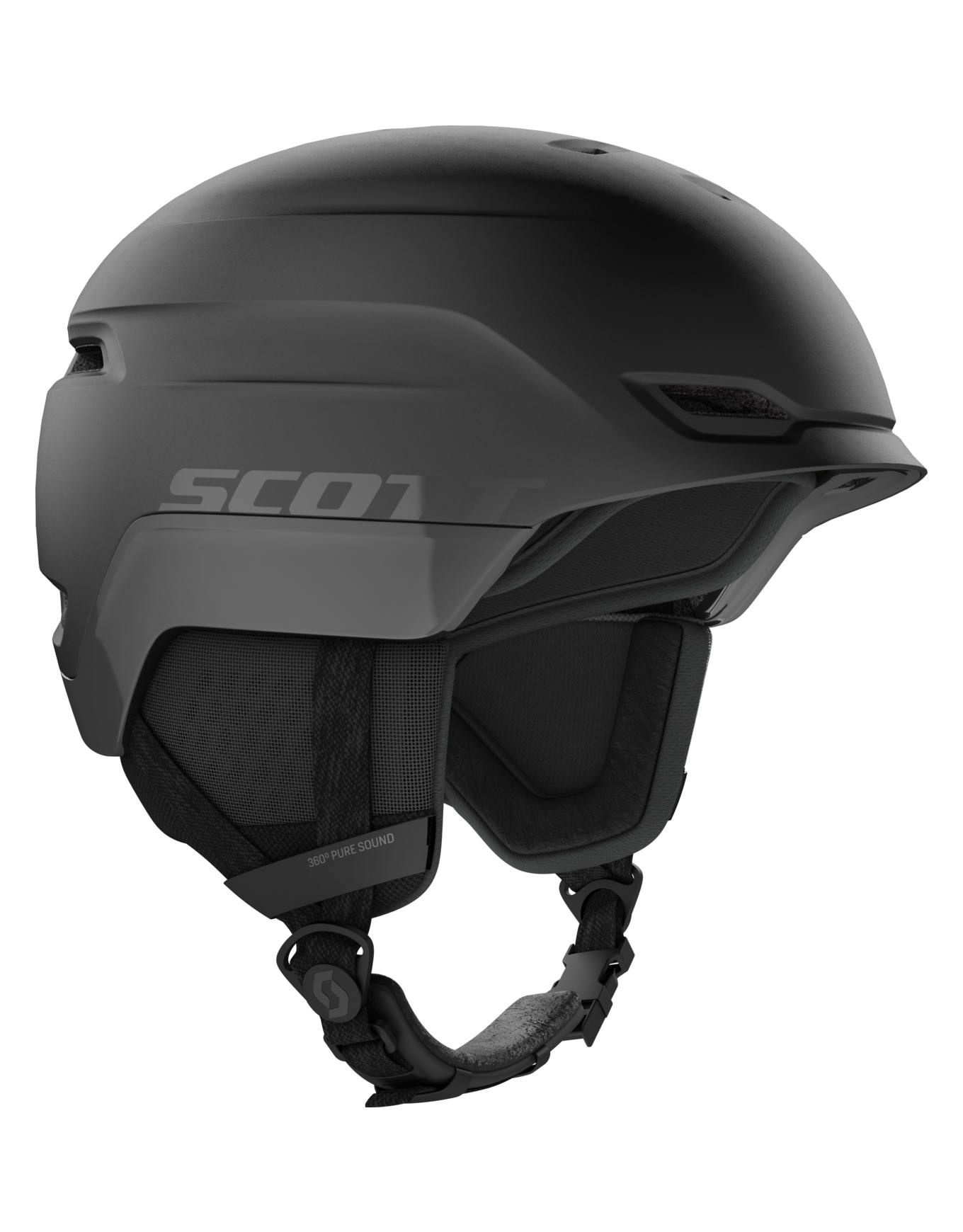 Casque de ski Scott Chase 2 Black, construction In-Mold polycarbonate/EPS ultra-légère, ajustement WRAS 2, ventilation active et technologie 360° Pure Sound pour un confort et une protection freeride optimale.