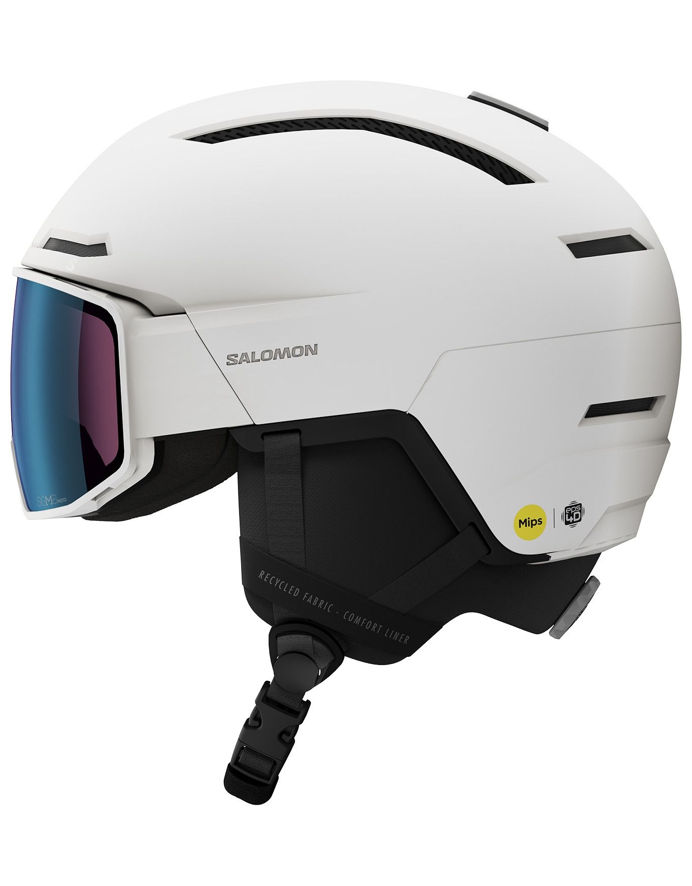Casque à visière Salomon Driver Pro Sigma Photo Mips White, coque hybride avec visière photochromique interchangeable, compatibles lunettes, Mips et EPS 4D pour une protection renforcée contre les impacts, réglage précis Custom Dial 360, doublure séchage rapide et construction 98 % recyclée.