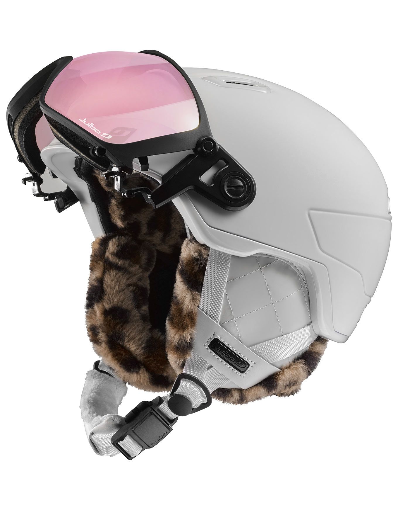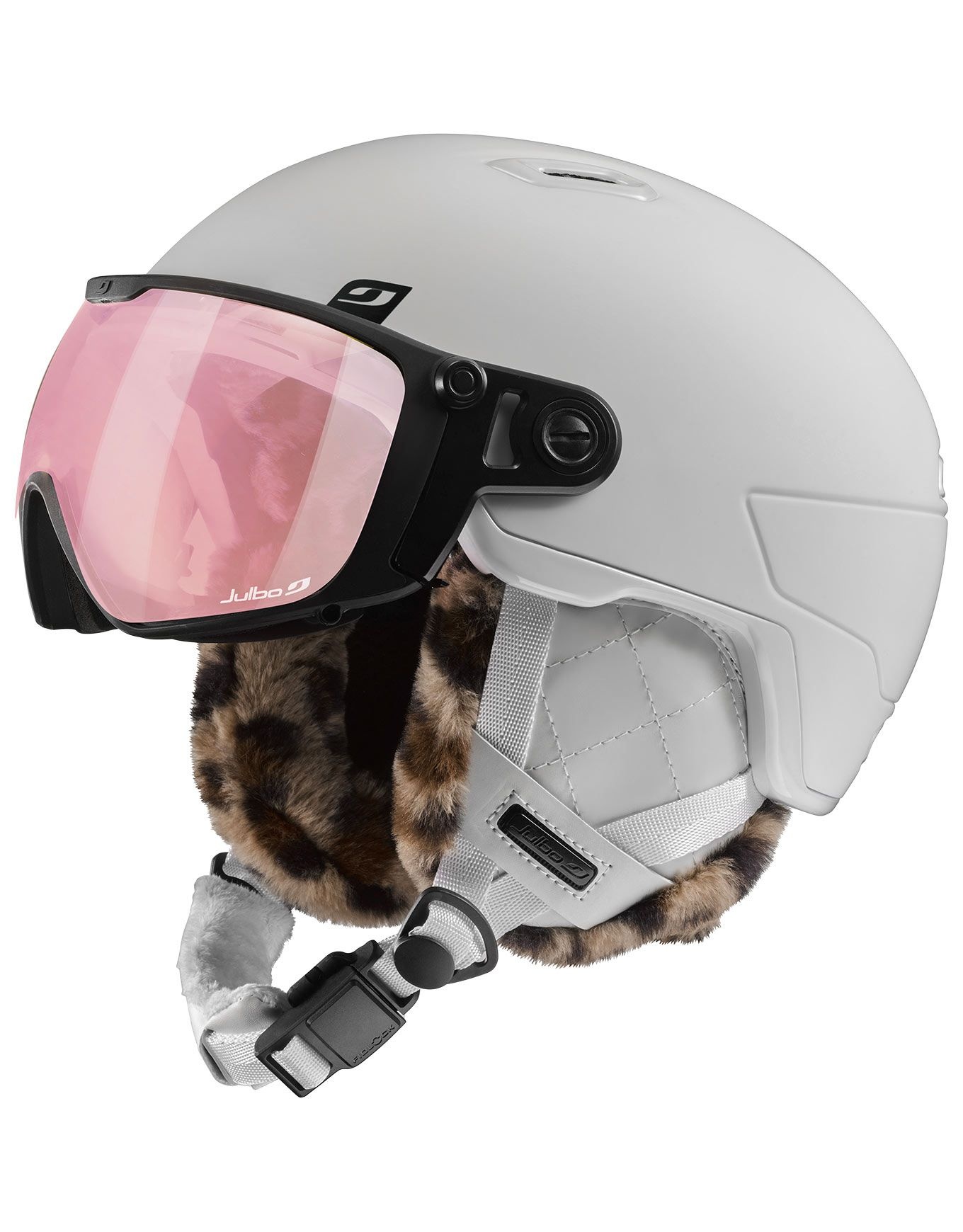 Casque ski Julbo Globe Evo Reactiv 1-3 HC White avec visière photochromique, ventilation réglée, oreillettes 3D amovibles et boucle Fidlock : confort total, vision nette, protection polyvalente.