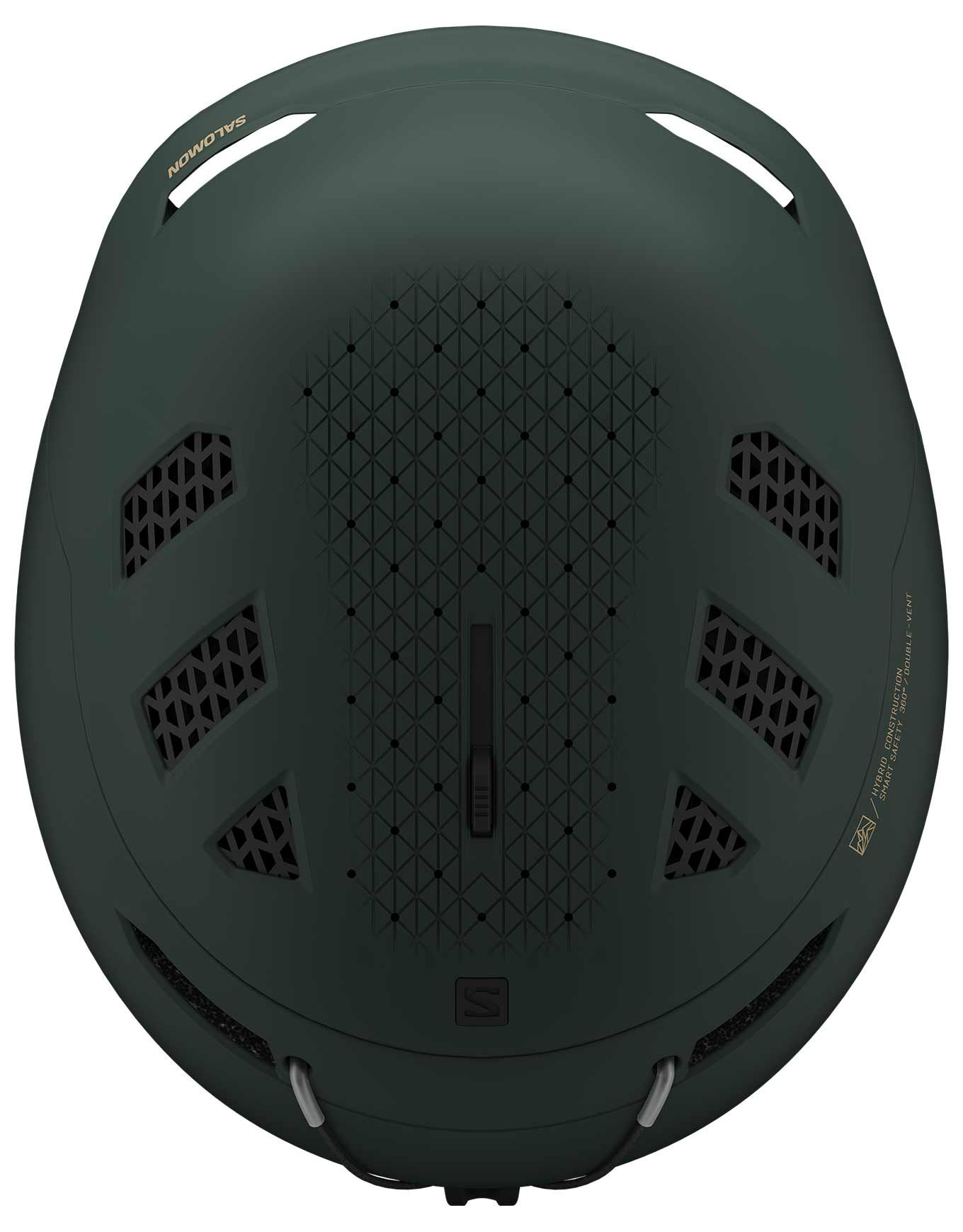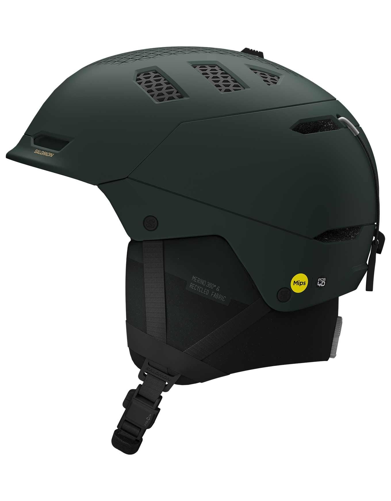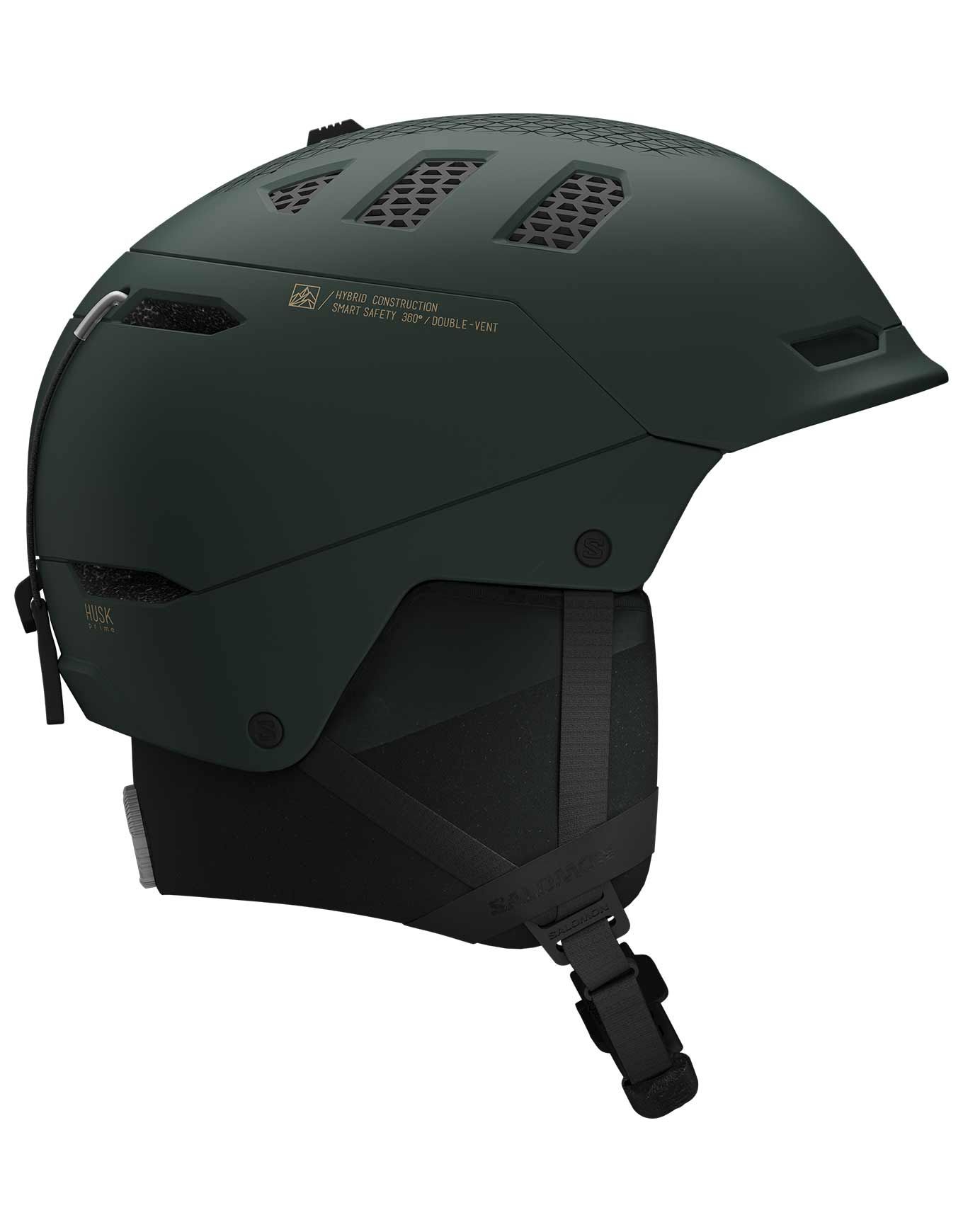 Casque de ski Salomon Husk Prime Mips Green Gables, coque ABS et mousse EPS 4D, système MIPS, réglage Boa, boucle Fidlock, construction MaxFit et aération Airflow pour sécurité et confort optimaux sur les pistes.