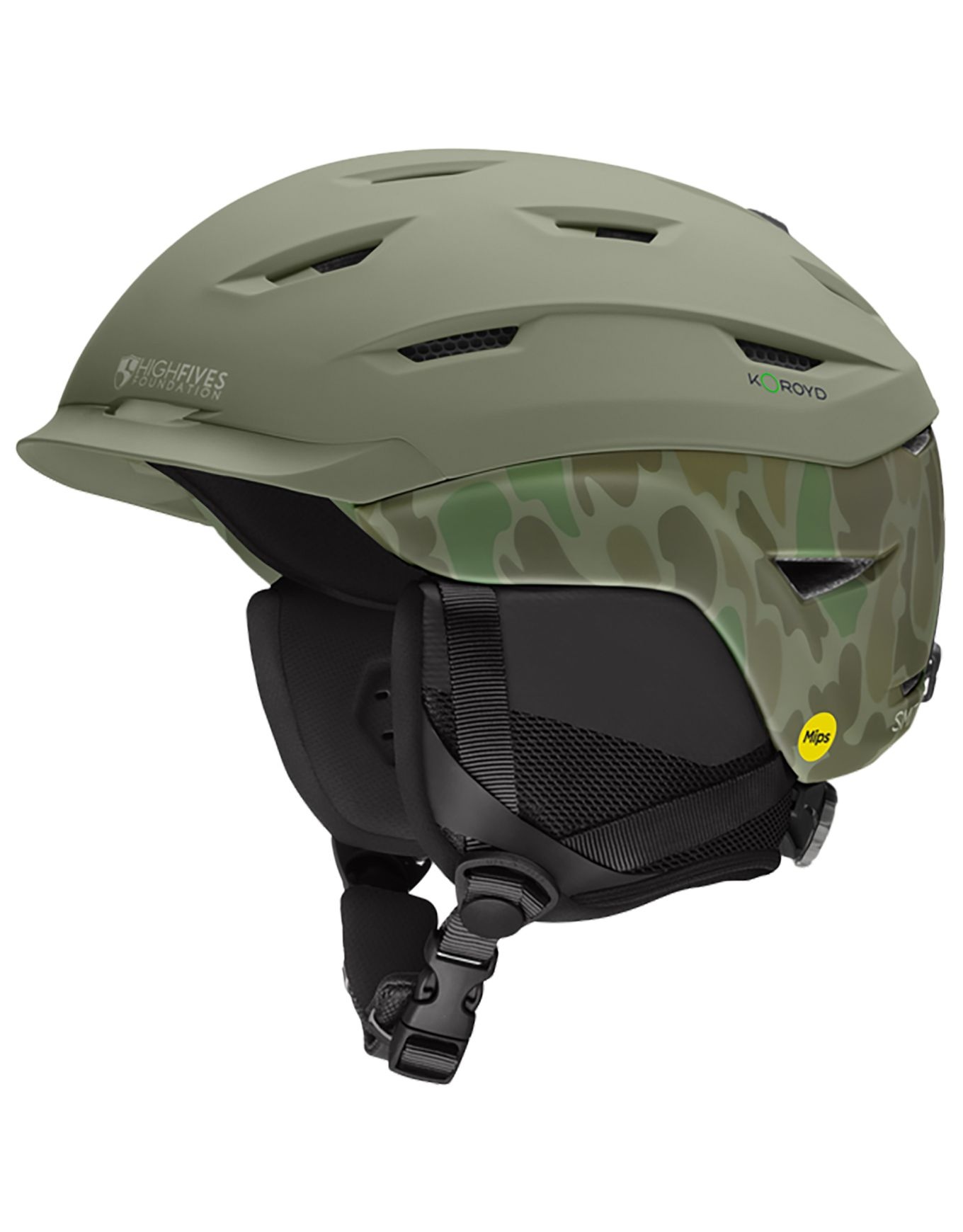 Le casque de ski/snowboard Smith Level MIPS Matte High Fives combine construction hybride ultralégère, technologies MIPS et Koroyd pour une protection maximale, ajustement VaporFit, compatibilité audio Aleck et doublure antimicrobienne Ionic+.
