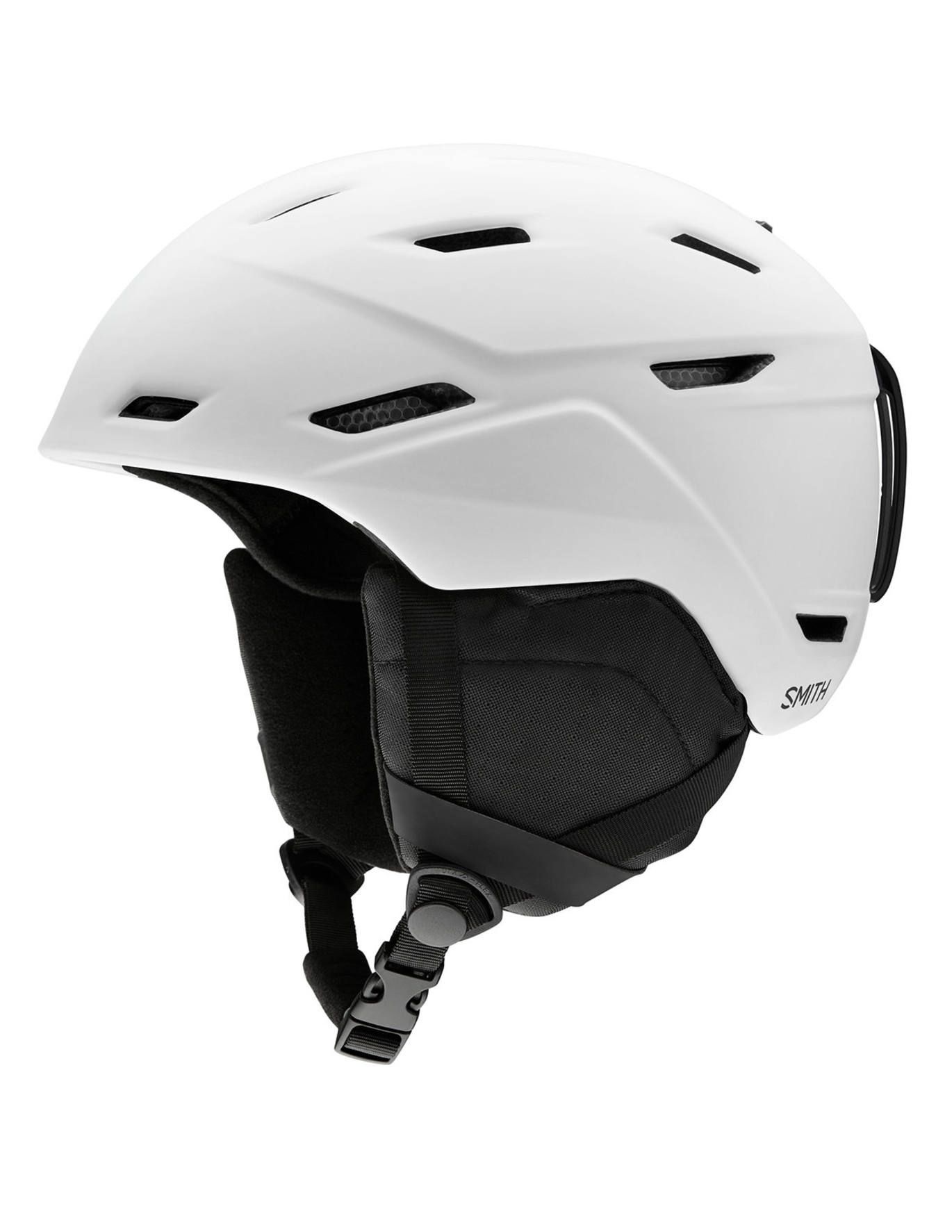 Casque de ski/snowboard Smith Mission Matte White, construction In-Mold légère, ajustement rapide, ventilation réglable d’une main, coque Koroyd™ absorbant les chocs, compatible audio Aleck™.