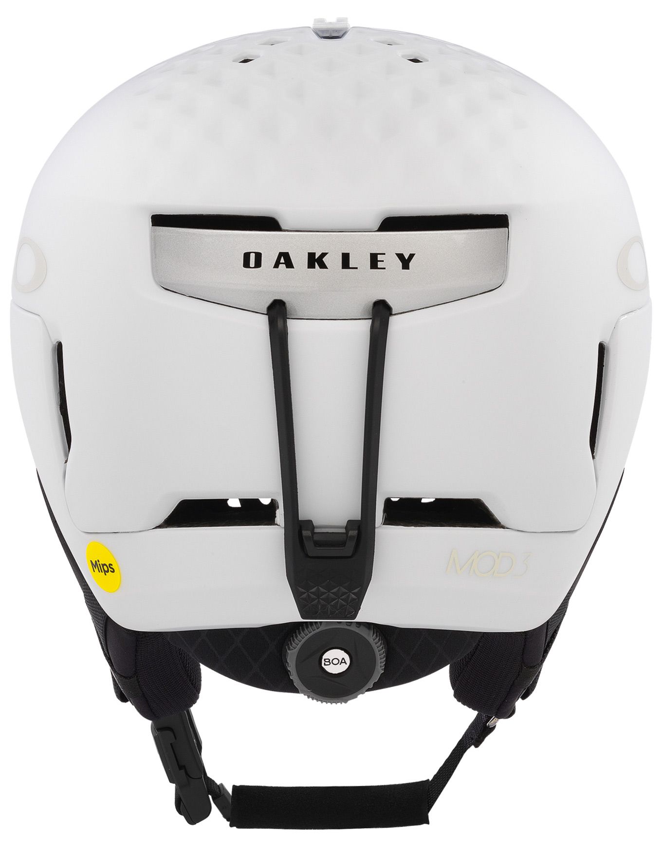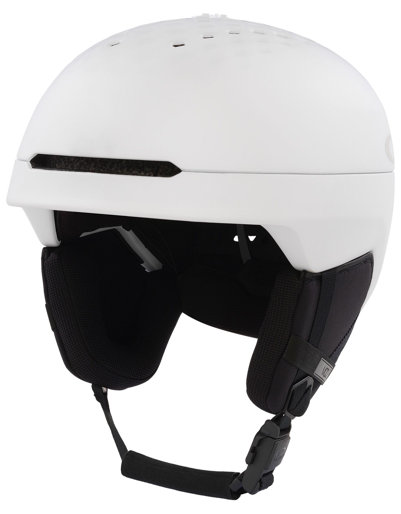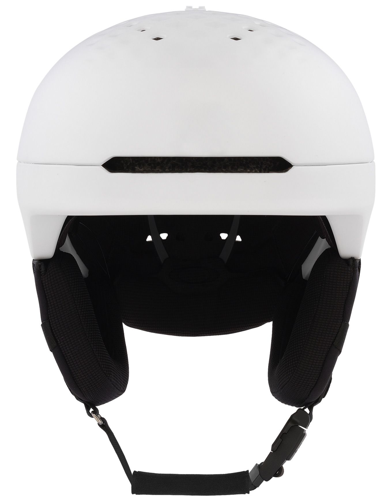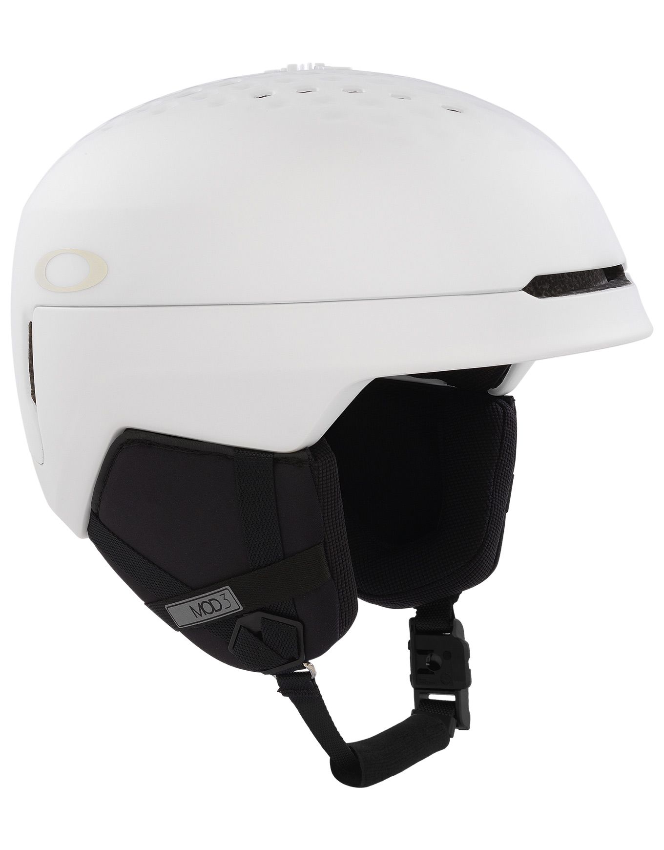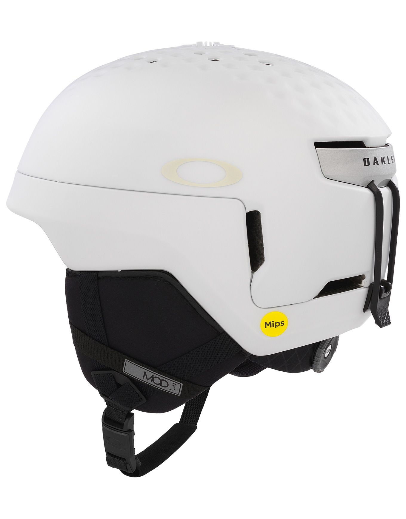 Casque de ski Oakley Mod3 White all-mountain, construction In-Mold légère, ajustement Boa® 360°, doublure Polartec® Power Grid™ respirante, ventilation anti-buée, fermeture Fidlock® manipulable avec gants.