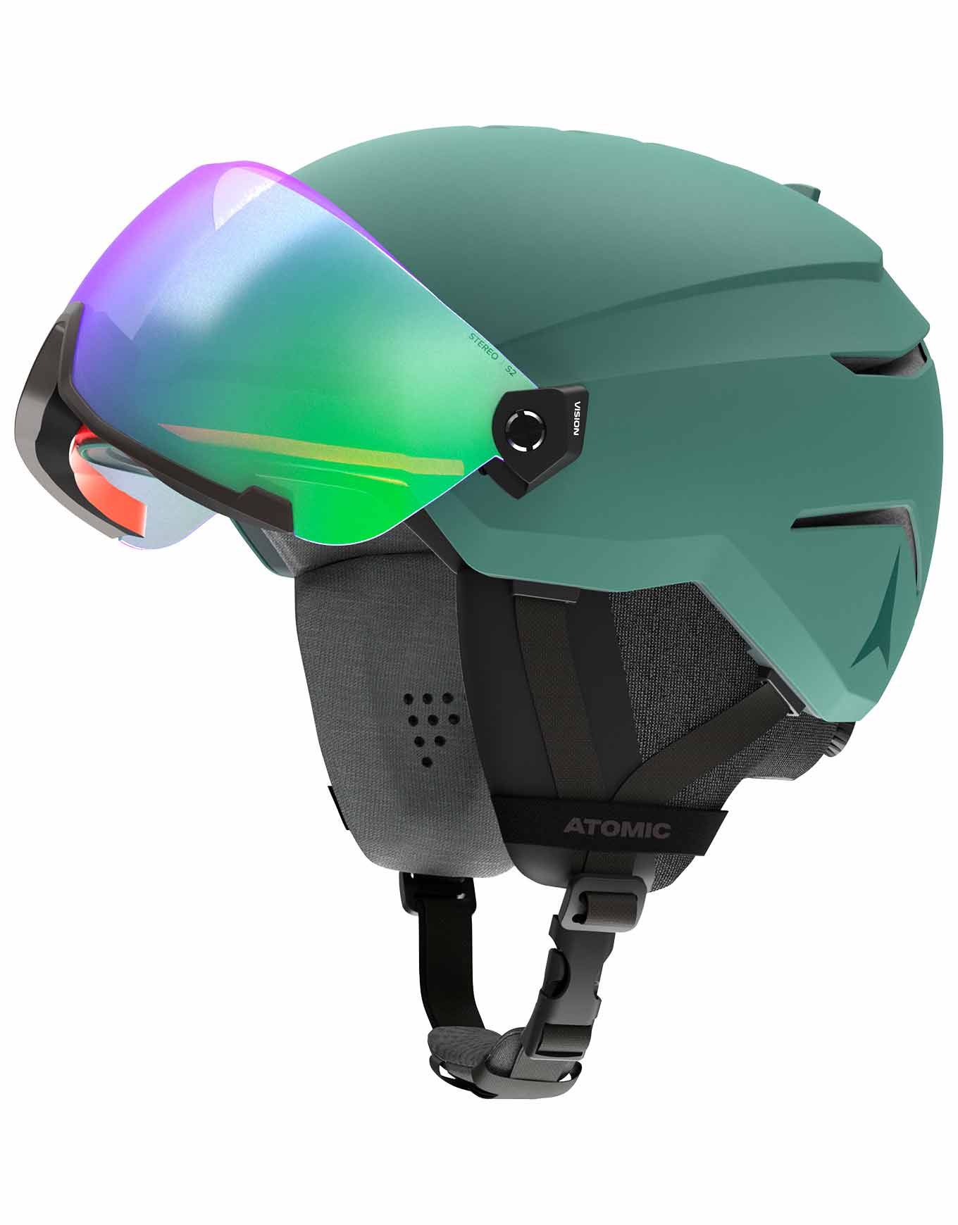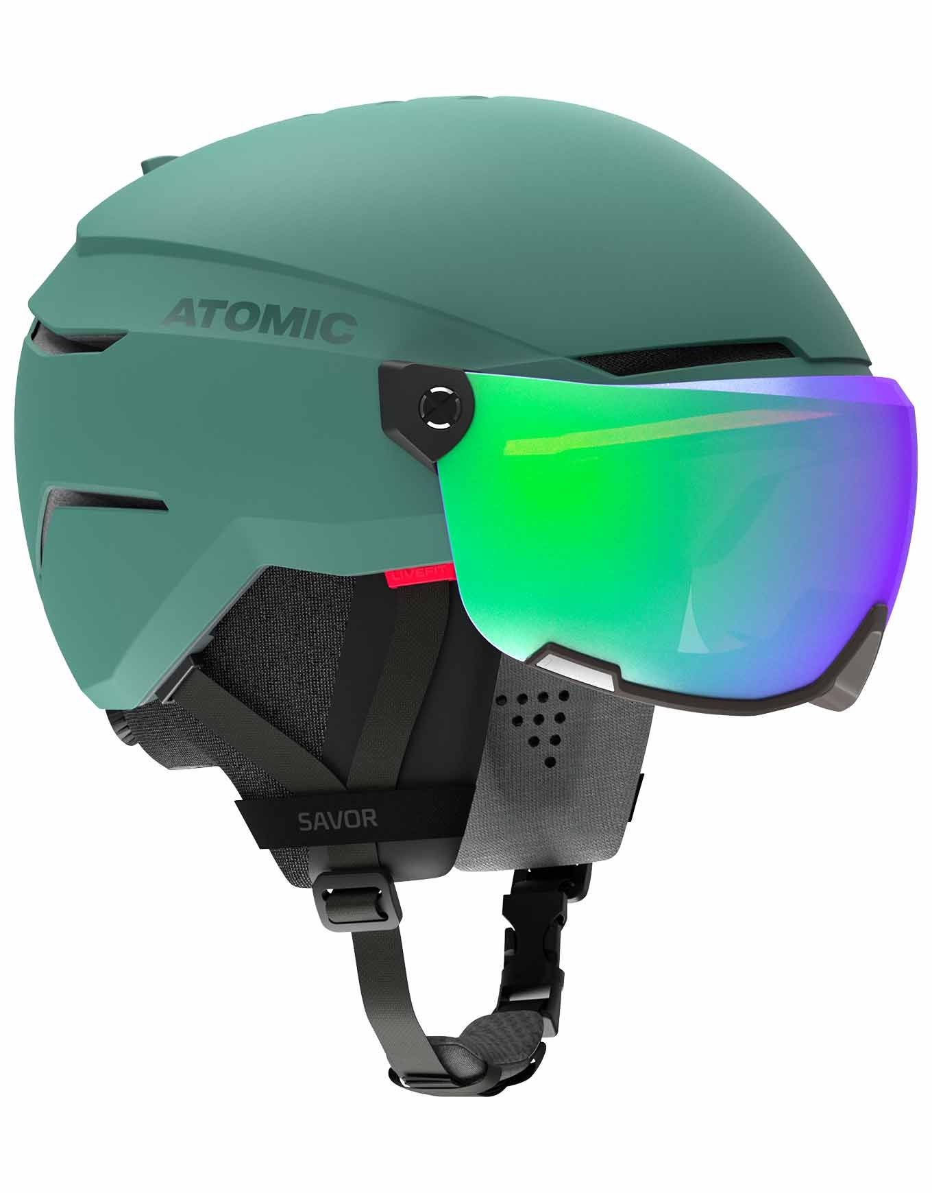 Casque de ski unisexe Atomic Savor Visor Stereo Green combinant casque et masque intégré. Structure Holo Core, mousse Live Fit, doublure Merino 3M X-Static et ventilation Aircon assurent sécurité, confort personnalisé et régulation thermique. Visière catégorie 2 Green Stereo anti-buée, anti-rayures, hydrophobe, compatible lunettes correctrices.