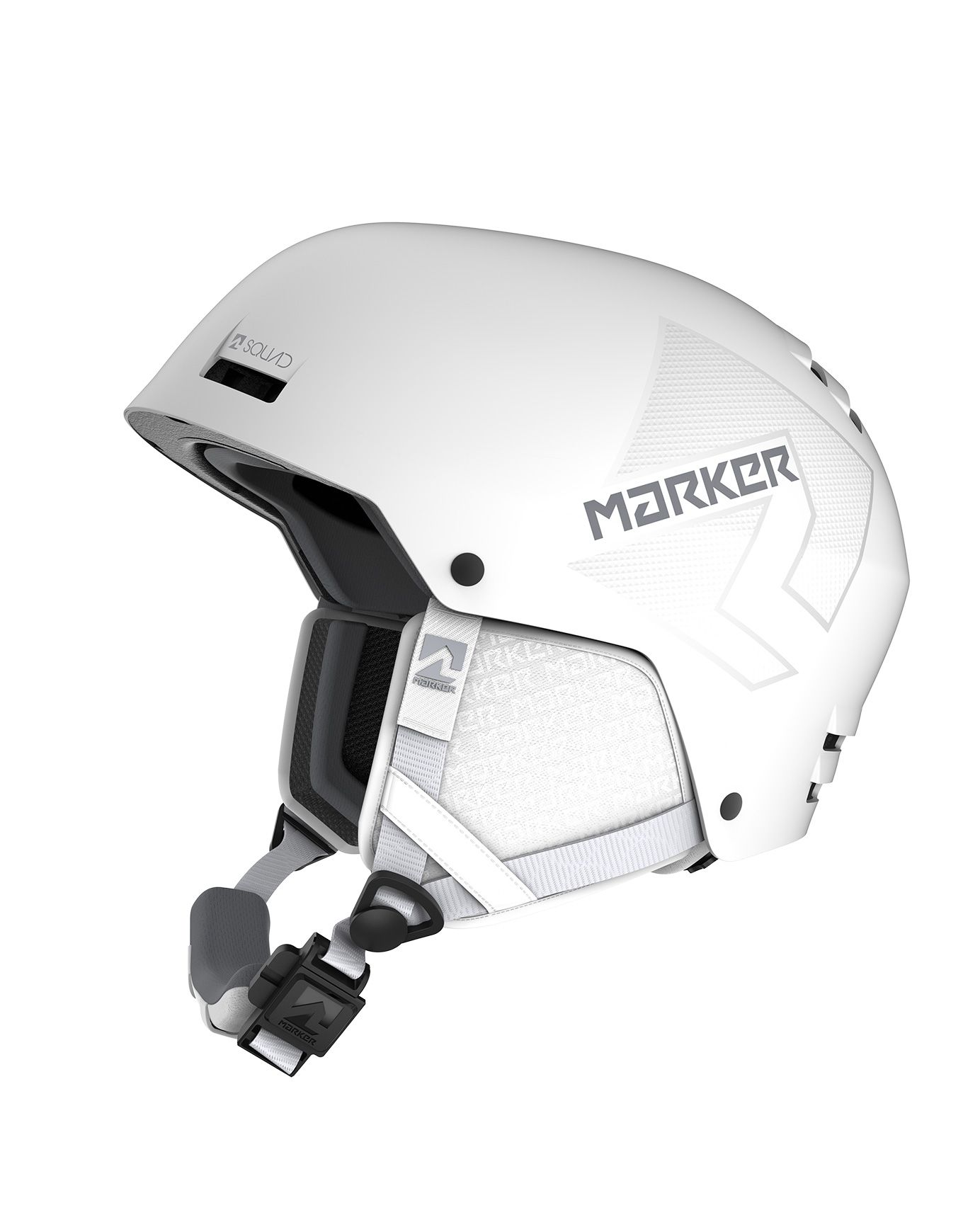 Casque de ski Marker Squad White, construction ABS Hard Shell pour une protection robuste. Aération réglable MarkAIR, fermeture Fidlock OG Snap, doublure Xdry Performance évacuant la sueur, compatible audio et bonnet.