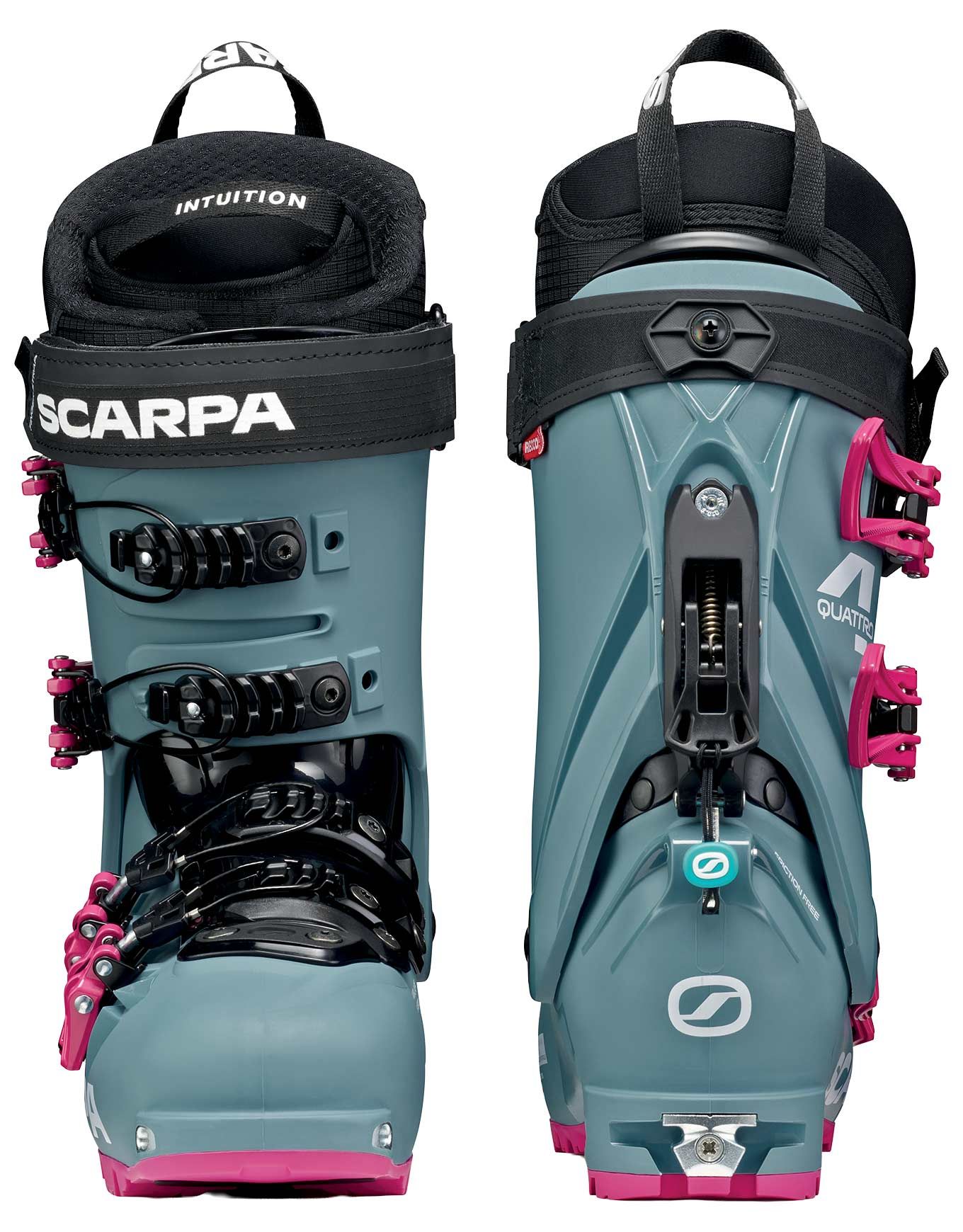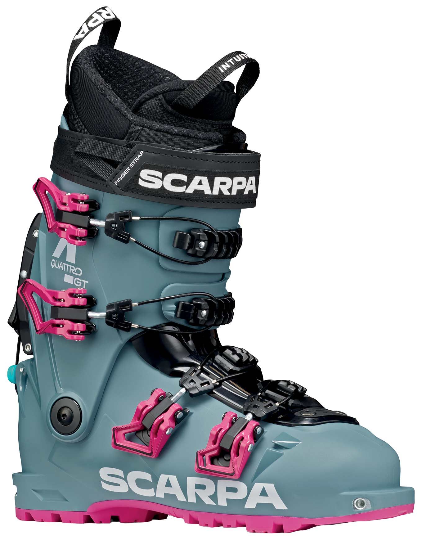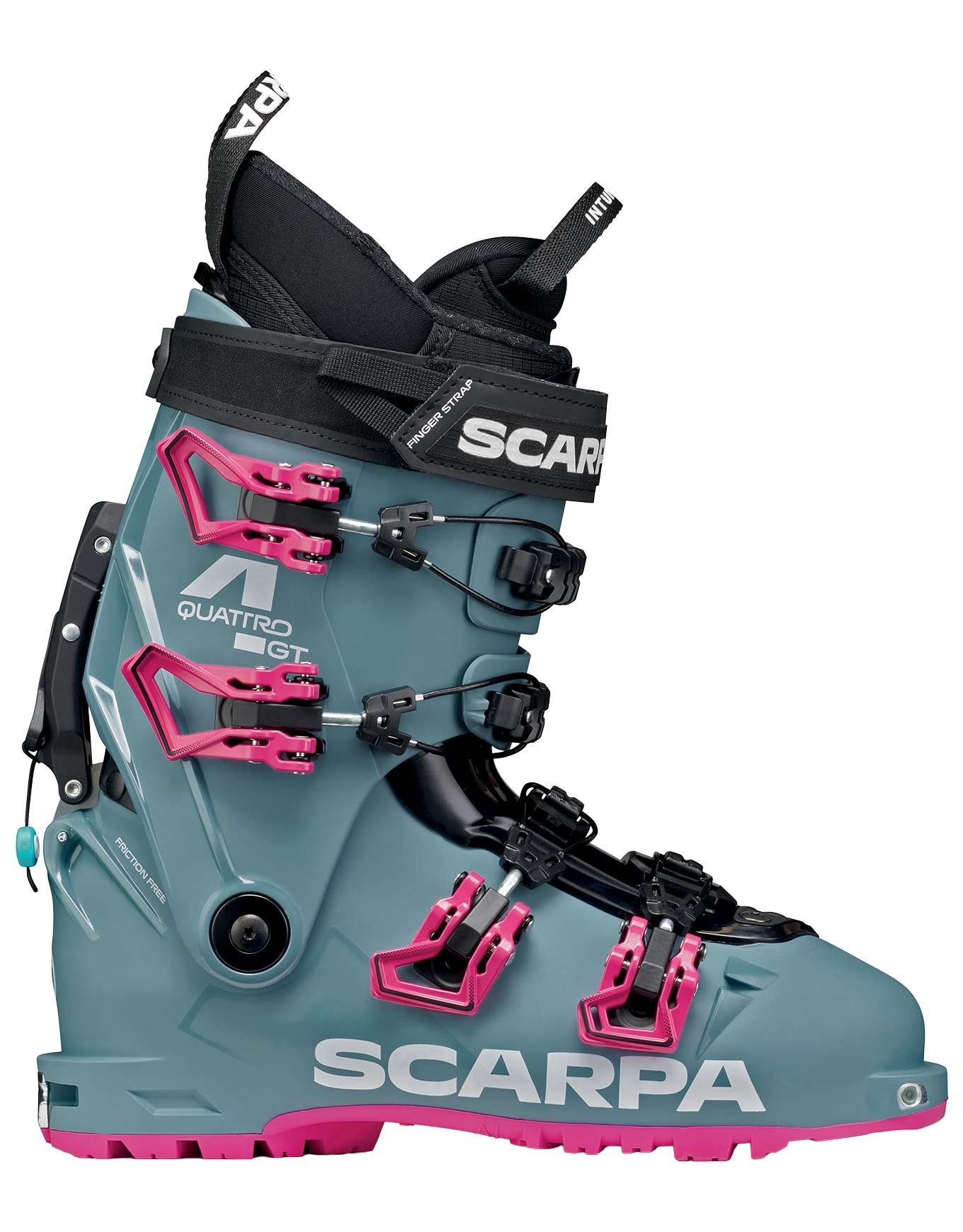 Chaussure de ski de randonnée Scarpa 4-Quattro GT Lofi Magenta femme, version la plus chaude de la gamme alliant légèreté en montée et maintien alpin en descente. Semelle Gripwalk, débattement 61°, système marche/ski aluminium, construction Alpine Axial Hybrid et biopolymères pour ajustement précis et démarche éco-durable.