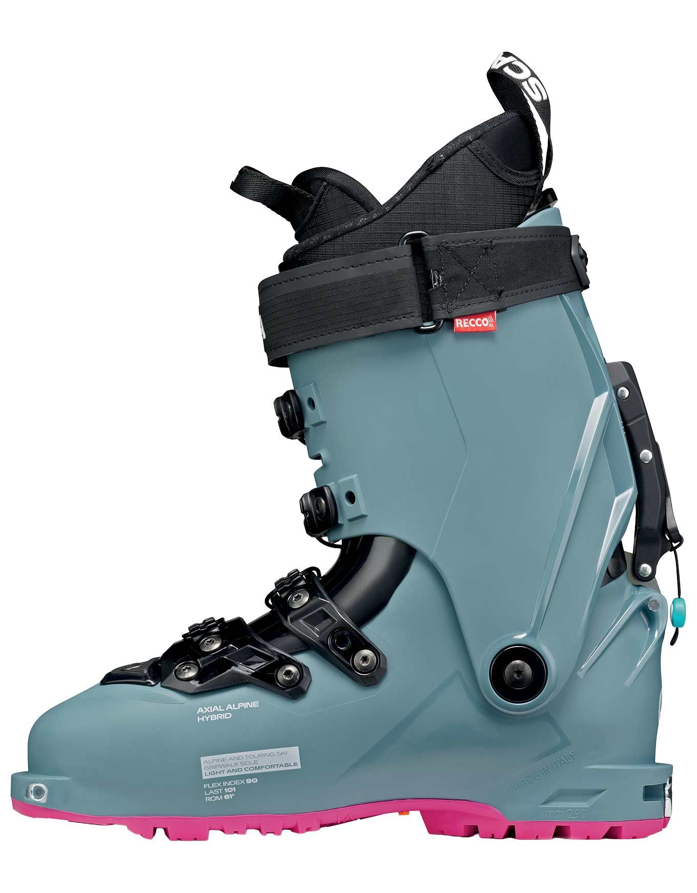 La transition immédiate entre mode marche et mode ski s’effectue grâce au nouveau mécanisme aluminium. Manipulation aisée même avec des gants garantie par le levier et la boucle aux formes ergonomiques, avec un débattement de 61 ° assurant souplesse du déroulé podal et ascensions dépourvues de toute gêne.