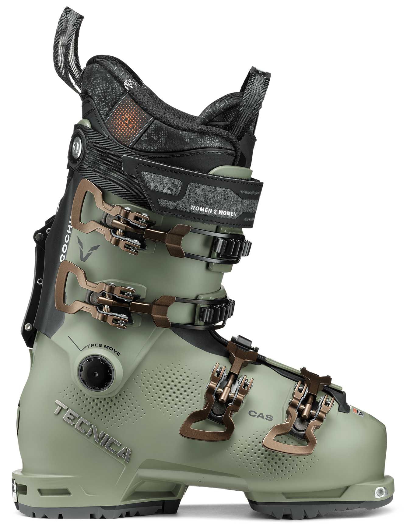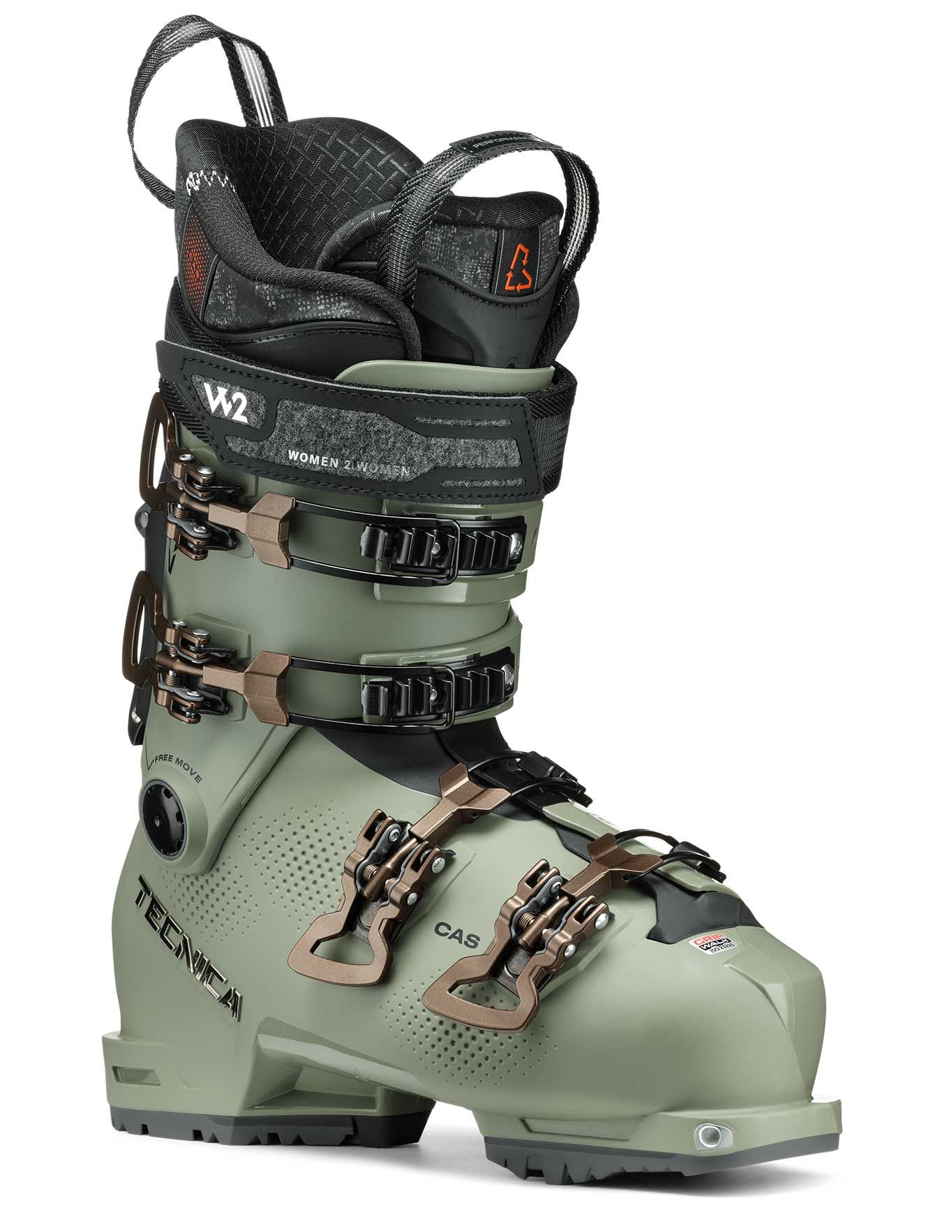 Un ajustement optimal est proposé par le chausson préformé, dont la largeur interne de 99 mm aux métatarses s’adapte à la morphologie féminine. Le confort du pied et du tibia est préservé même après de longues sessions de hors-pistes, grâce à la technologie C.A.S. – Custom Adaptive Shape.