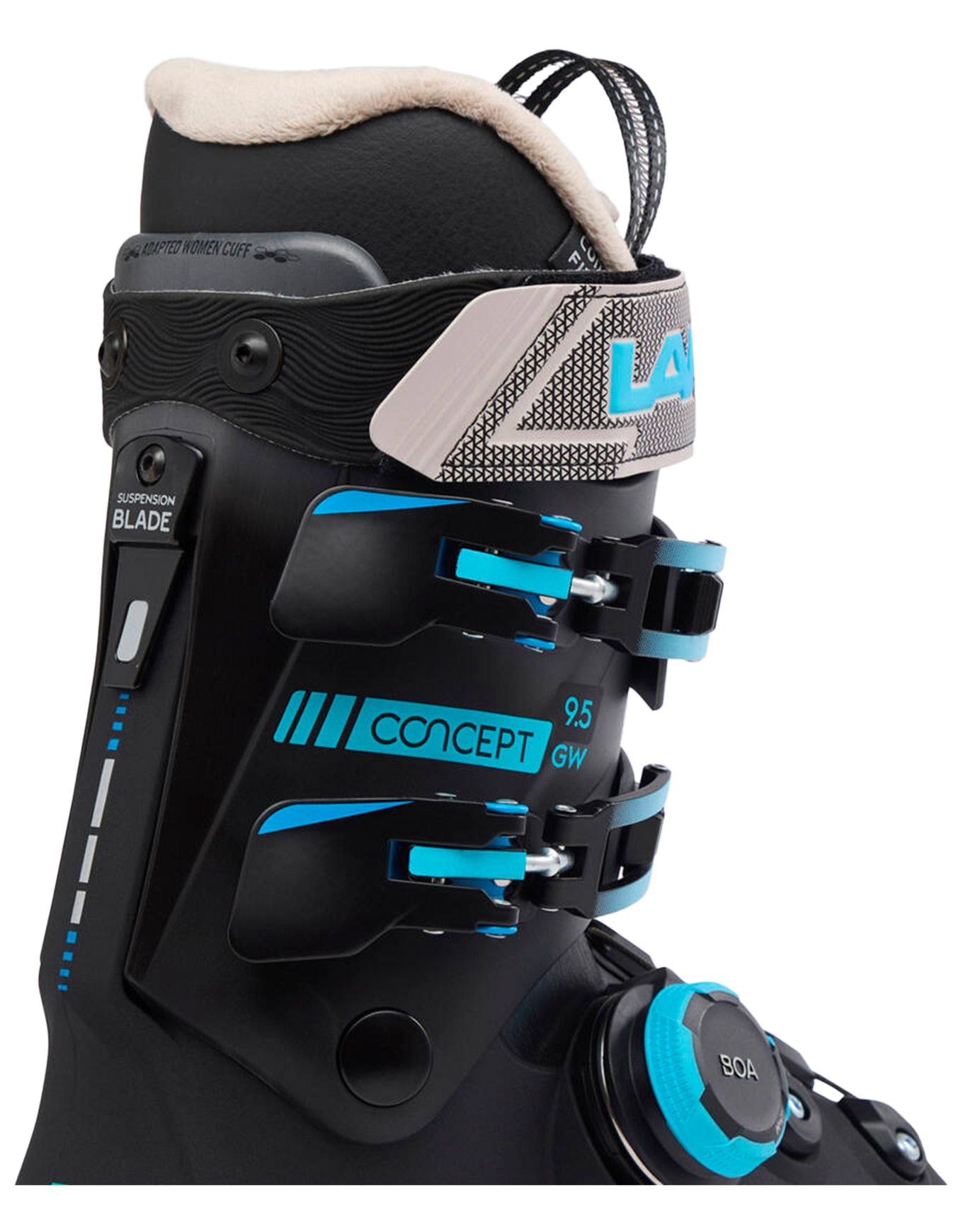 La Lange Concept 9.5 W Gw Boa est une chaussure de ski de piste femme au fit décontracté, serrage BOA® précis, chausson thermoformable 70 % et semelles GripWalk® pour confort et contrôle intermédiaire.