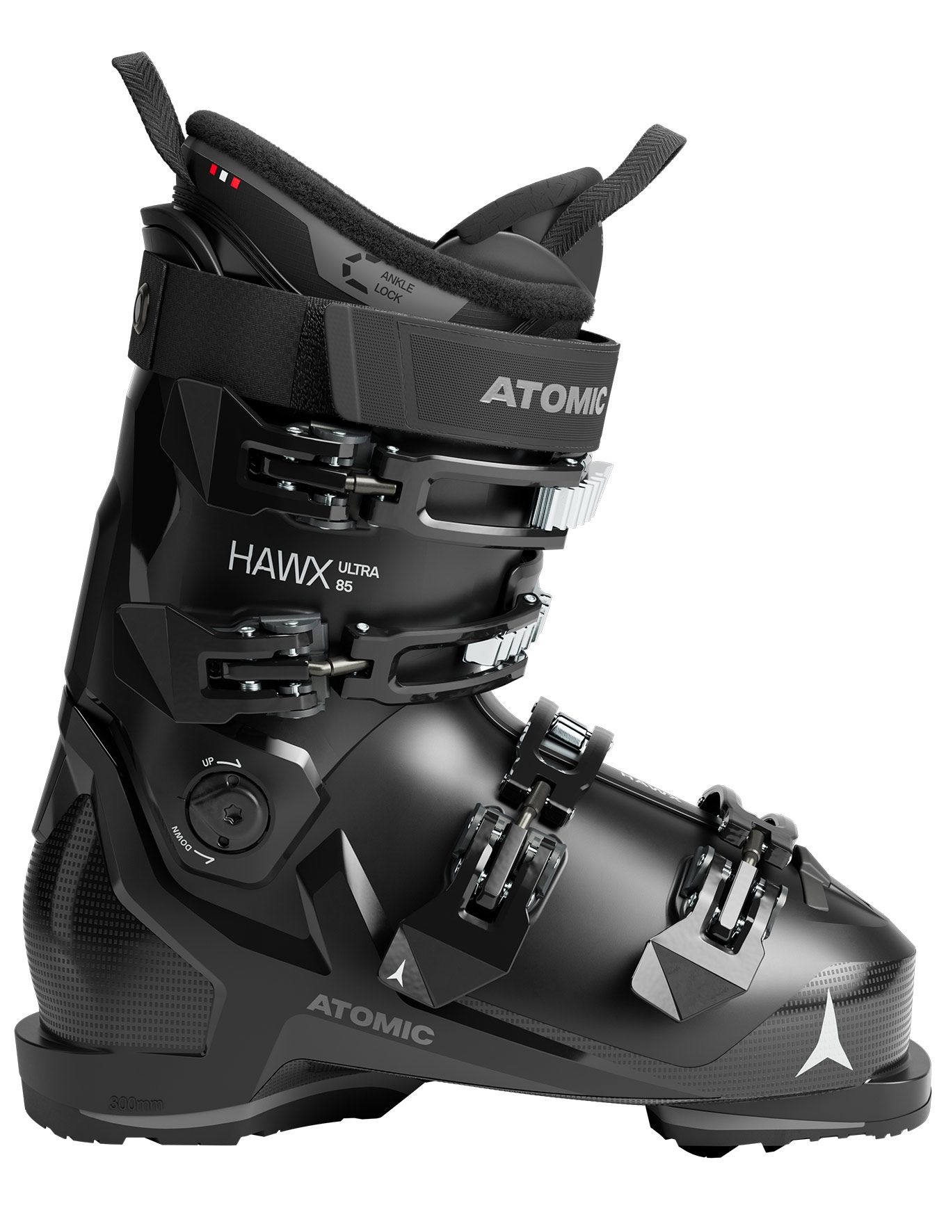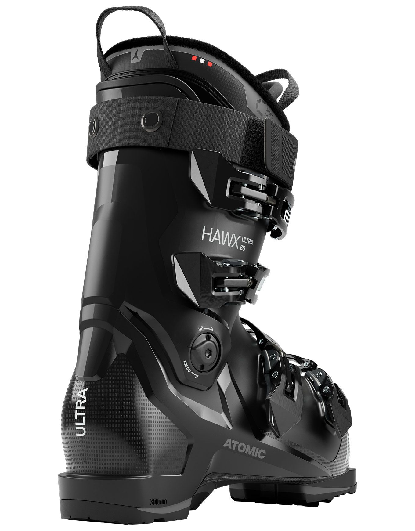 Chaussure de ski alpin femme Atomic Hawx Ultra 85 Black/Red, last 98 mm, construction Prolite légère, chausson Mimic Silver thermoformable, flex 85 confortable.