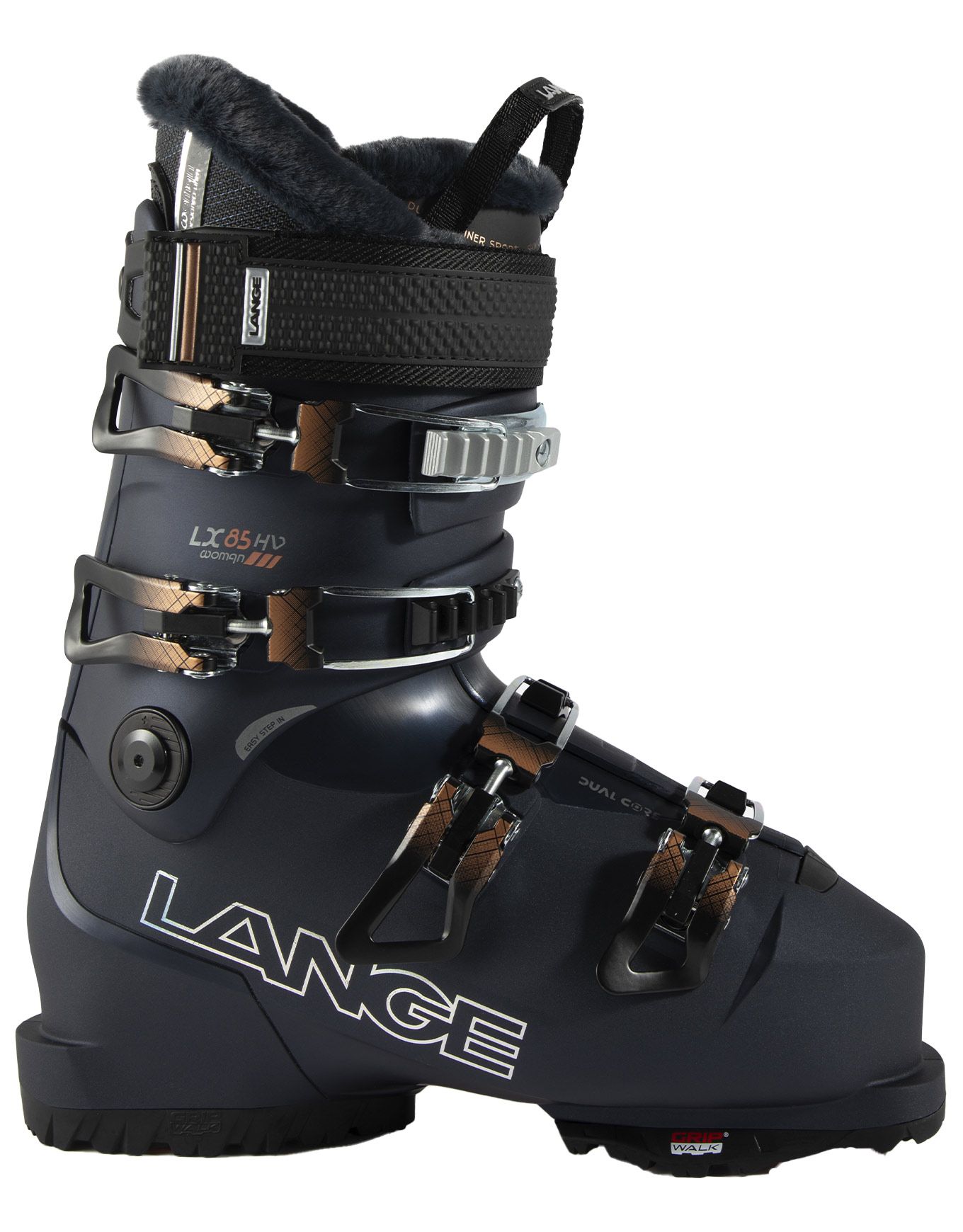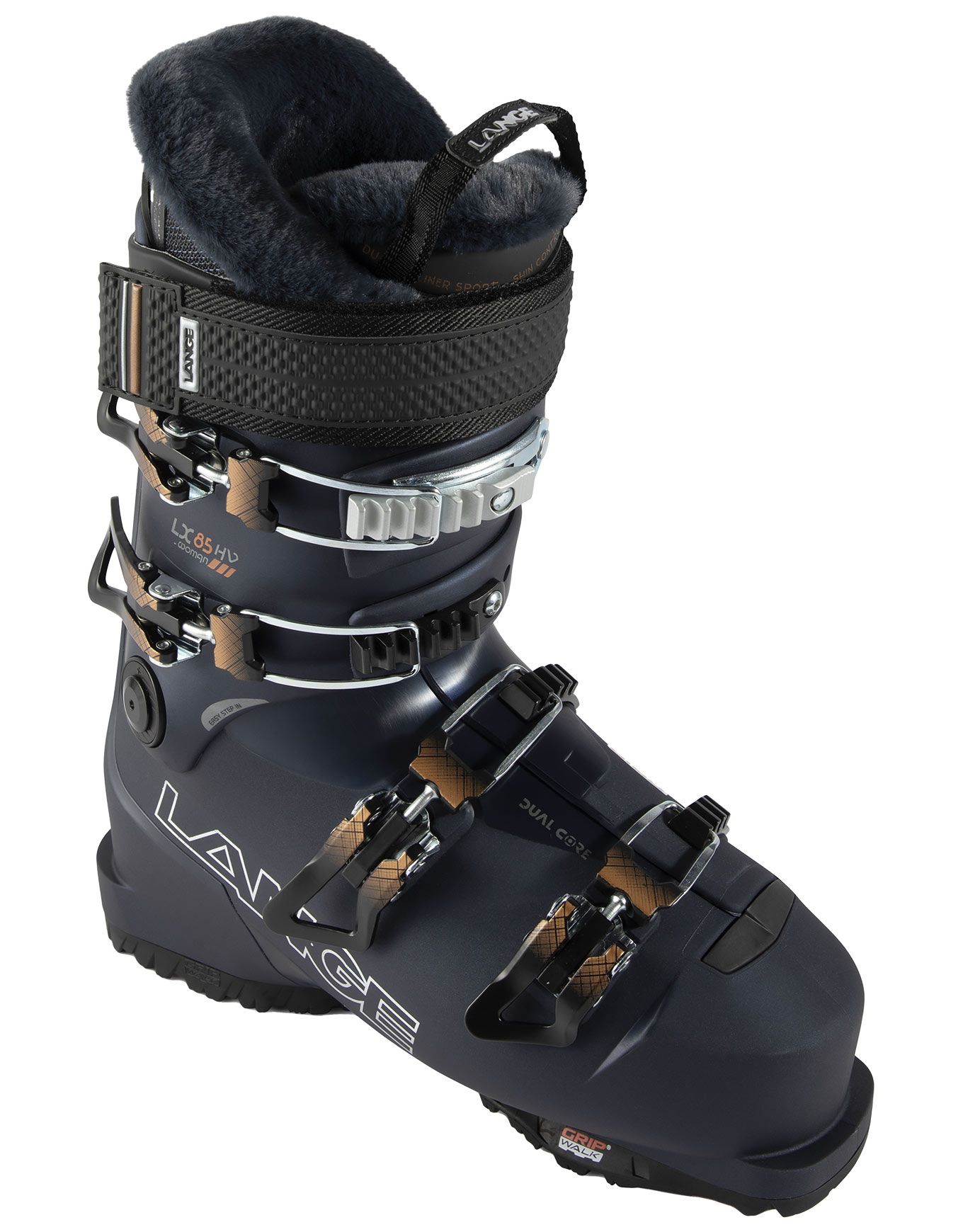 Chaussure de ski all-mountain femme Lange Lx 85 W Hv Gw, last 102 mm, flex 85, chausson Dual 3D thermoformable, construction Dual Core pour puissance et contrôle, confort maximal sans compromis performance.
