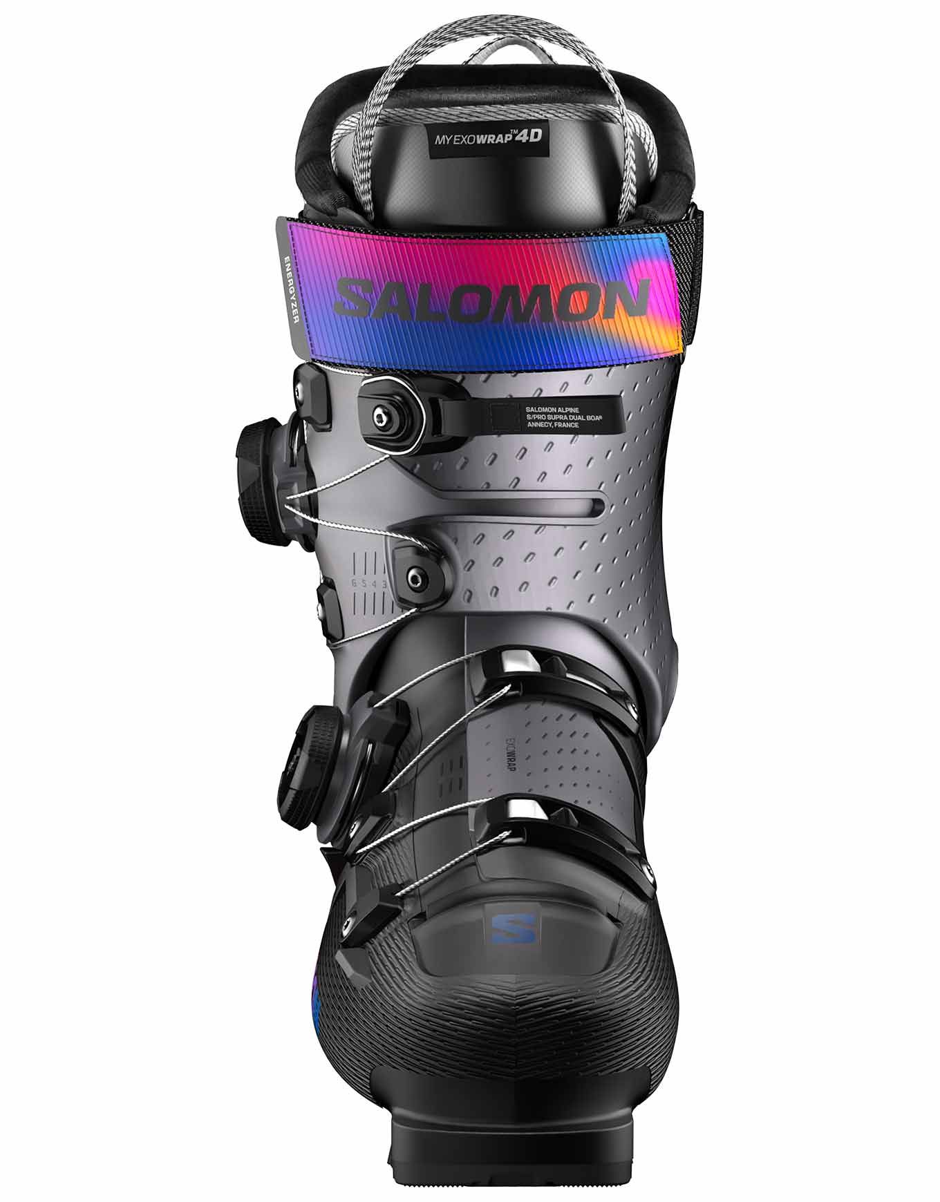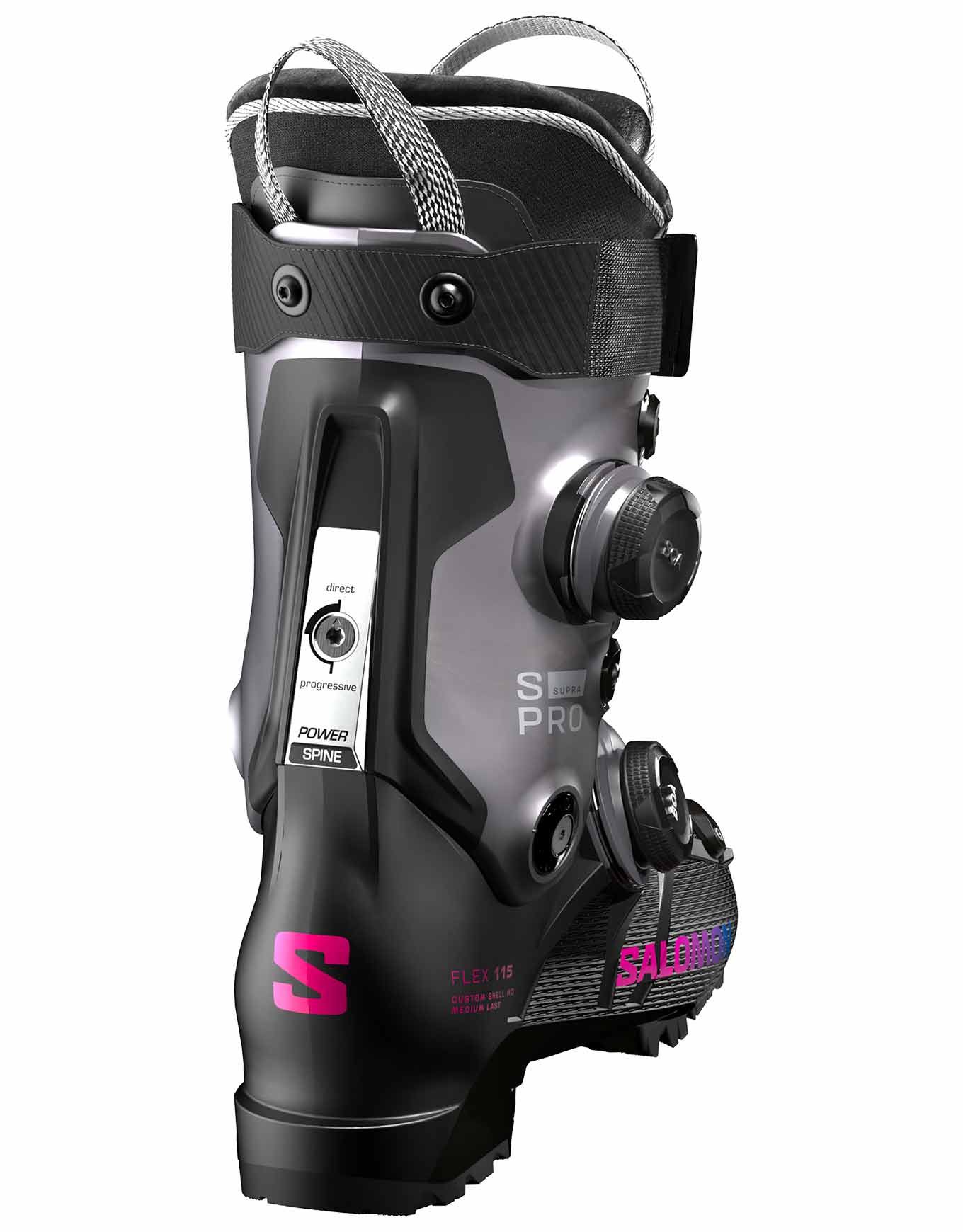 Chaussure de ski femme Salomon S/Pro Supra Dual Boa 115, flex 115 et last 100-106 mm, combinant puissance et confort grâce au fit Custom Shell HD, au chausson My Exowrap 4D Perf et au serrage Dual Boa précis.