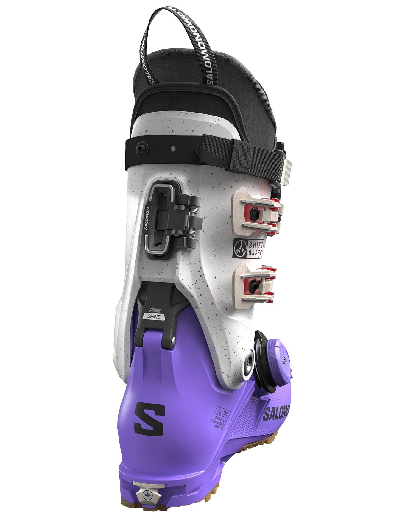 Chaussure de ski all-mountain Salomon Shift Alpha Boa 130 Ultra Violet/Black/Black, flex 130 et chausson My CustomFit Freeride 4D Pro pour skieurs experts. Semelle GripWalk, mécanisme TwinLock ski/marche, BOA® Fit System : puissance, précision et confort sur piste comme en freerando, 1800 g.