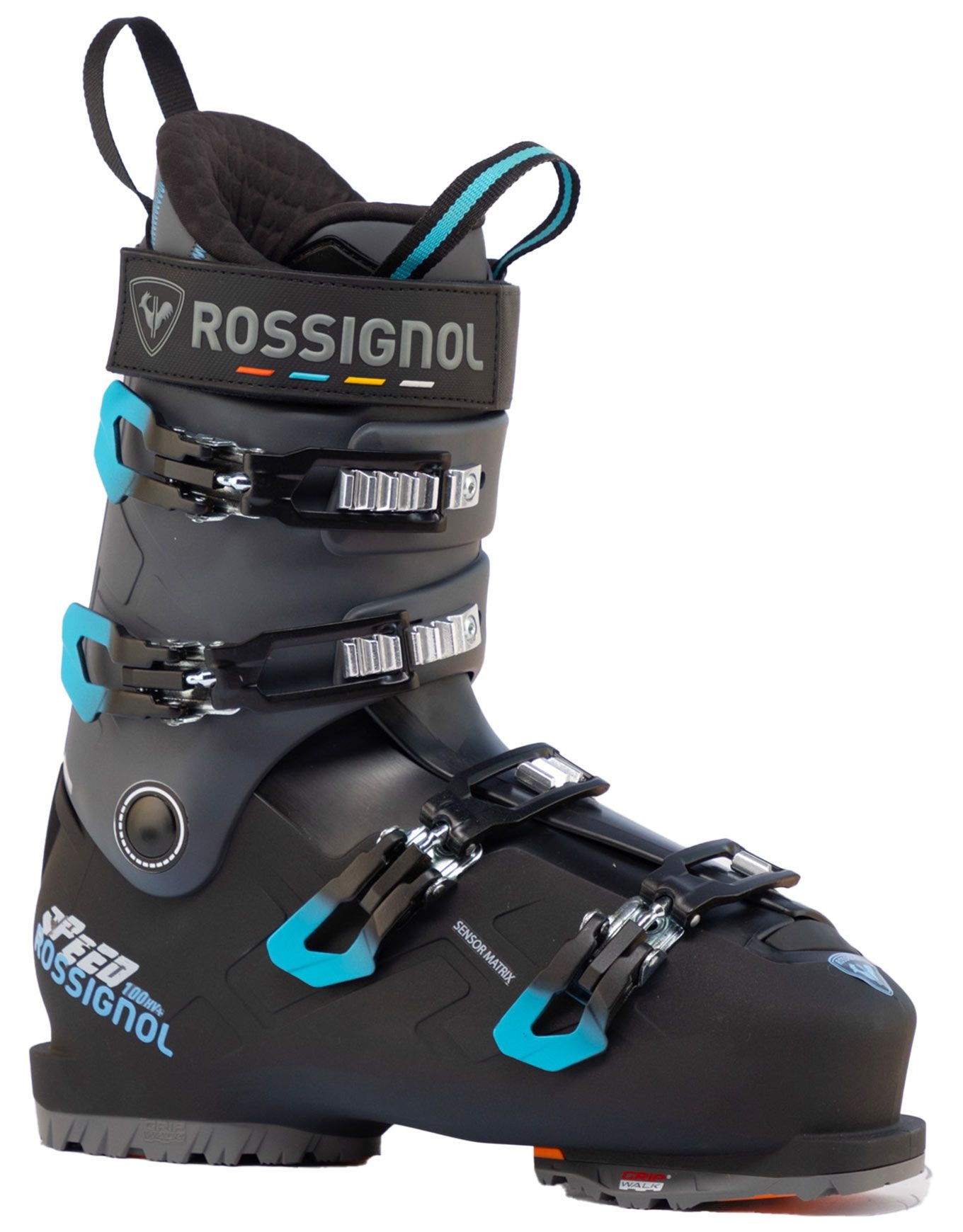 Chaussure de ski homme Rossignol Speed 100 HV+ conçue pour les skieurs intermédiaires sur piste, avec chausson Full Custom Liner thermoformable, flex 100 tolérant, chausstant large 104 mm et 4 crochets pour un maintien fiable.