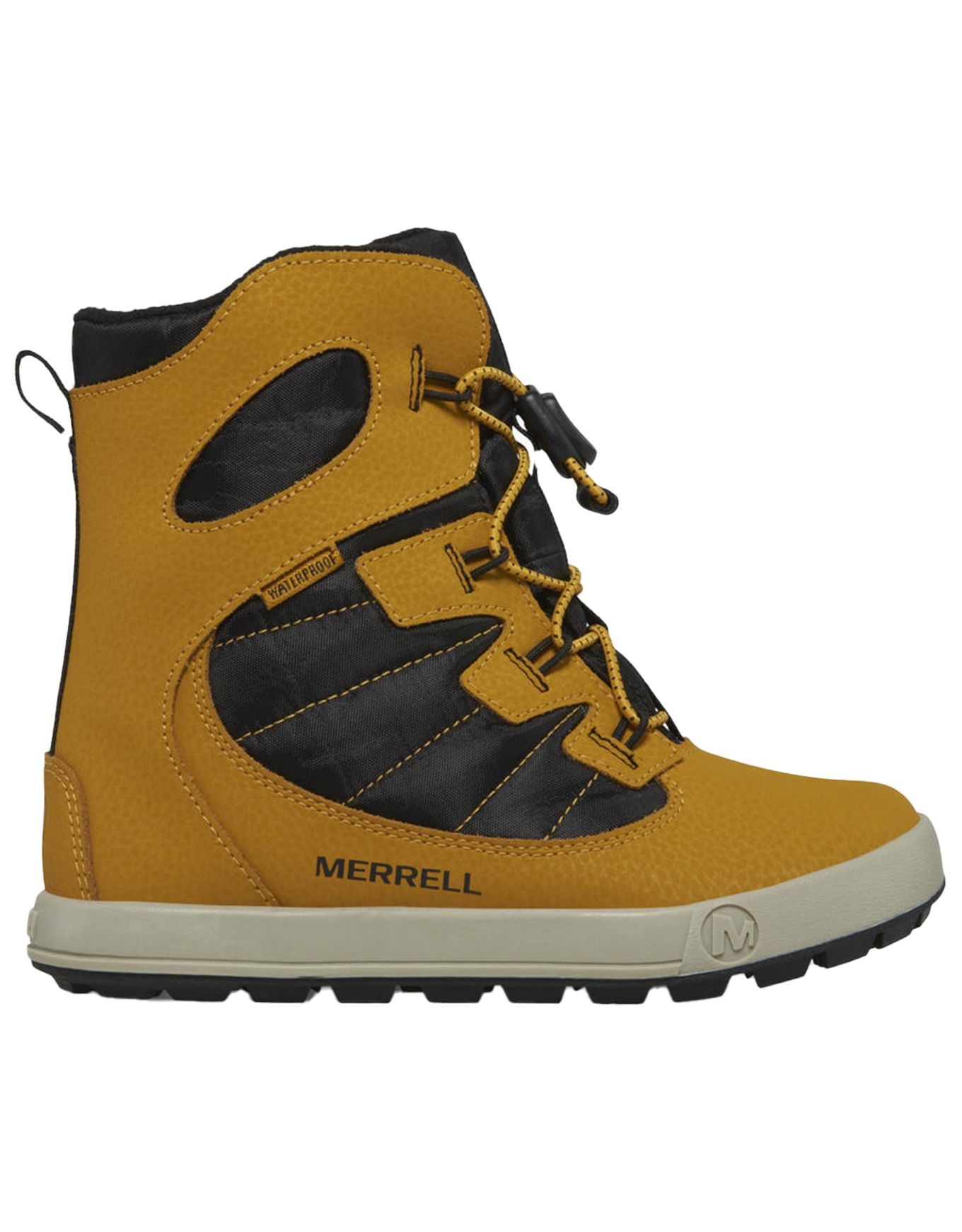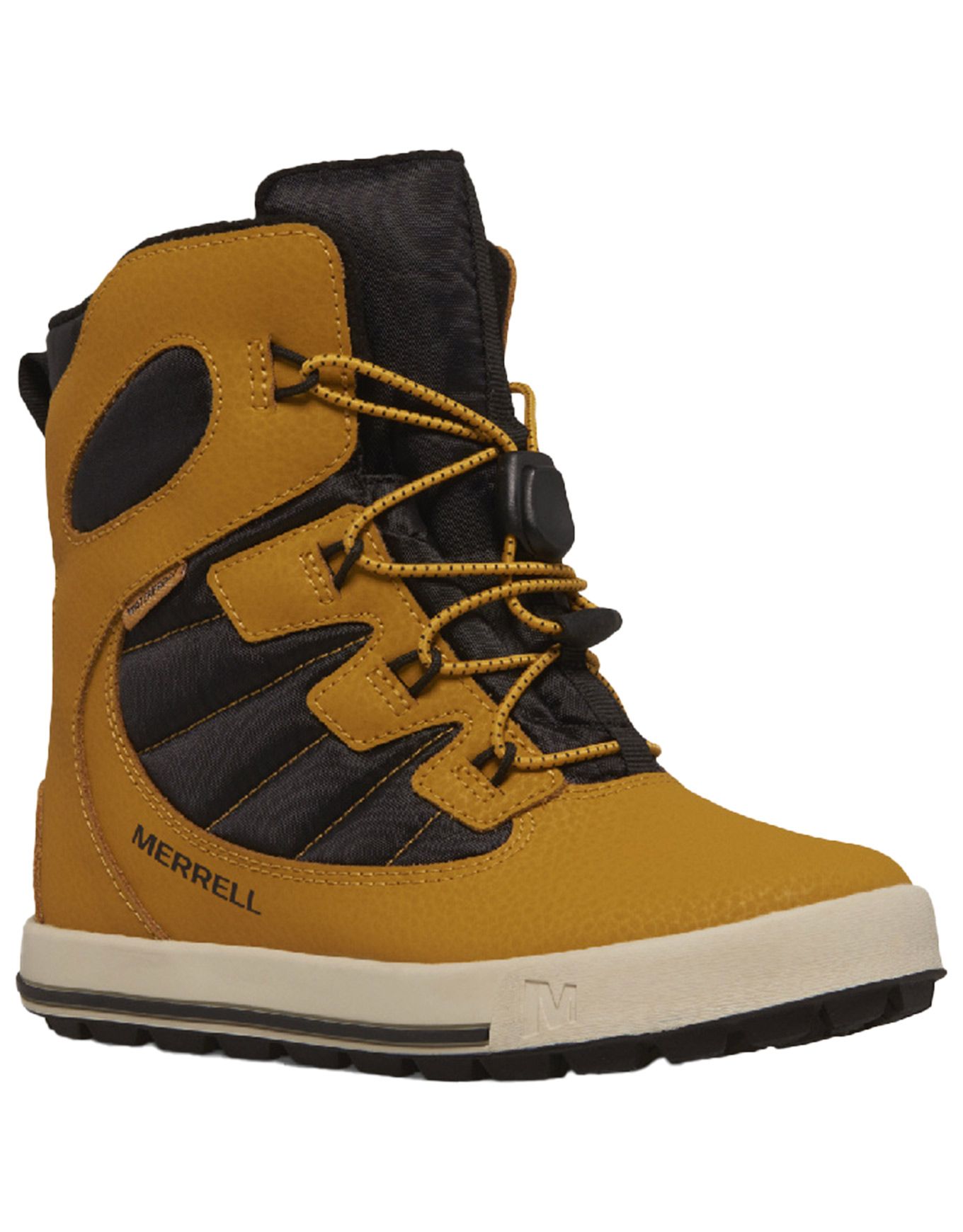 Botte enfant hiver Merrell Snow Bank 4.0 WP : imperméable synthétique, fermeture brandebourgs, chaleur jusqu’à -25 °C, semelle adhérente neige/glace.