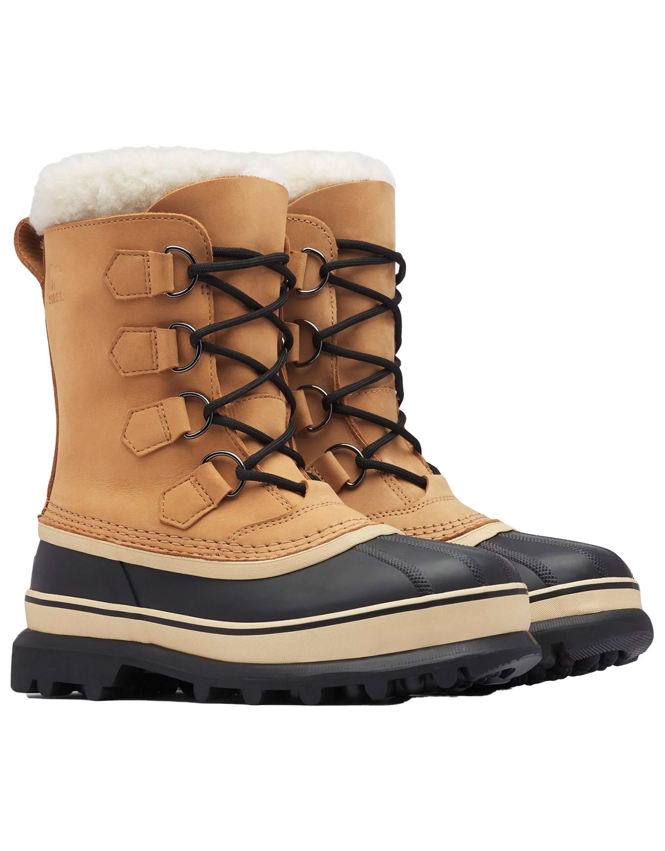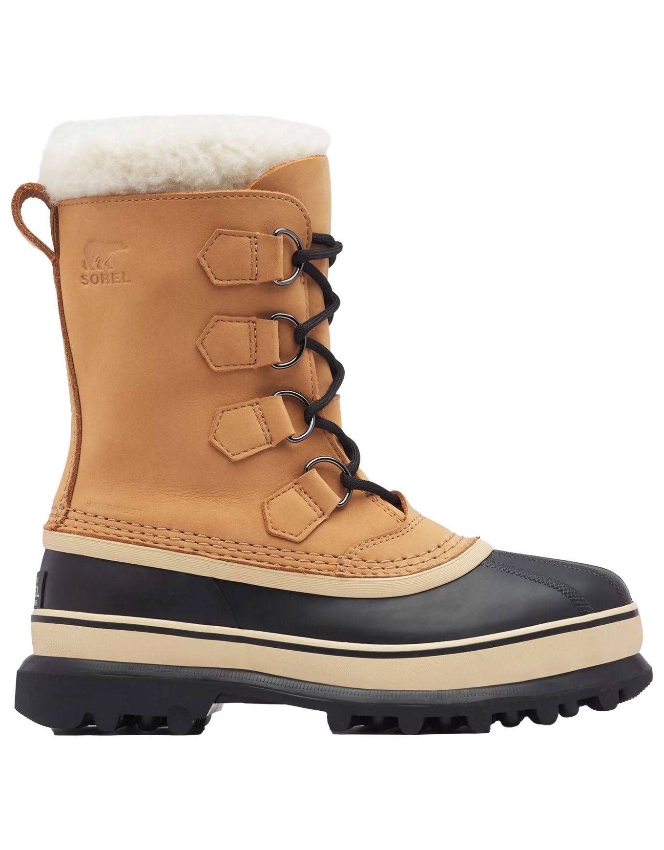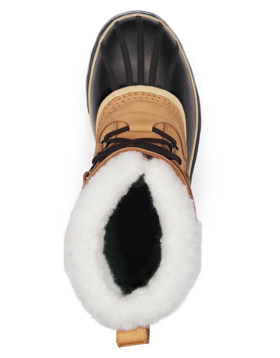 Bottes hiver Sorel Caribou WP Buff femme : cuir nubuck imperméable, coque caoutchouc vulcanisé, chausson feutre ThermoPlus® 9 mm amovible, semelle AeroTrac, confort jusqu’à -40°C.