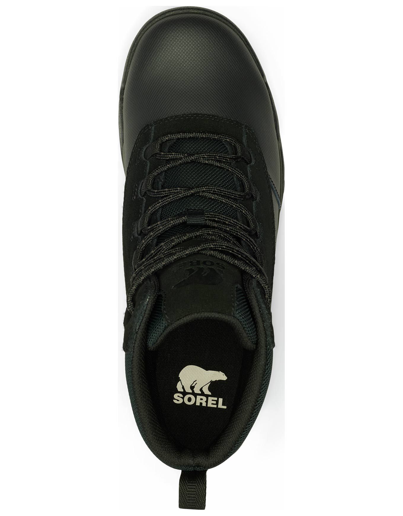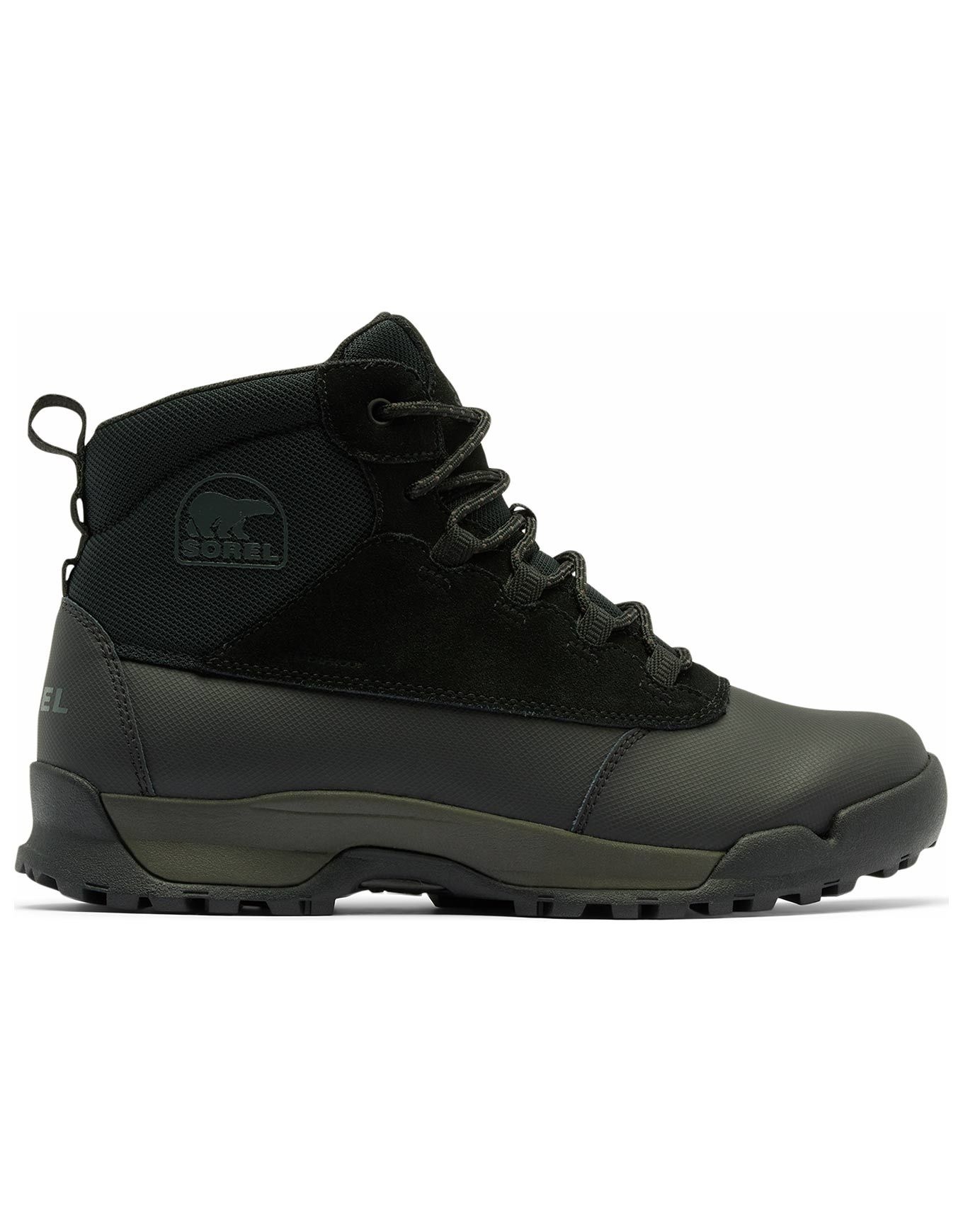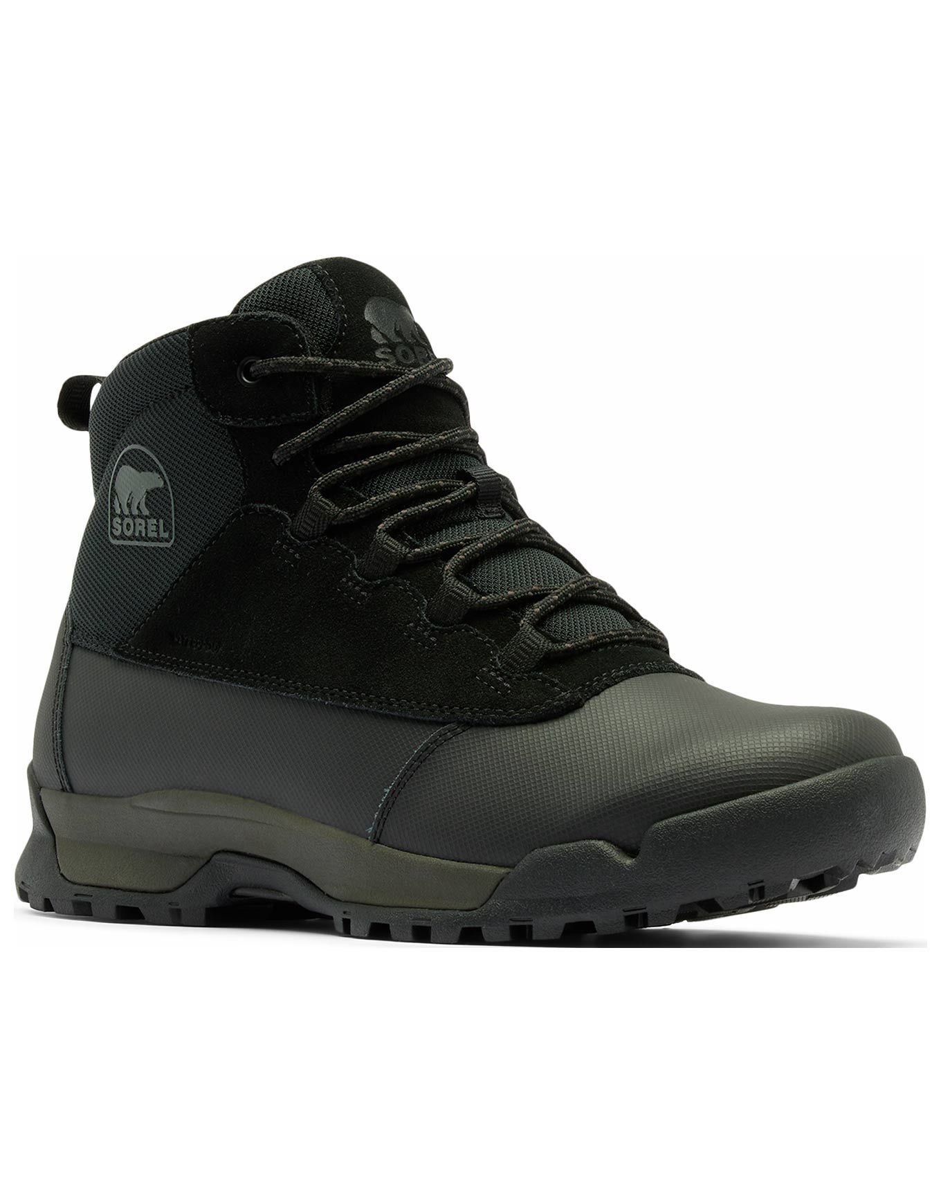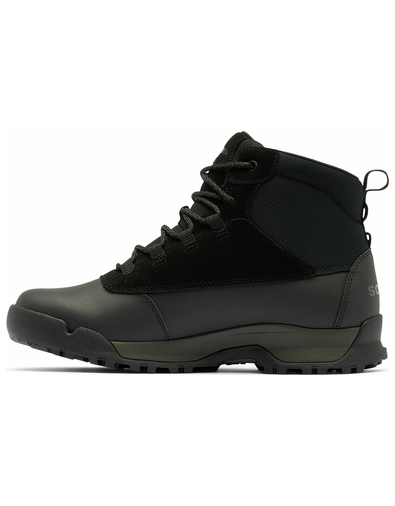 Bottes de randonnée Sorel Buxton Lite Lace Plus WP Black Black pour homme, imperméables et isolées 200 g, combinant textile, cuir synthétique et suédine pour chaleur et protection par temps froid, avec semelle intérieure EVA amovible, intercalaire absorbante et semelle extérieure caoutchouc adhérente.