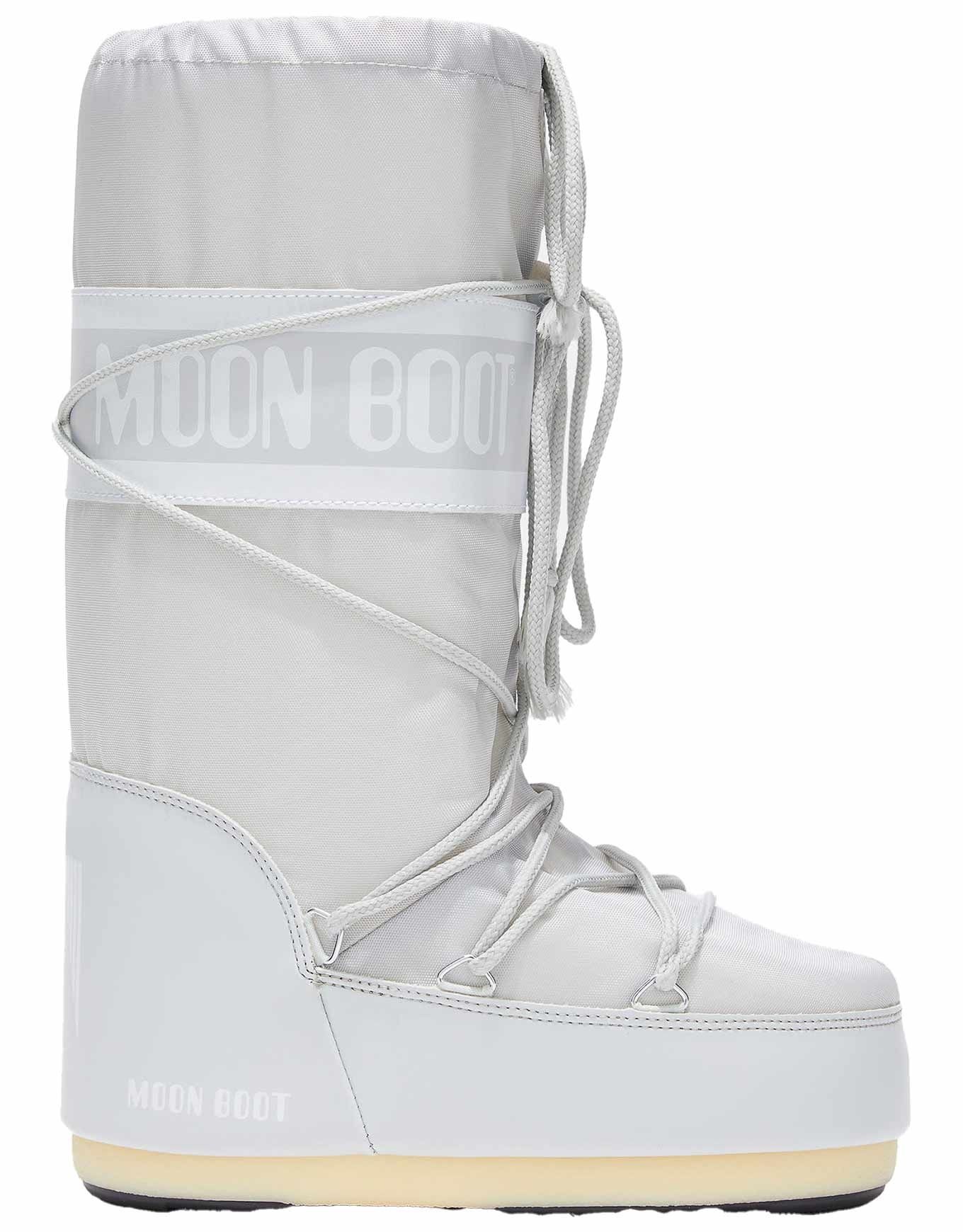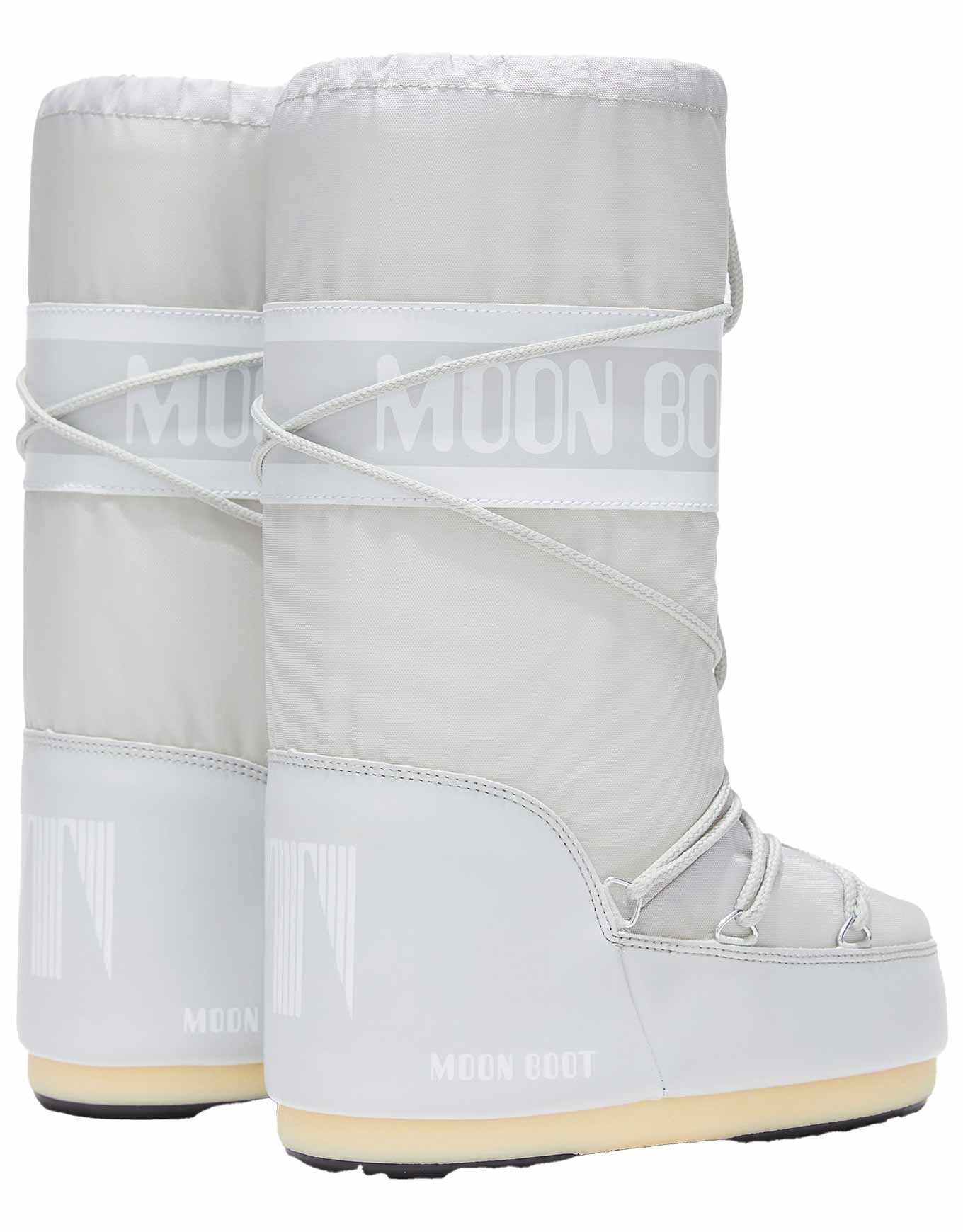 Moon Boot Icon Nylon Glacier Grey, après-ski unisexe imperméable et isolant, allie style rétro, chaleur et confort pour les journées d’hiver en montagne.
