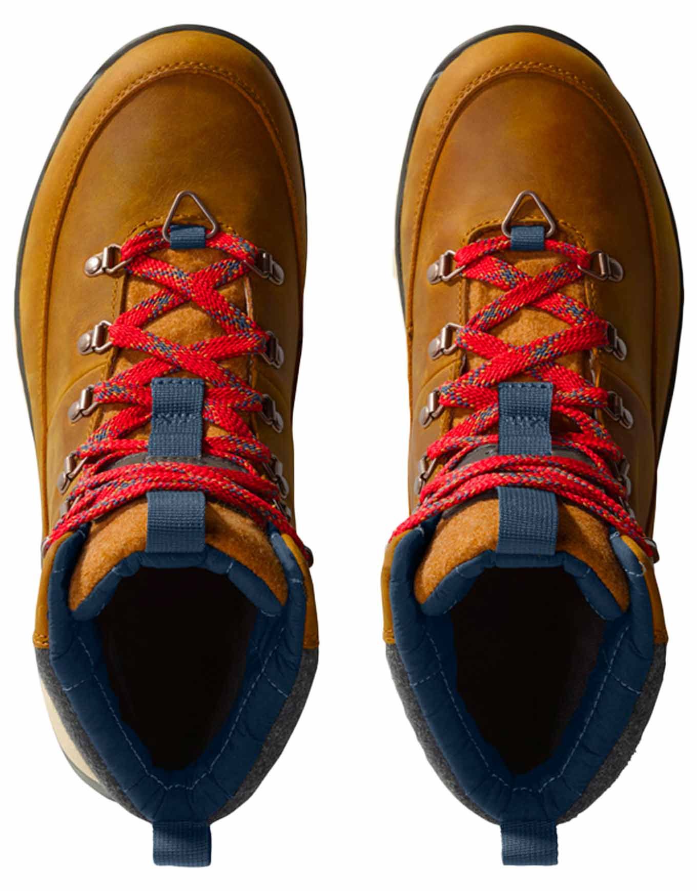 The North Face Bergen Leather WP Timber Tan/Red sont des bottes hiver imperméables pour homme, chaudes avec isolation Heatseeker™ Eco, semelle SurfaceCTRL™ grip, renfort orteils et lacets métal pour chaussage ganté.