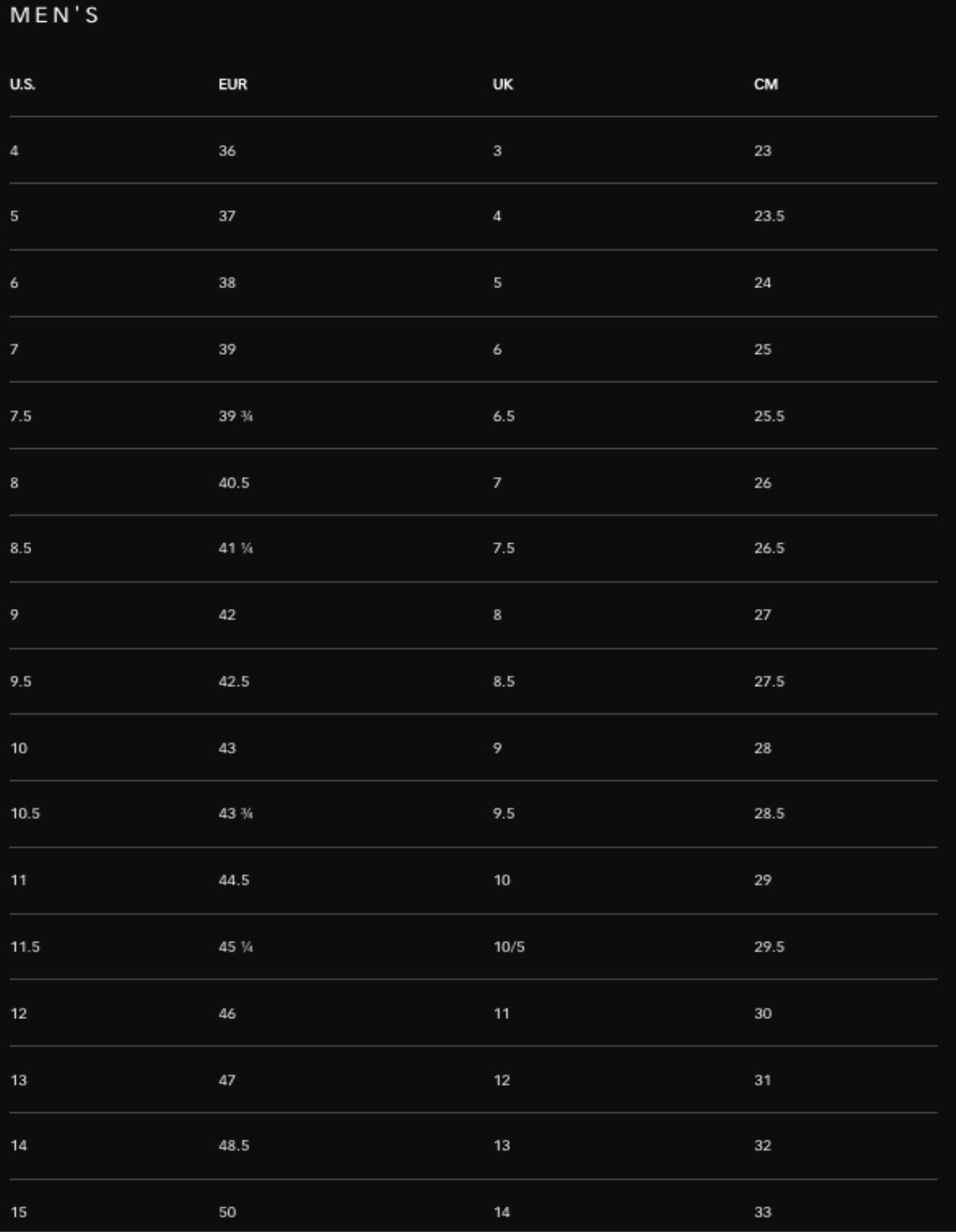 | Taille | 39 (7 US), 40,5 (8 US), 42 (9 US), 43 (10 US), 44,5 (11 US), 46 (12 US), 47 (13 US) |
