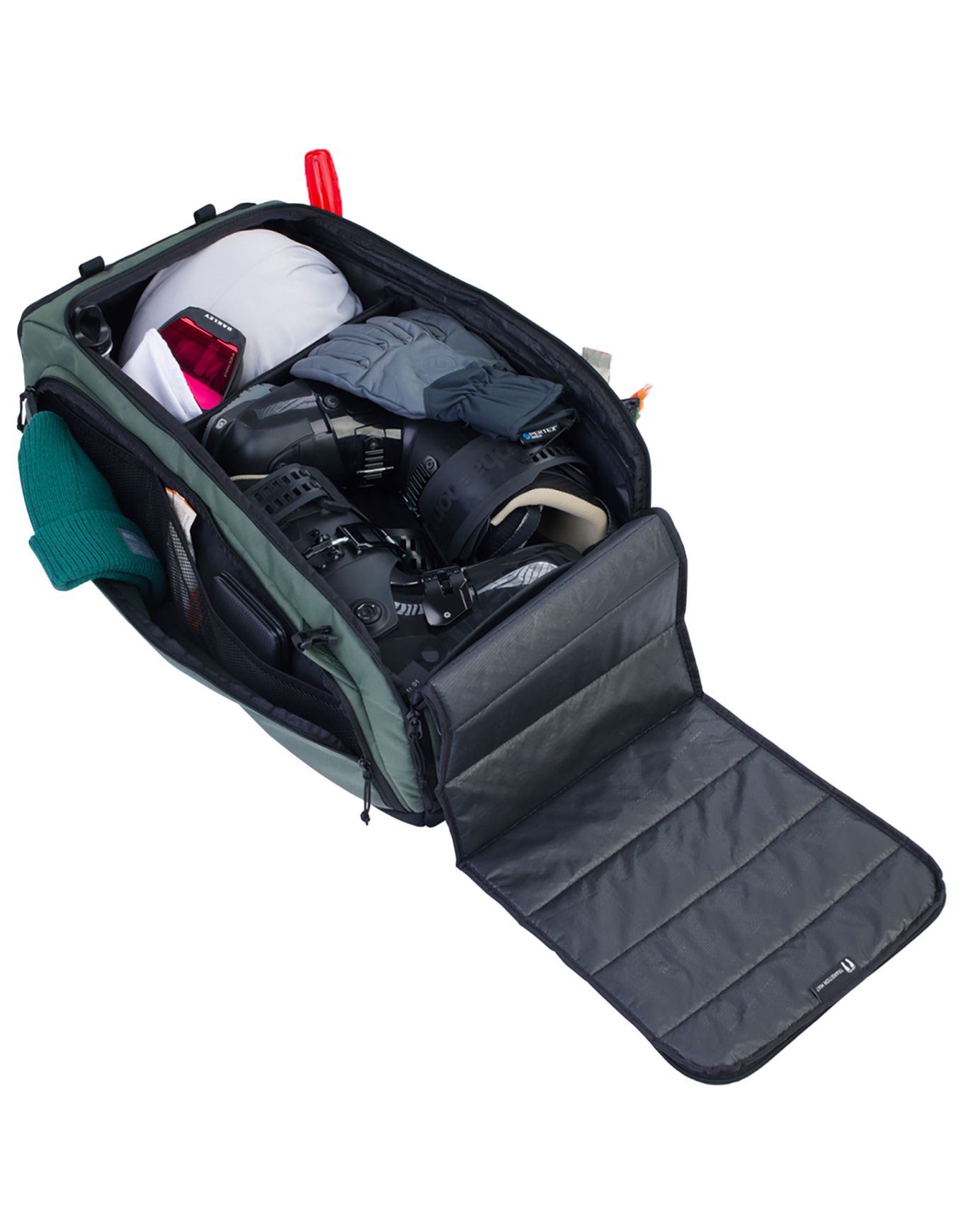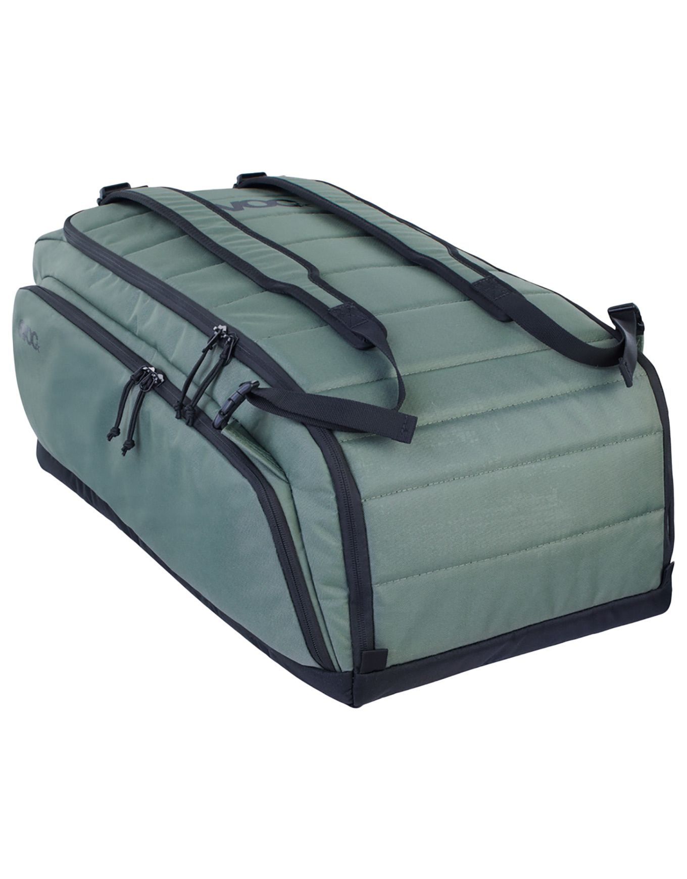 Sac à dos Gear Bag 55 Dark Olive signé Evoc, 55 L en polyester robuste, accès haut et arrière, séparateurs hydrophobes, bretelles rembourrées, idéal transport ski ou boots.
