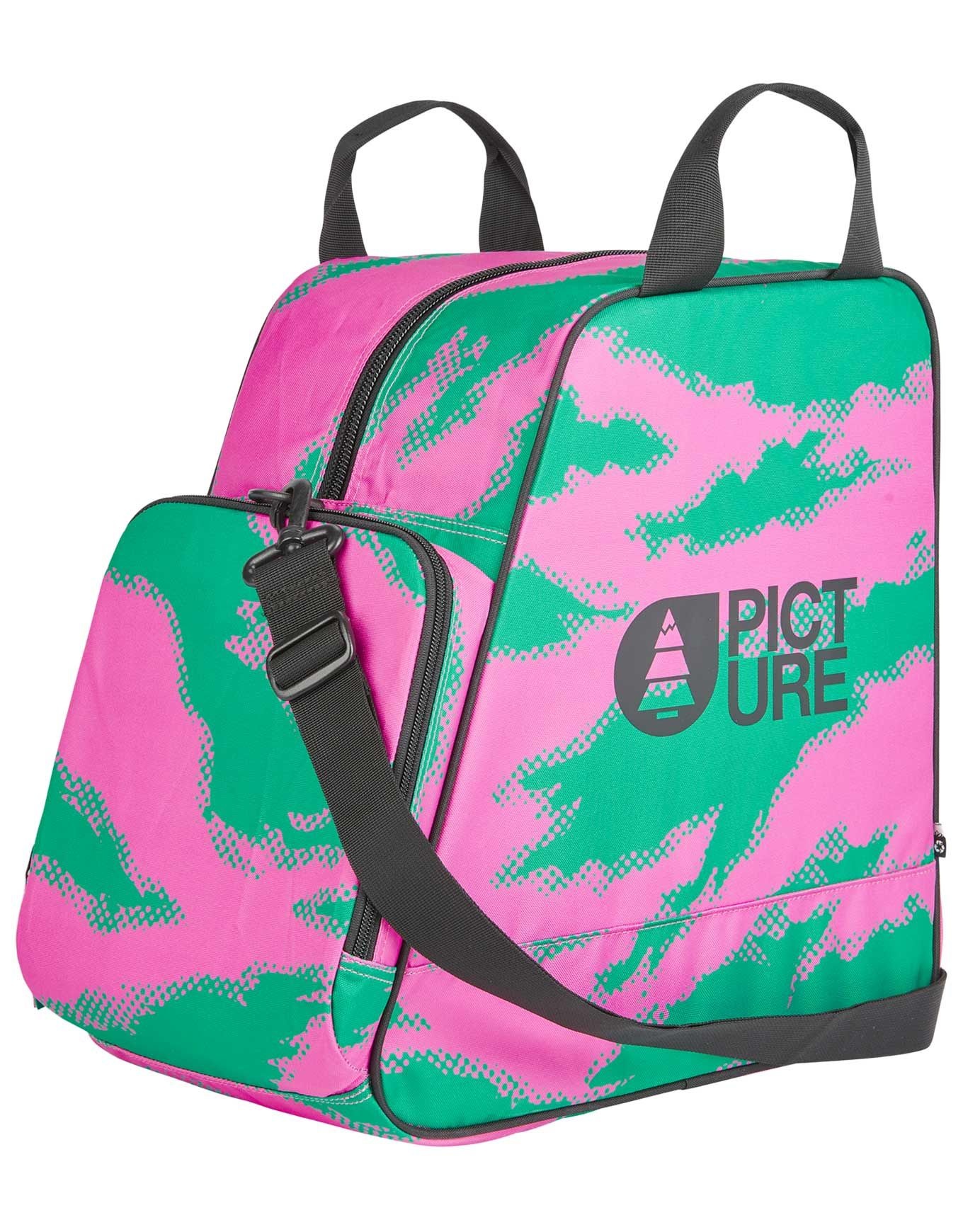 Le Shoes Bag Retro Bliss Print unisexe de Picture Organic Clothing protège et transporte vos chaussures de ski ou boots de snowboard. Compact avec grande poche avant et poignée à main, il se range facilement dans le sac à dos.