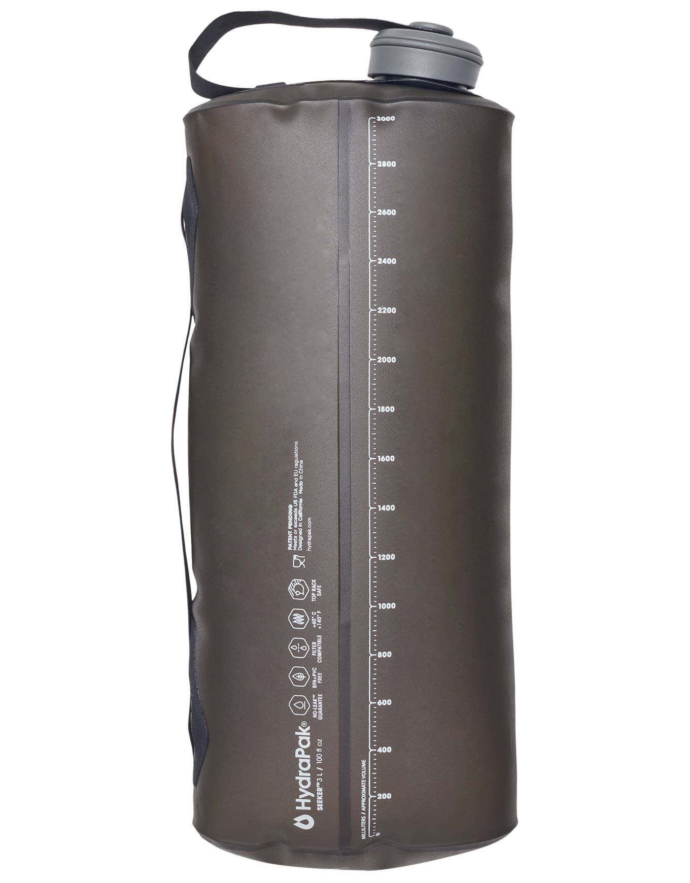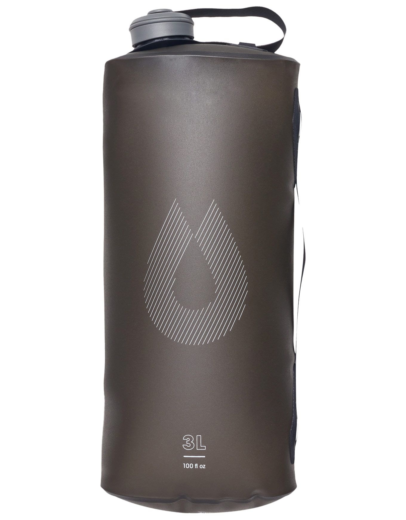 Bidon ultraléger Seeker 3L Mammoth Grey de Hydrapak en TPU, 3 L, se plie, compatible filtre 42 mm, anse et points d’attache, graduation, congélation et eau chaude possibles.