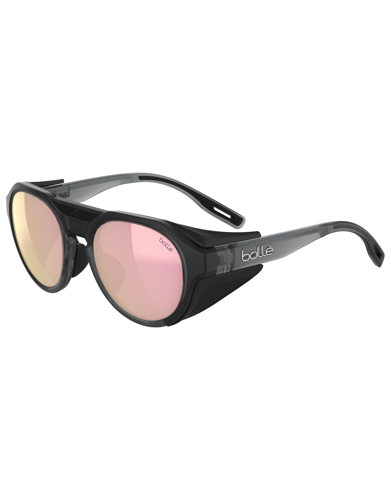 Lunettes de soleil Bollé Ascender Grey Frost – Brown Pink Polarised, catégorie 3, verres polycarbonate polarisés, monture ronde nylon Rylsan® biosourcé, coques latérales amovibles, Thermogrip® réglable, conçues pour la haute montagne.