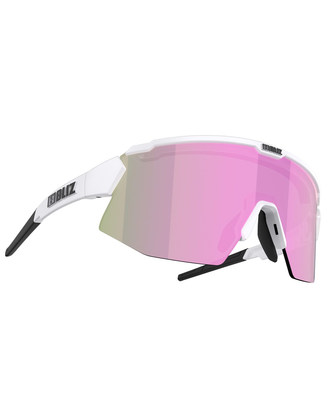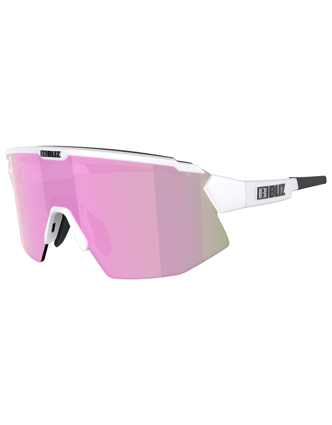 Les lunettes de soleil Bliz Breeze Small Matt White Brown w Rose Multi, à demi-monture sportive, associent un verre bicolore catégorie 3 polycarbonate réduisant les reflets à un verre transparent catégorie 0, réglables par pad nasal et branches interchangeables avec bandeau.