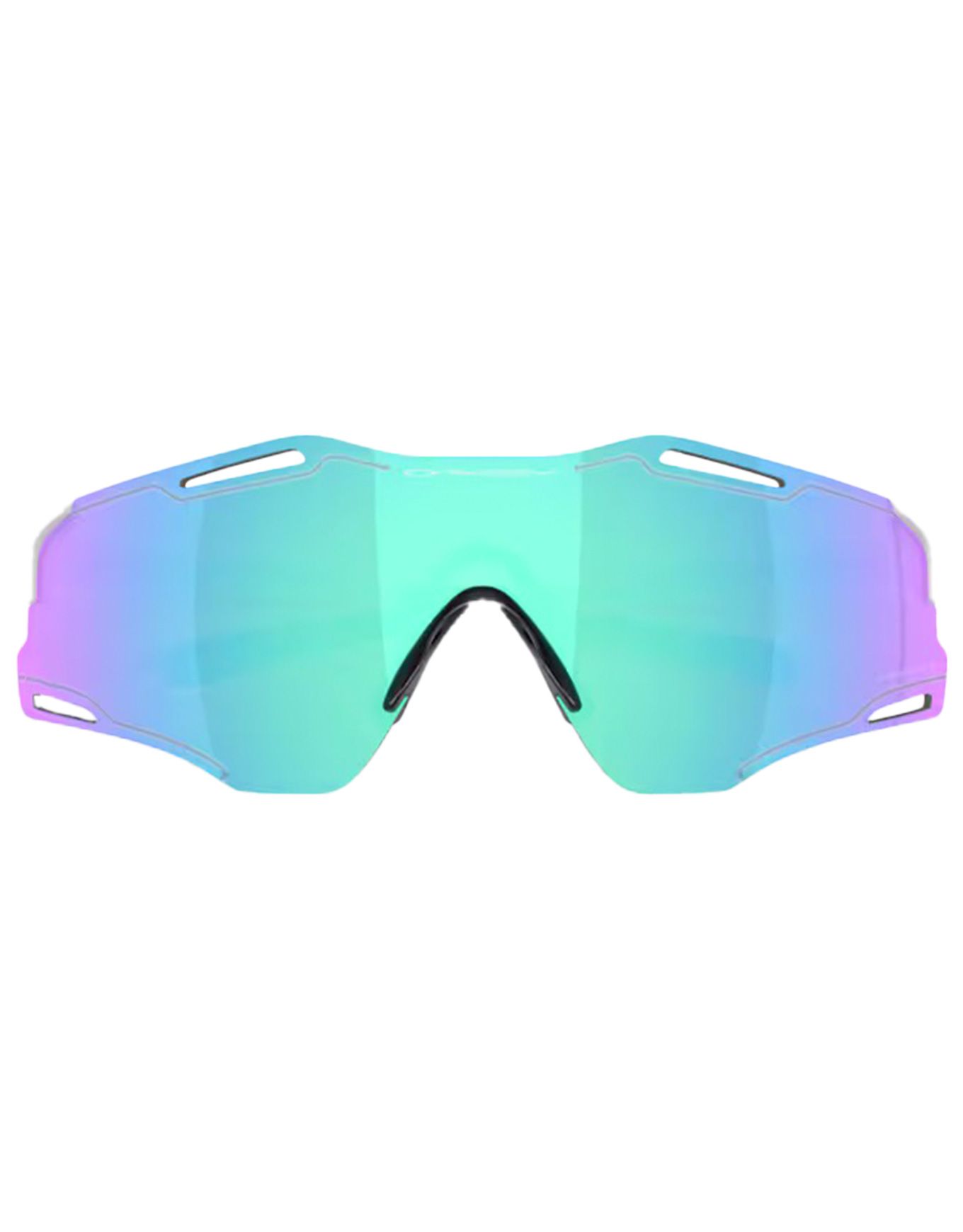Lunettes de soleil Oakley Cybr Zero Polished White Prizm Sapphire : forme couvrante, verres Plutonite catégorie 3, monture O-Matter légère et plaquettes Unobtainium pour un maintien fiable en course ou à vélo.
