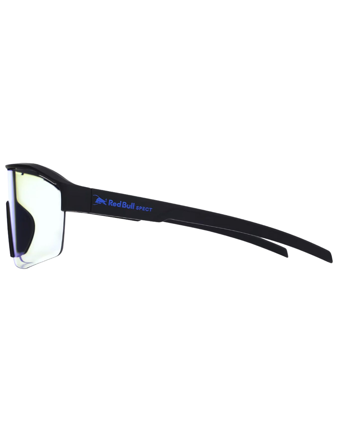 Red Bull Spect Eyewear Dundee Pro Black sont des lunettes de soleil photochromiques cat. 0-2 avec miroir bleu, conçues pour cyclistes et traileurs. Écran Chrom°X adaptatif, monture G850 ricin ultra-légère, branches profilées et design enveloppant pour protection et stabilité.