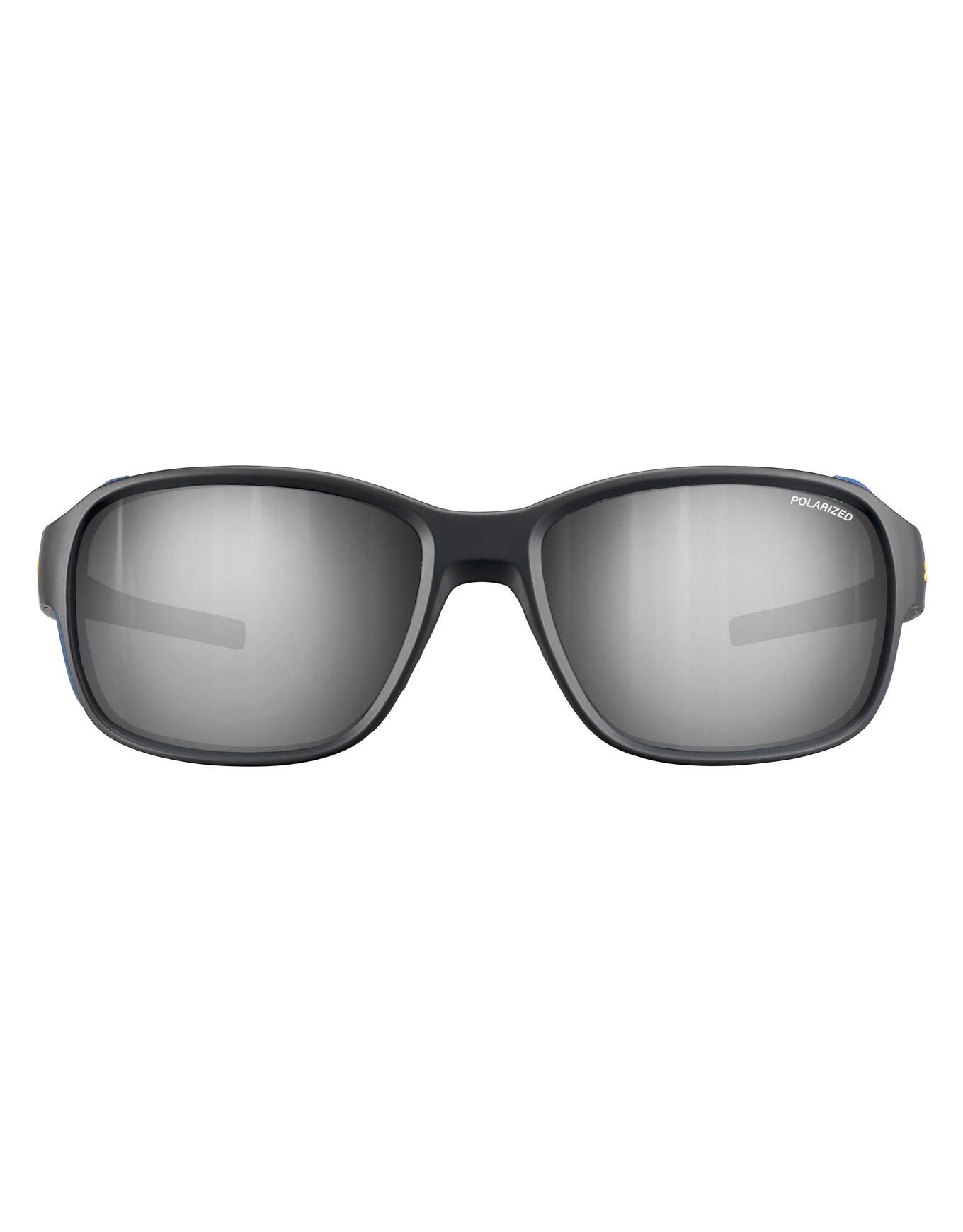 Lunettes de soleil Julbo Monterosa 2 femme, monture noire/bleue/orange avec verres Spectron 3 polarisés, coques latérales amovibles, branches et nez Grip Tech antidérapants, compatibles RX Lab.