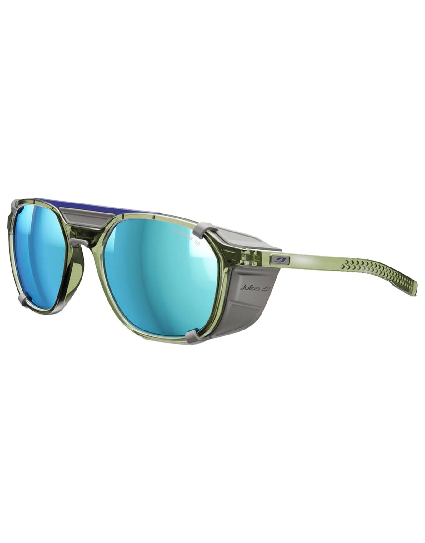 Les lunettes de soleil Julbo Slack Cover Army/Gris Spectron HD 4 Polarized offrent une protection maximale en altitude grâce à leurs verres polarisés catégorie 4 et leurs coques latérales amovibles. Leur design à double pont et les branches galbées assurent maintien et look moderne, tandis que la technologie RX Ready permet l’adaptation optique.