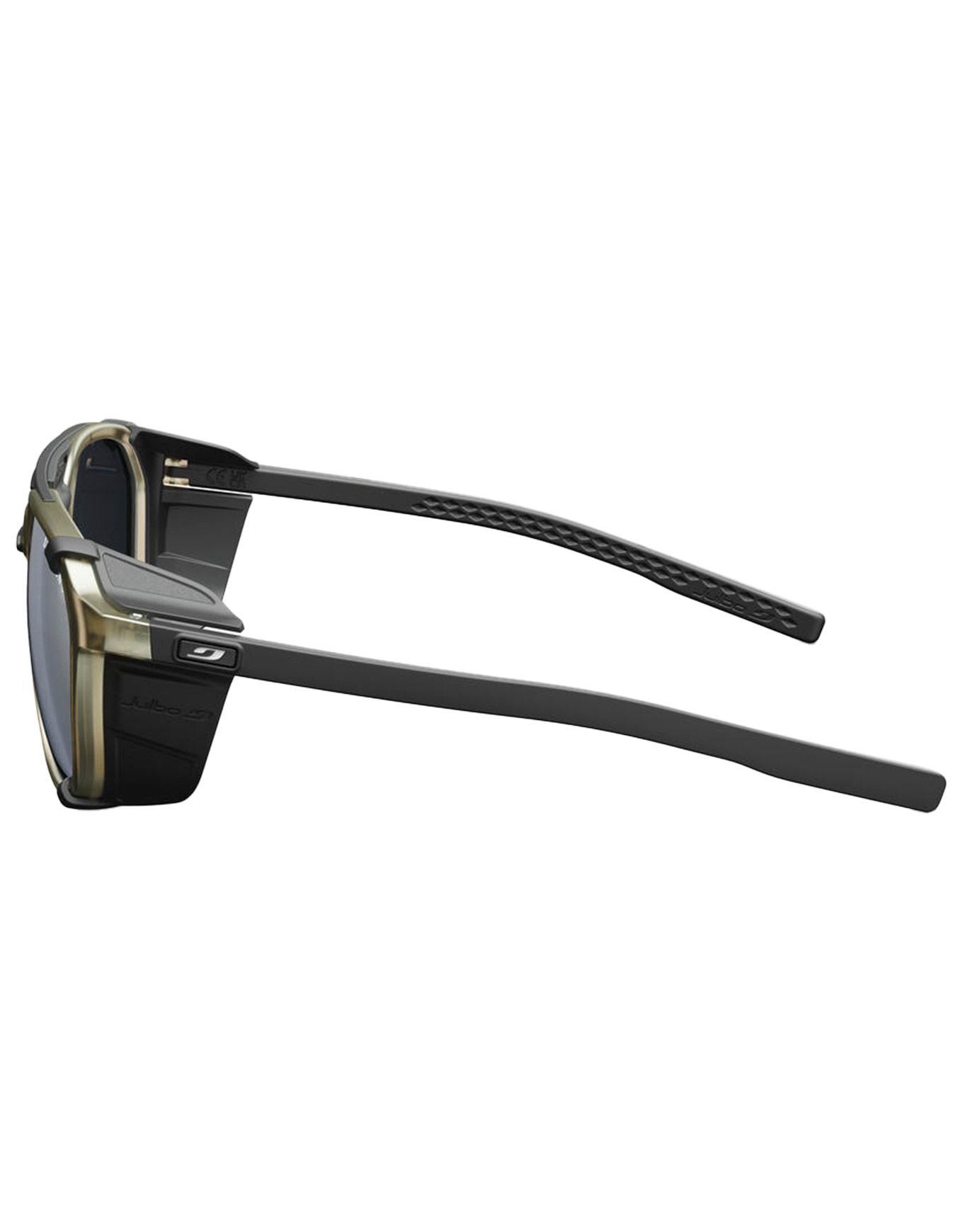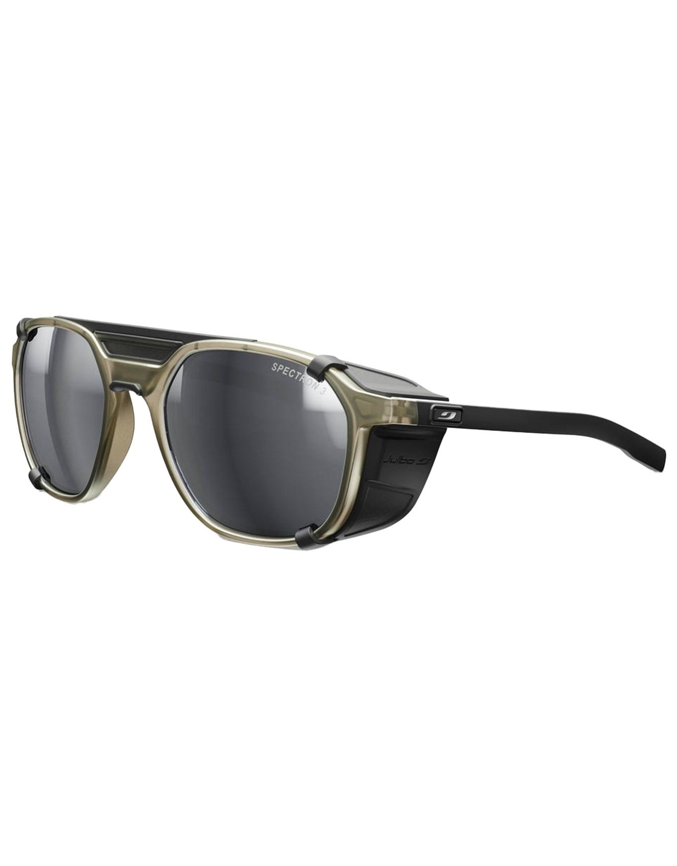 Les lunettes de soleil Julbo Slack Cover Spectron 3, coques amovibles anti-UV intégrées, verres polycarbonate miroir catégorie 3, pont double et branches galbées pour un maintien fiable en haute montagne.